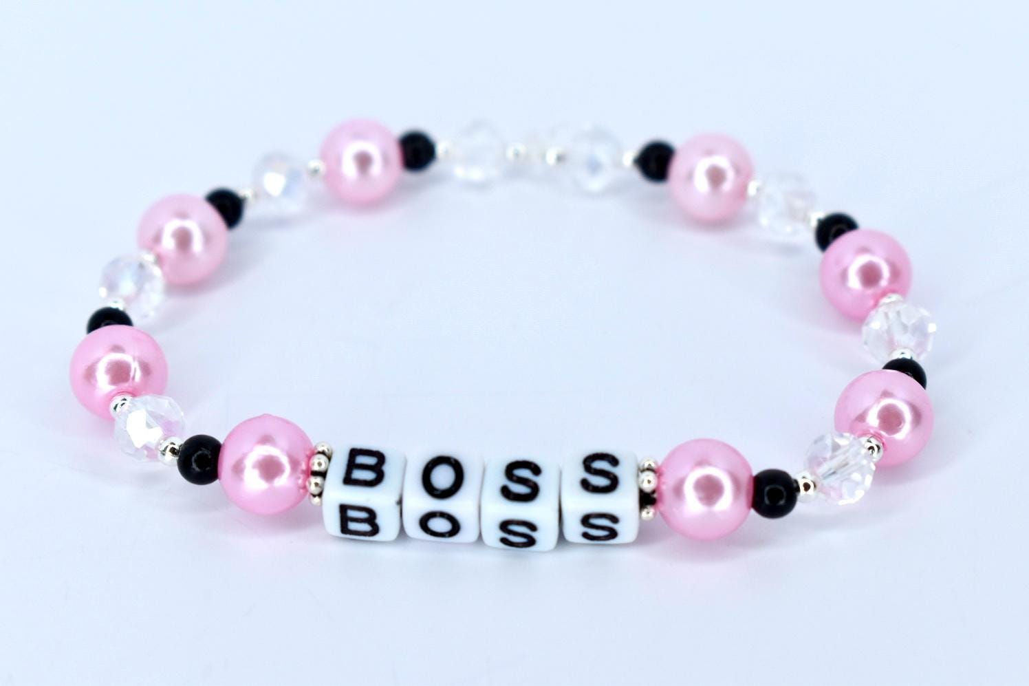 Designed with glossy pink pearl beads, sparkling crystal accents, and bold black details, this bracelet is finished with standout letter beads spelling the word of your choice.