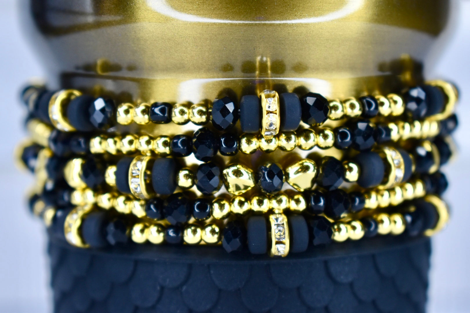Command attention with this opulent bracelet stack! This sophisticated 5-piece collection features rich black beads paired with gleaming gold accents, including metallic gold beads, rhinestone spacers, and elegant moon phase charms that add celestial glamour to your look.