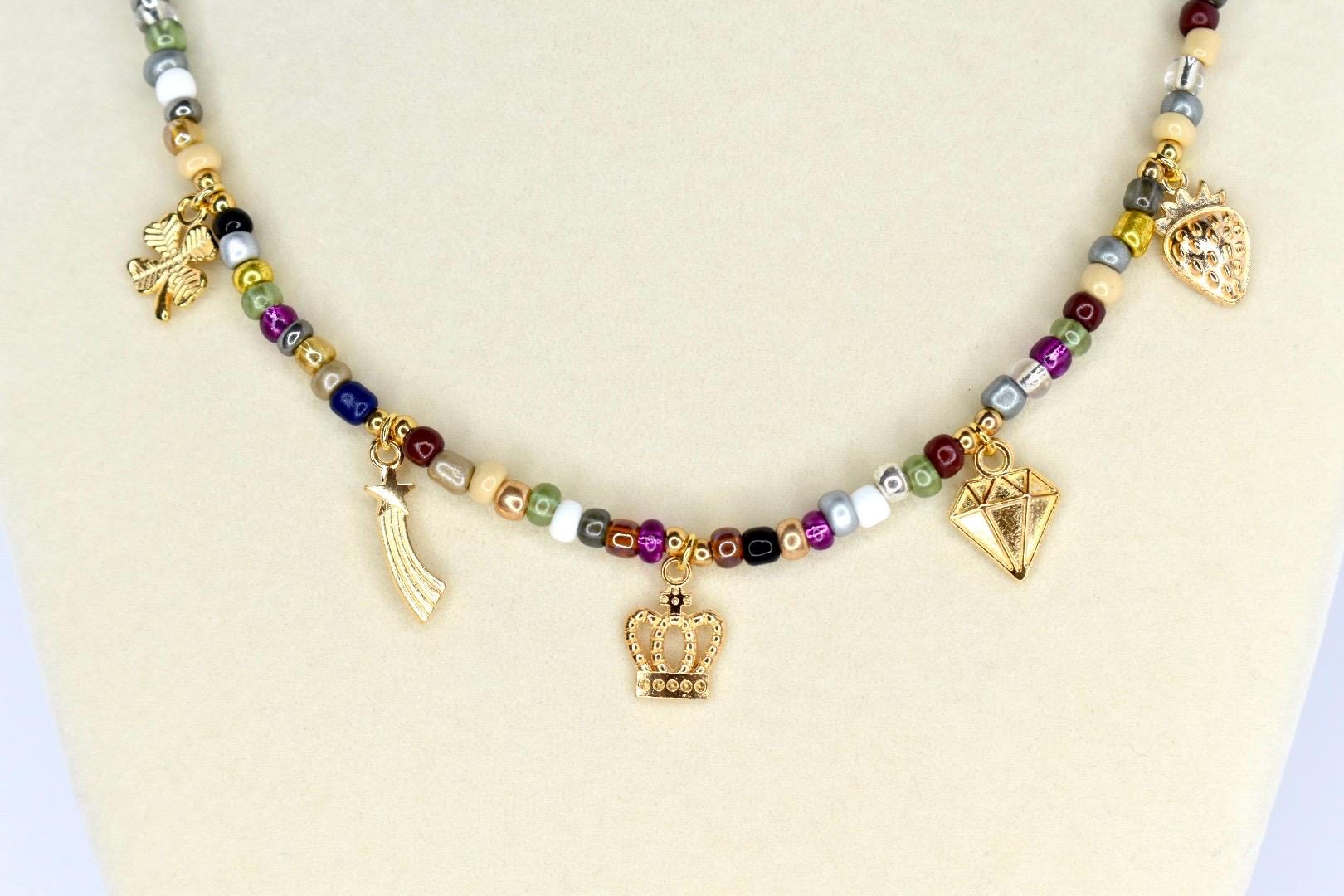 Add a touch of playful elegance to your jewelry collection with this handmade beaded charm necklace. Designed with a colorful mix of seed beads and finished with gold-tone charms, it’s the perfect blend of boho and chic.