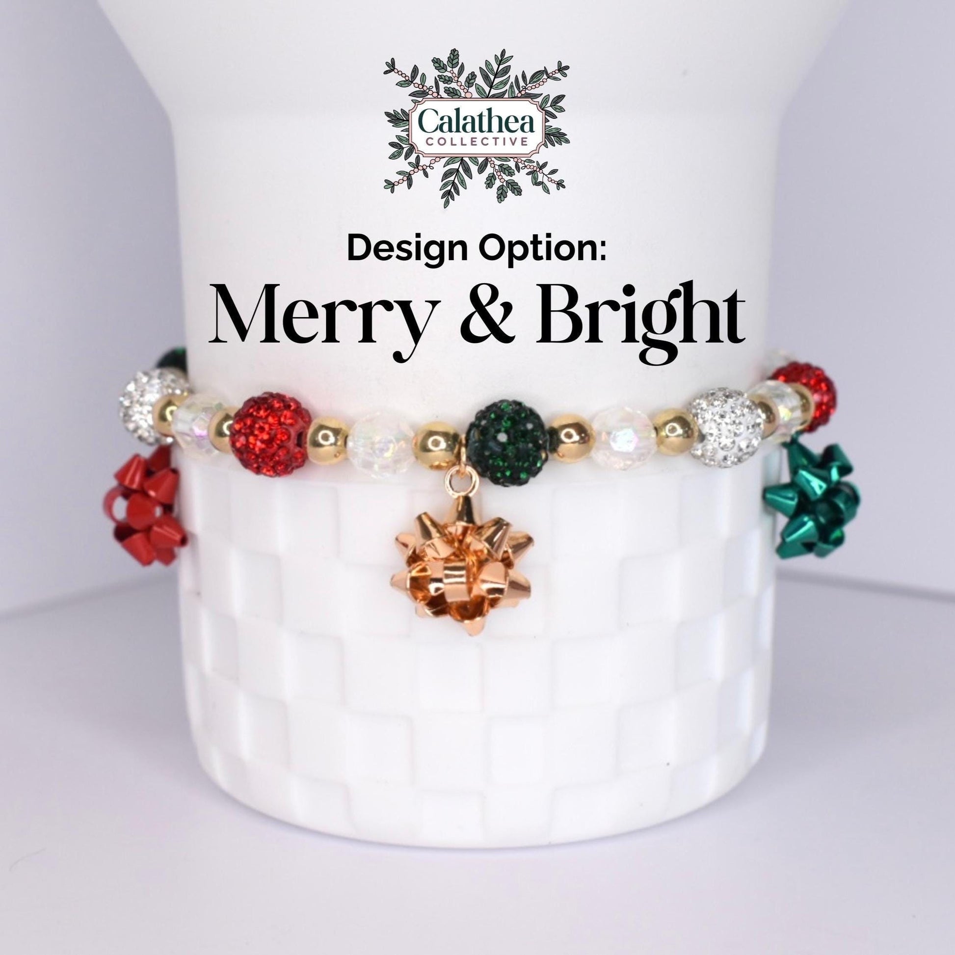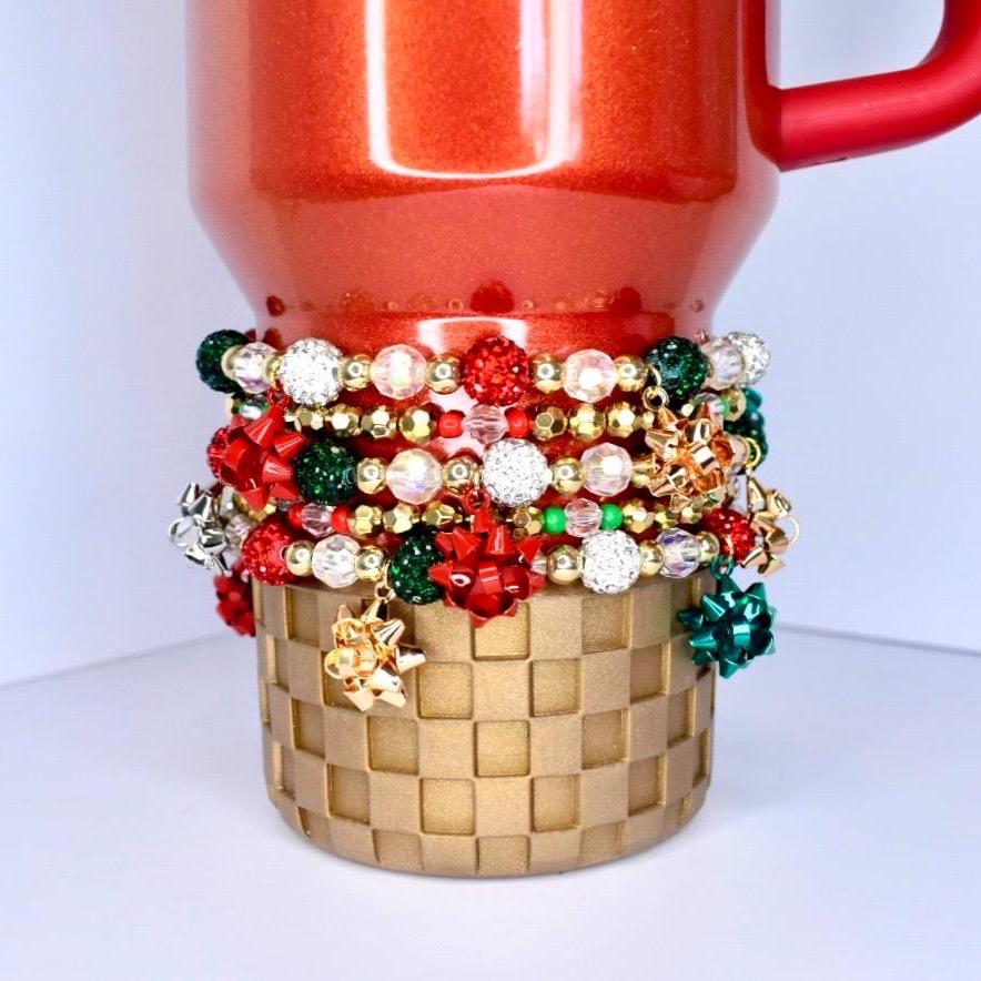 Celebrate the season in style with this Holiday Bracelet Stack—a festive accessory for your tumbler or wrist. Think bright reds, lush greens, glitter accents, and adorable mini gift bow charms. Each bracelet is handcrafted to bring a dash of holiday magic wherever you go.