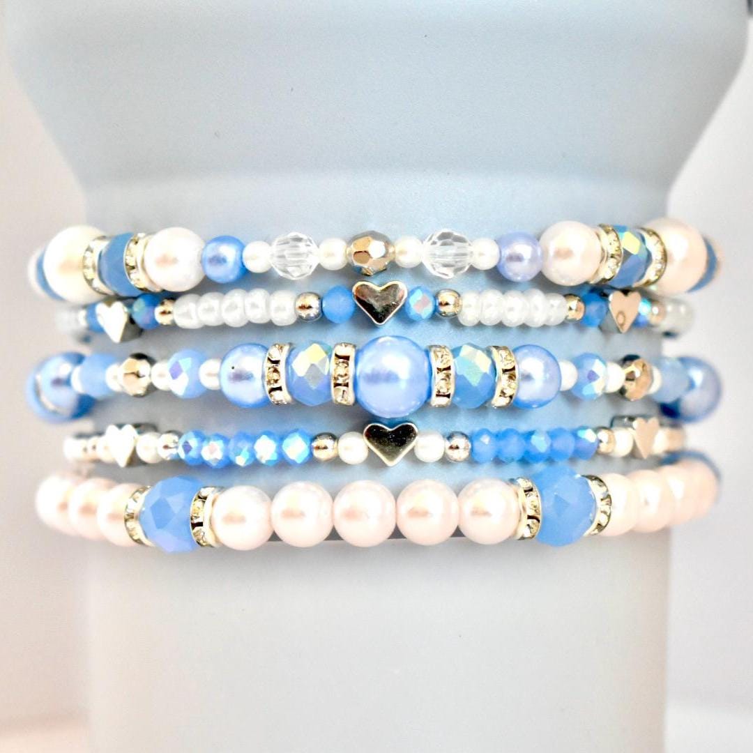 • Blue, pearl white, crystal, and gold tones with heart and spacer details