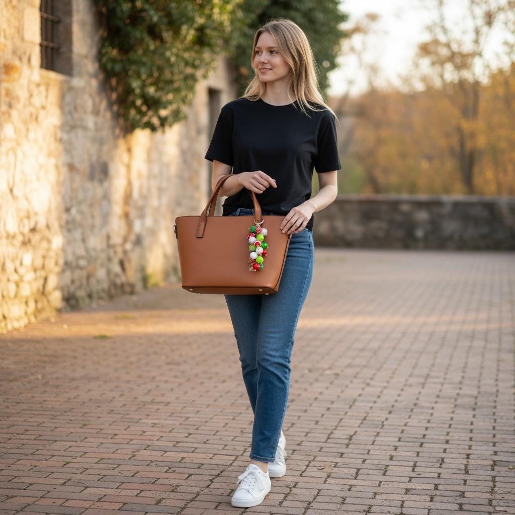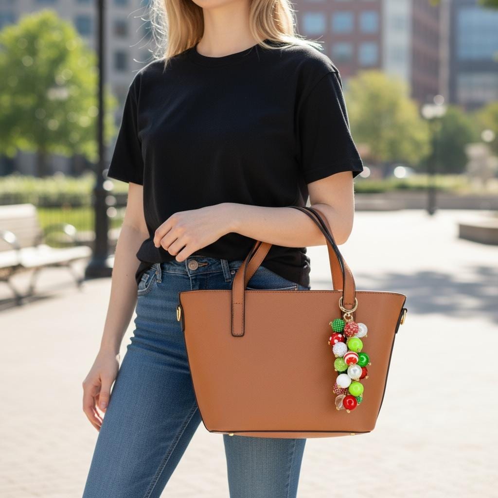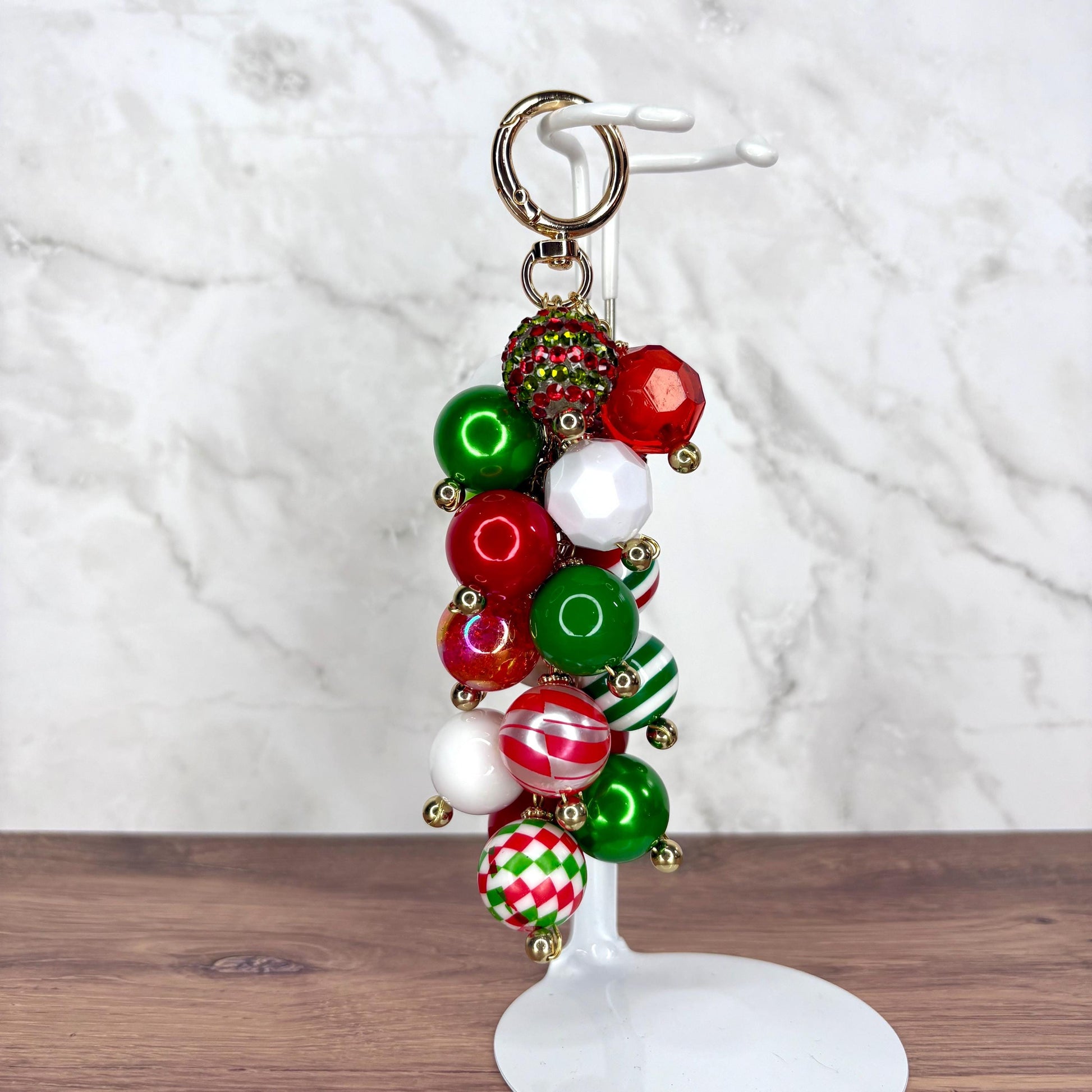 Elevate your holiday style with this stunning Christmas bag charm featuring a delightful cluster of festive beaded ornaments! This eye-catching accessory combines traditional red, green, and white holiday colors with elegant metallic accents, creating the perfect seasonal statement piece.