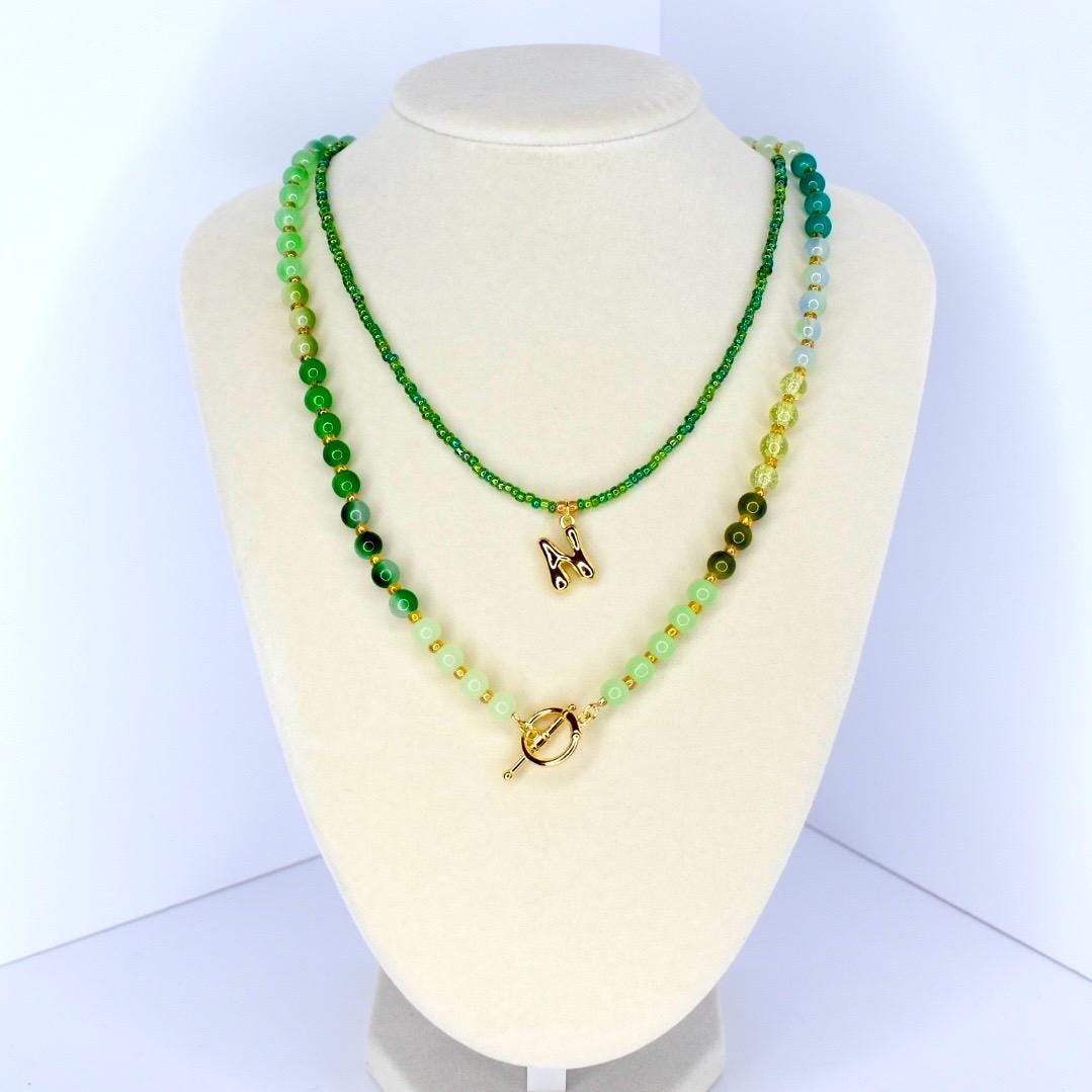 The longer necklace showcases a beautiful gradient of green tones from deep emerald to soft mint and pale yellow-green, finished with a gold toggle clasp. The shorter layering piece features vibrant emerald green seed beads with your choice of gold initial charm. Layer them together for a statement look or wear each piece individually!