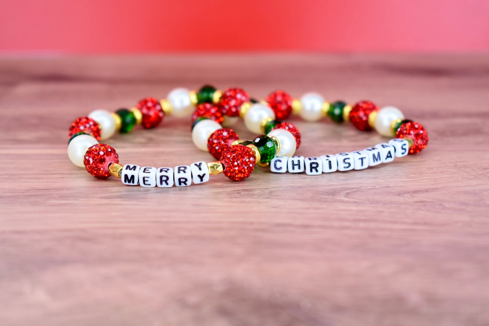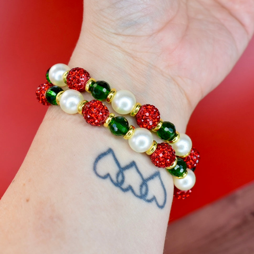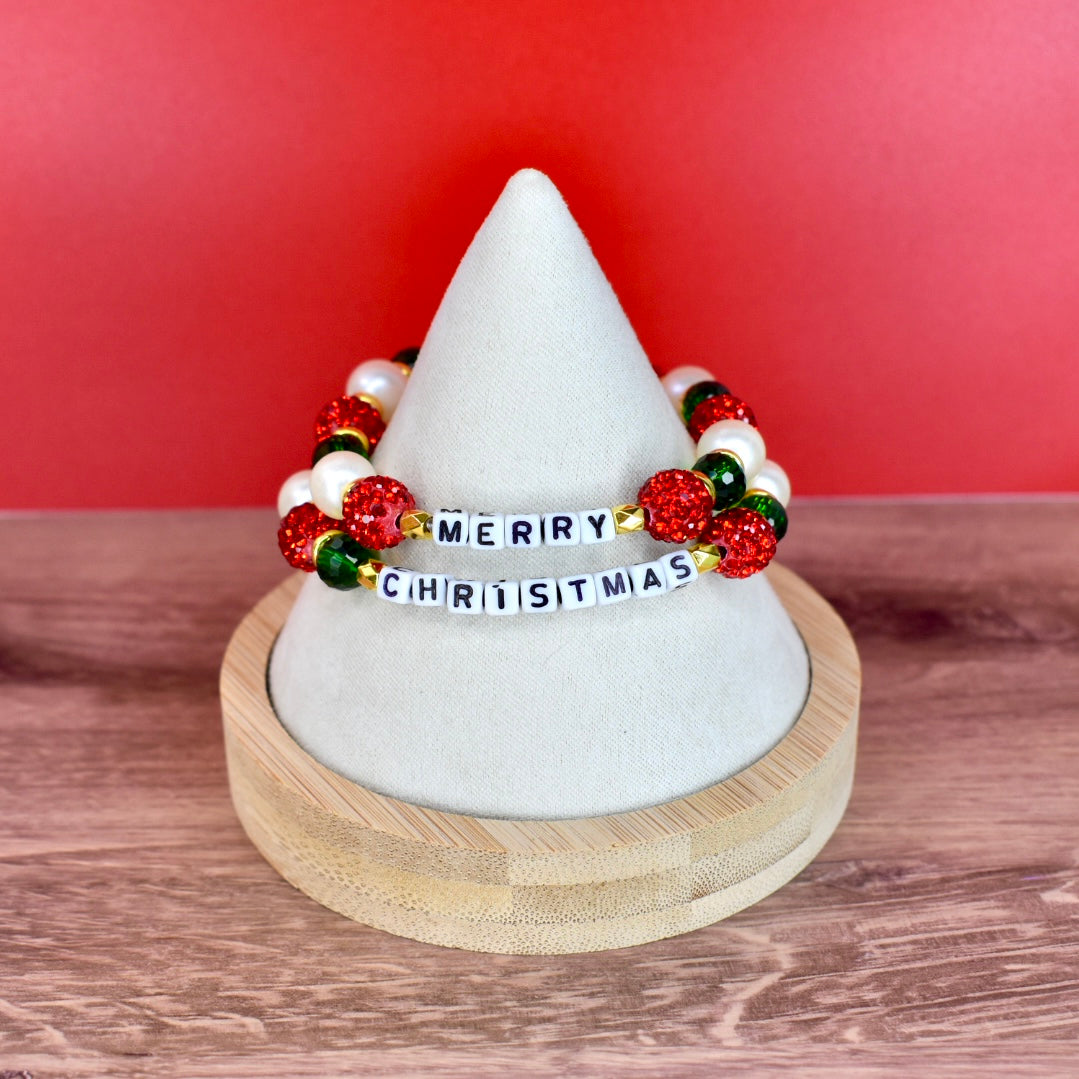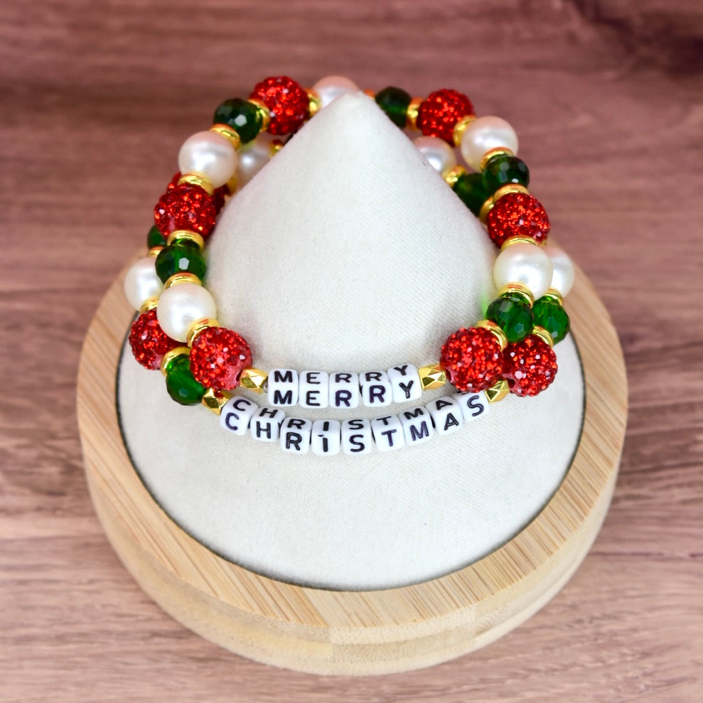 Each bracelet showcases its own festive pattern with sparkling red rhinestone pave balls, lustrous white pearl beads, glossy green glass beads, and gleaming gold spacers. The letter beads spell out the joyful message while the coordinating beads create a complete holiday look perfect for celebrating the season!