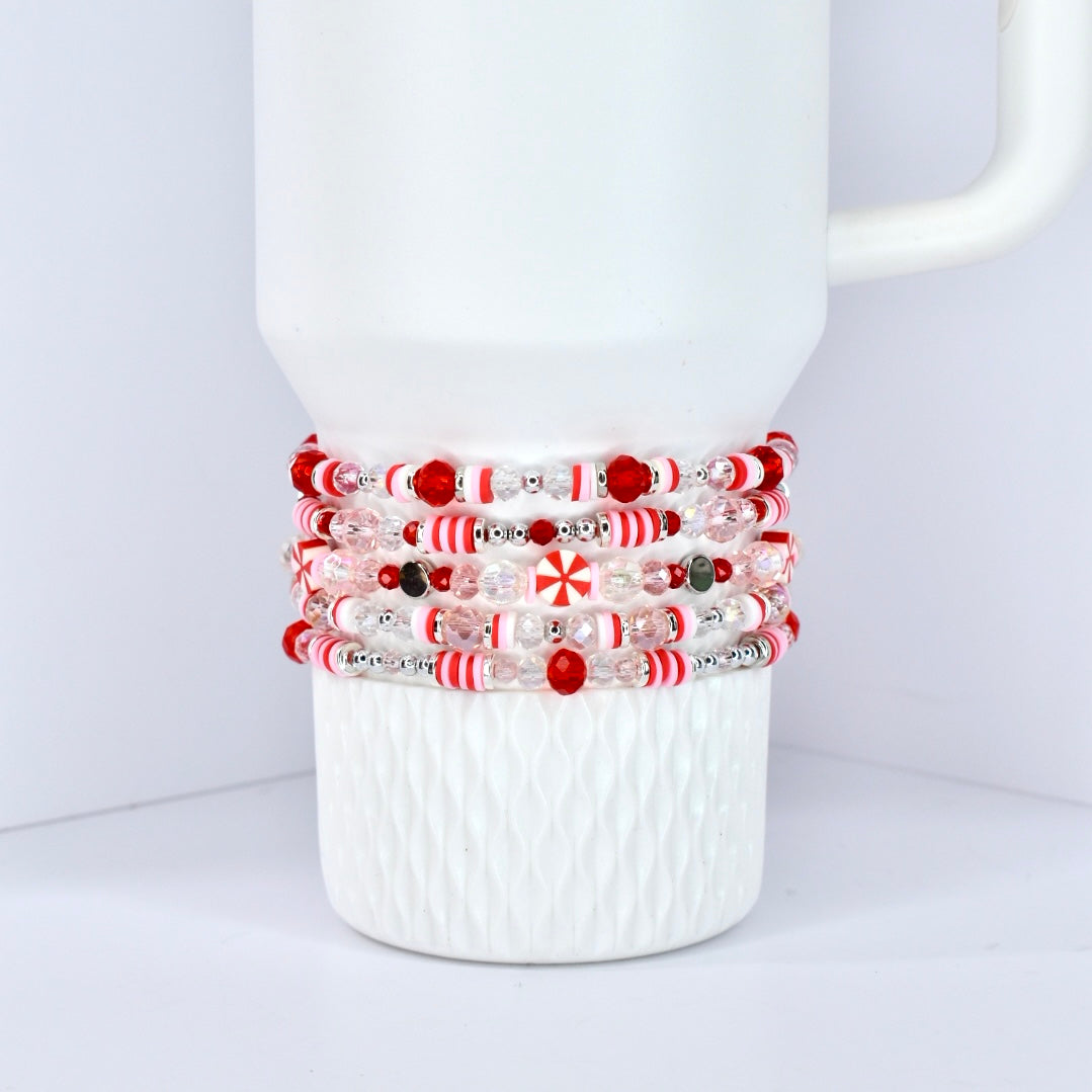 These delightful bracelets are sold individually, letting you build your own candy-inspired stack. Each bracelet combines the sweetness of strawberry pink with classic peppermint stripes for a playful twist on holiday style.