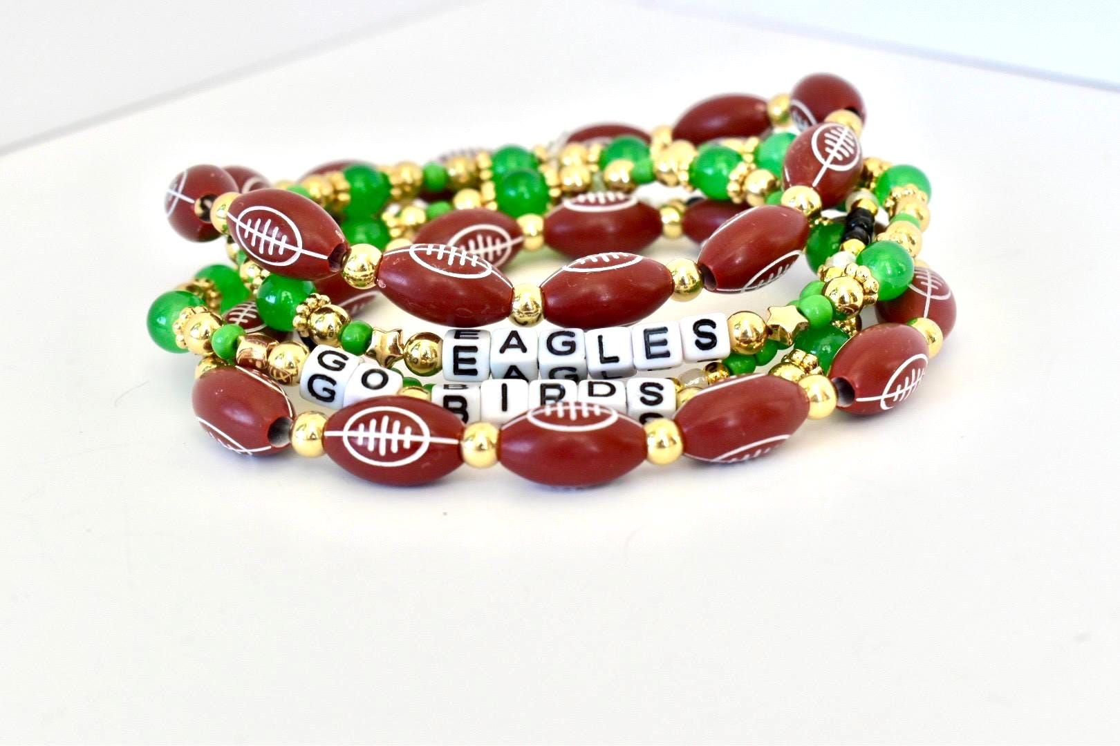 Show off your Philly pride with this bold and spirited Eagles bracelet stack! Each bracelet in this stack features high-quality beads in classic Eagles green, black, white, and gold, with fun football accents and letter beads. Whether you’re tailgating, watching the game at home, or gifting to a fellow fan, this stack is a total touchdown.