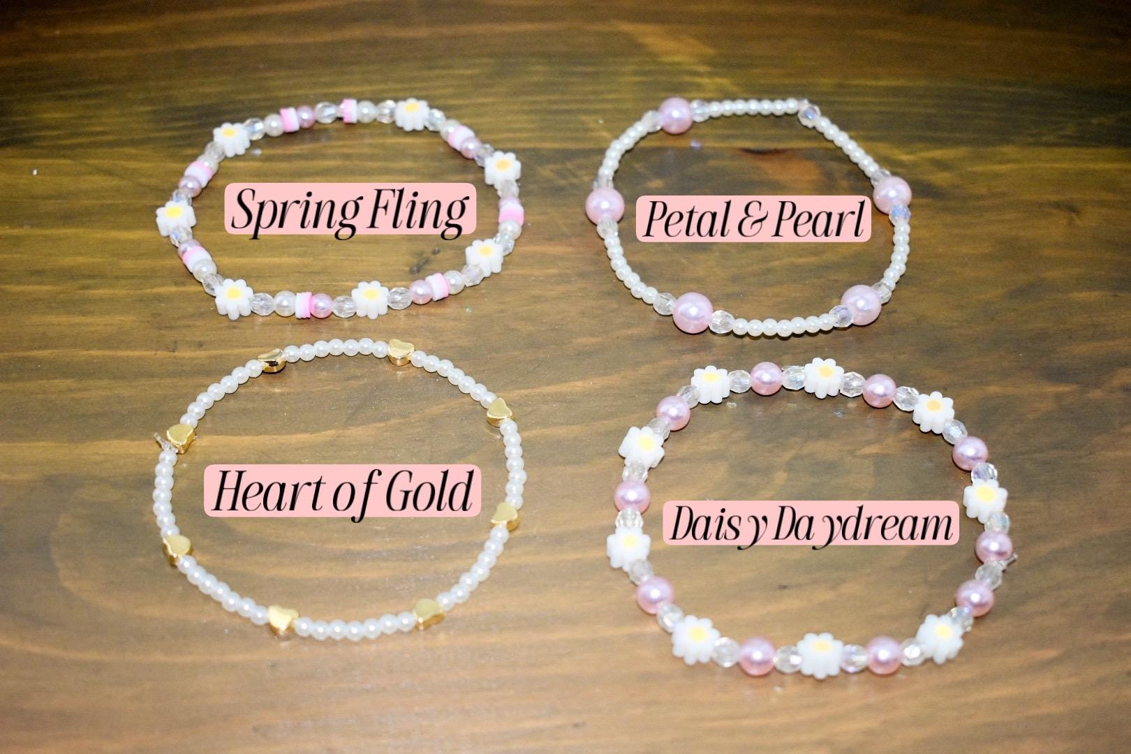 Pink daisy beaded bracelets featuring pastel pink, cream, and gold-toned beads with delicate flower and heart charms. Choose from four curated styles—Daisy Daydream, Petal & Pearl, Spring Fling, or Heart of Gold—or get the complete set. Each bracelet is handcrafted with quality plastic and glass beads on stretchy jewelry string with a tie closure.