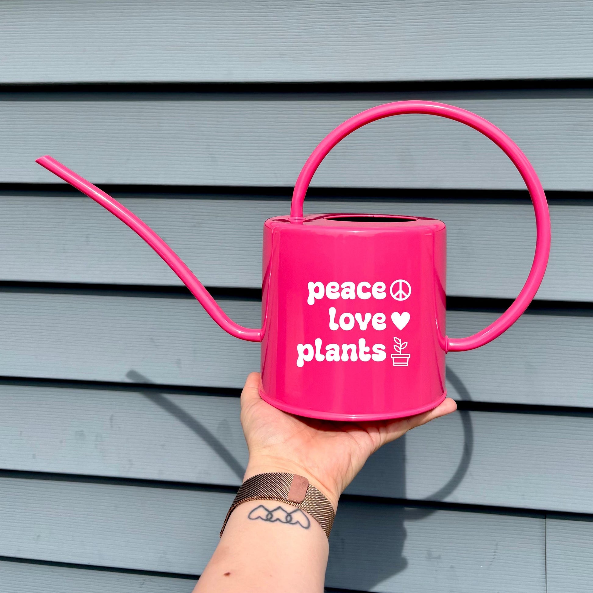 Spread good vibes and greenery with the Peace Love Plants Watering Can. This bold and bright pink metal can is as joyful as it is functional, featuring a playful white design with peace, heart, and plant icons stacked beside the words: peace, love, plants. It’s the perfect companion for plant parents who believe that a little positivity goes a long way.