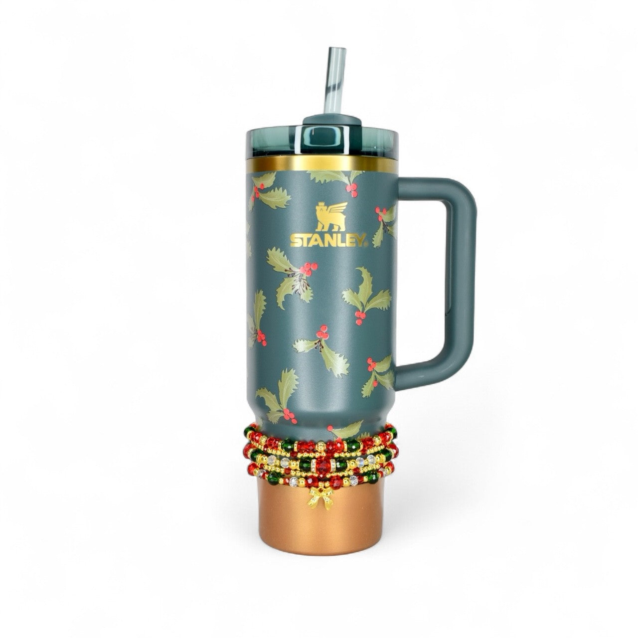 Inspired by classic holiday botanicals like holly and evergreens, each bracelet in this stack features its own unique pattern of faceted crystals and glass beads. The centerpiece bracelet showcases a sparkling red crystal with rhinestone accents, while the golden bow charm adds movement and elegance to your favorite tumbler or wrist.