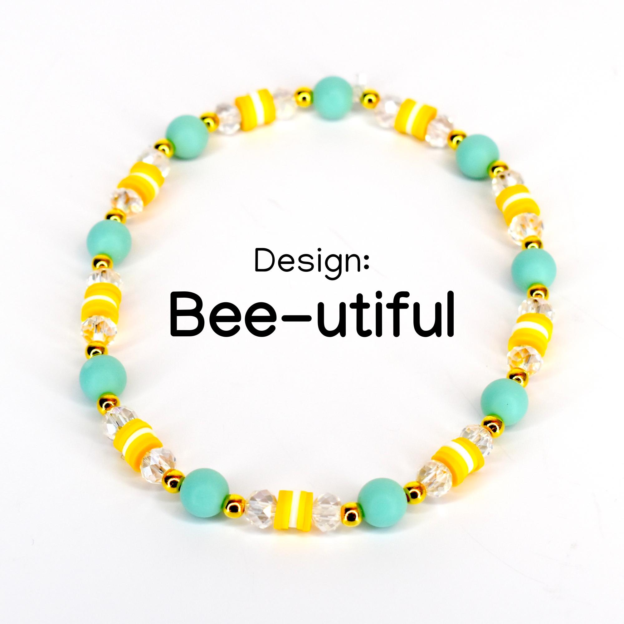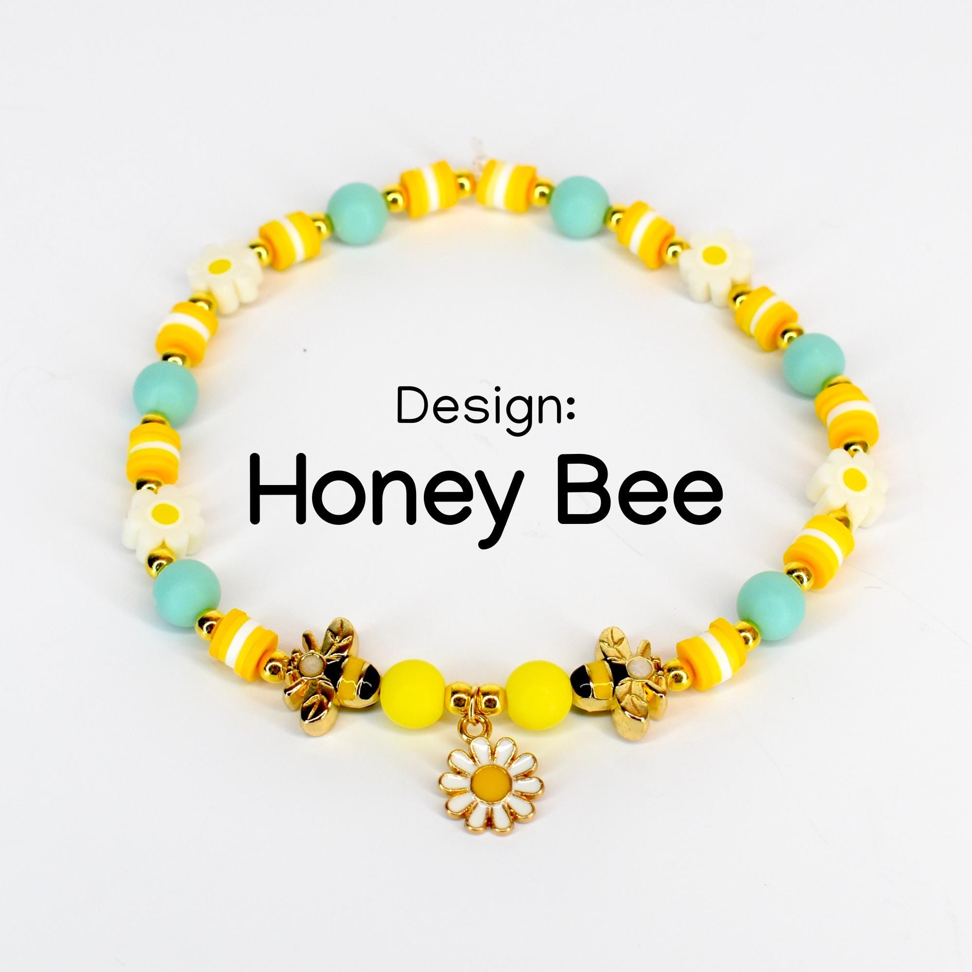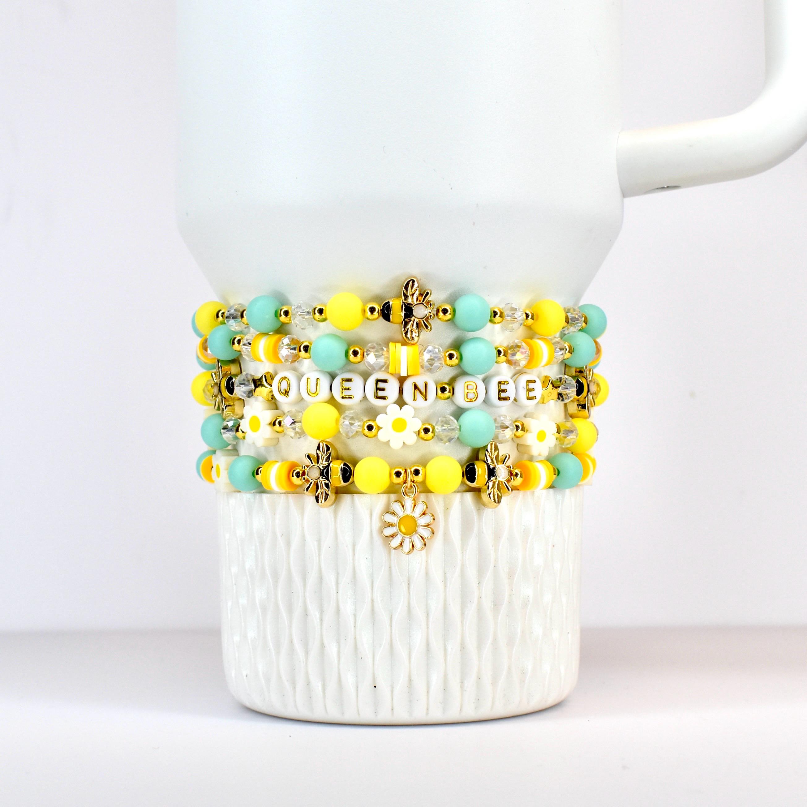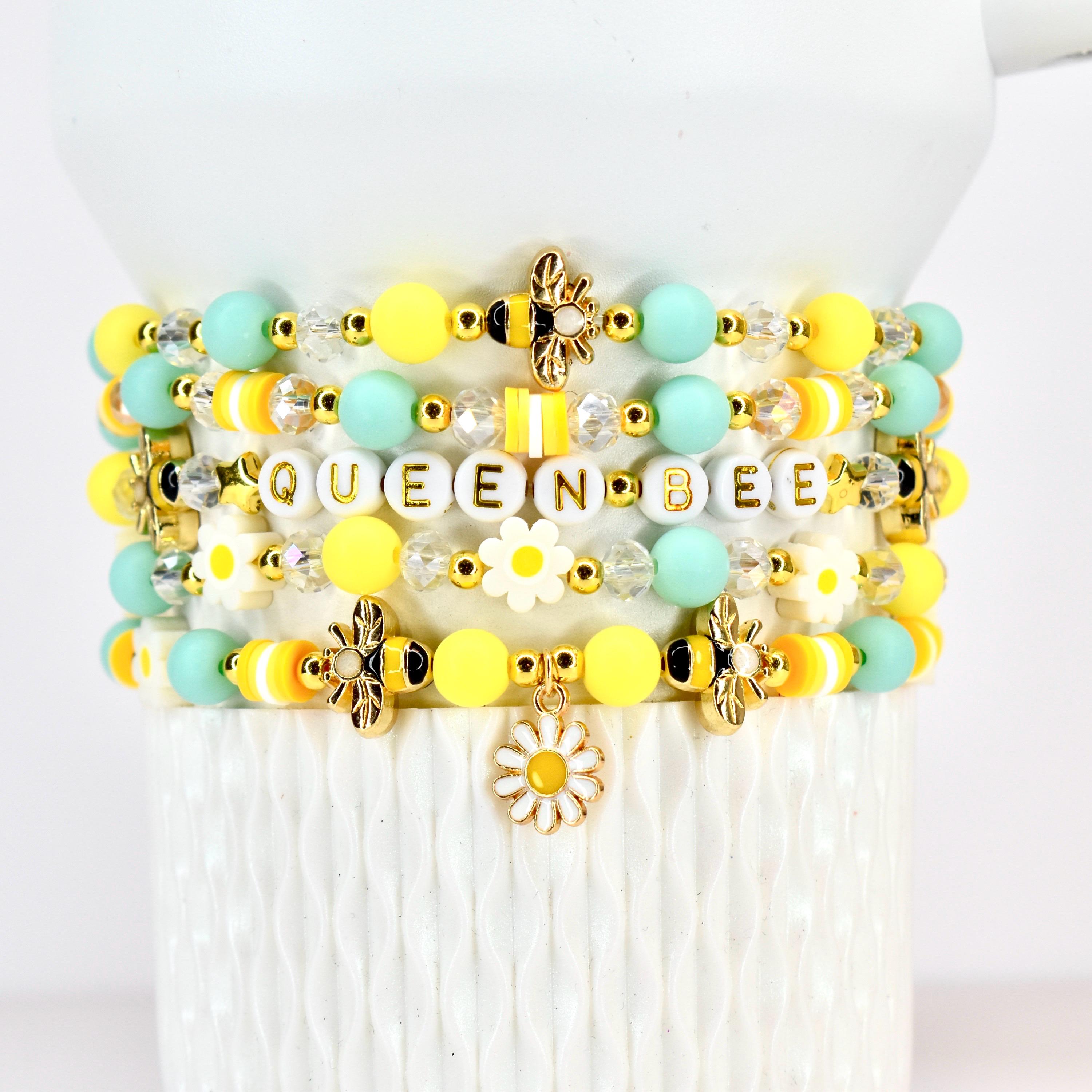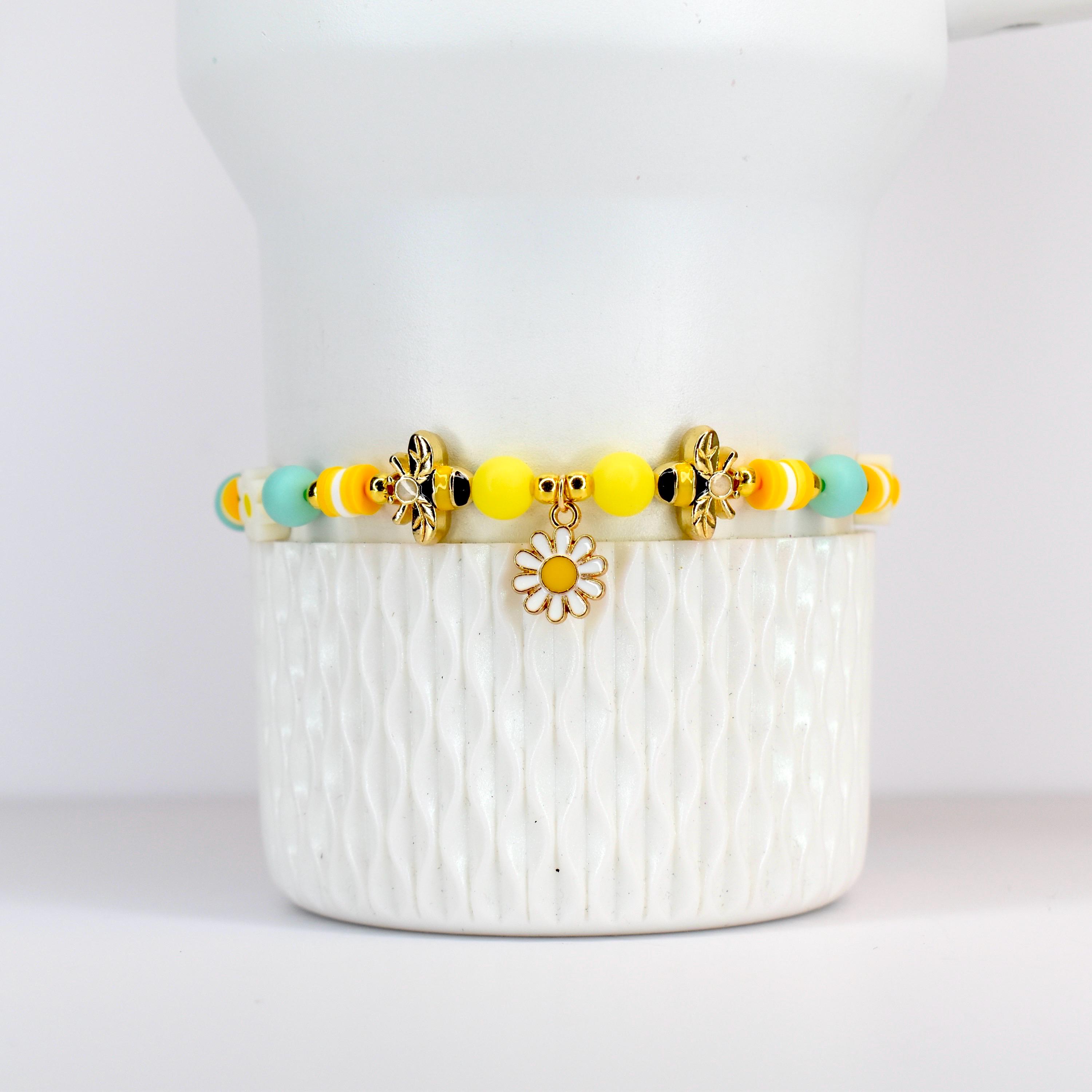 Celebrate spring style with this adorable personalized bracelet stack! This cheerful 5-piece set features sunny yellow and mint green beads accented with sparkling crystals, gold-tone details, and sweet daisy and bee charms. The customizable name bracelet makes this stack extra special and uniquely yours!