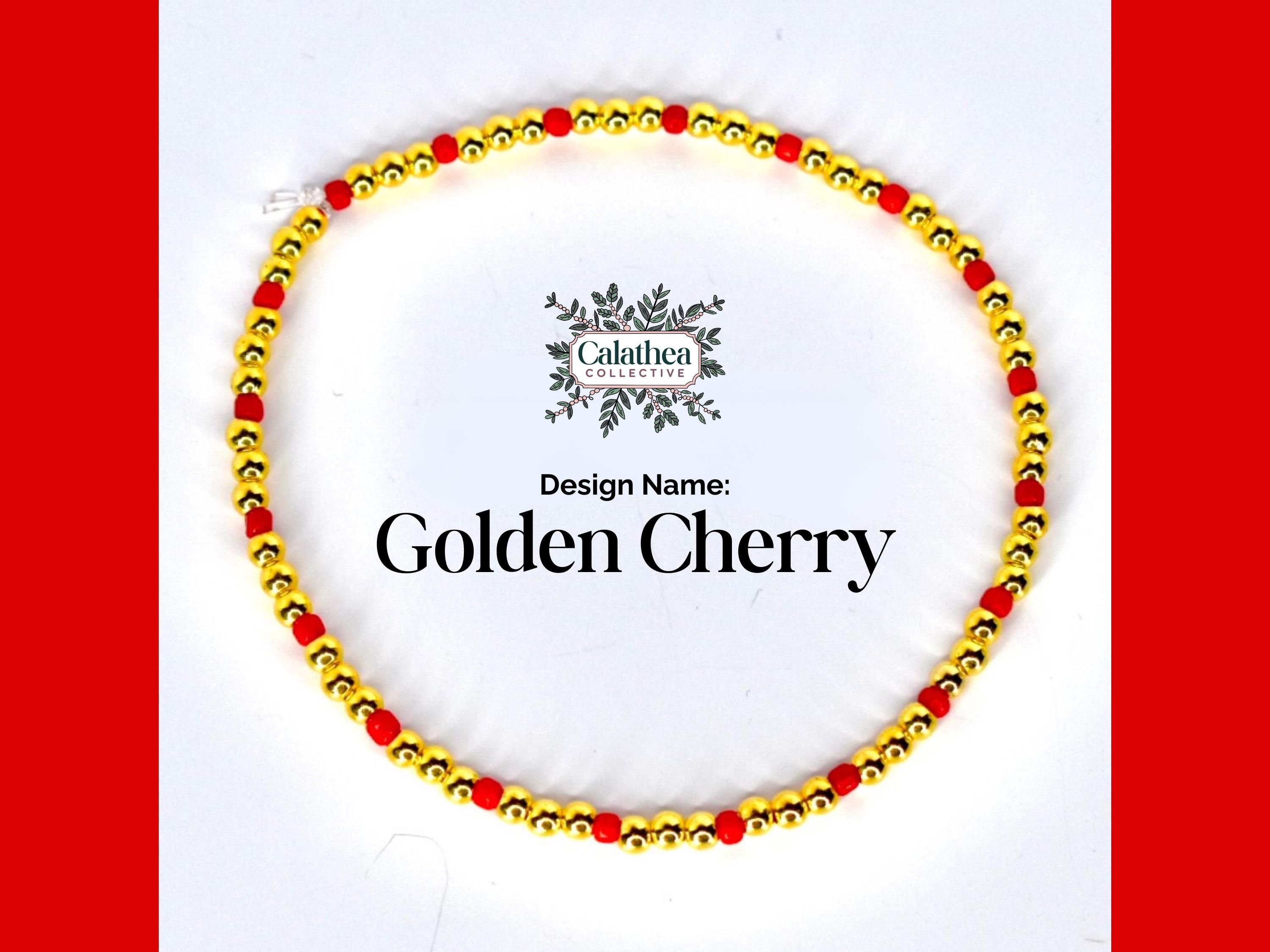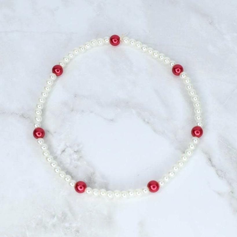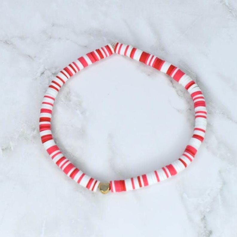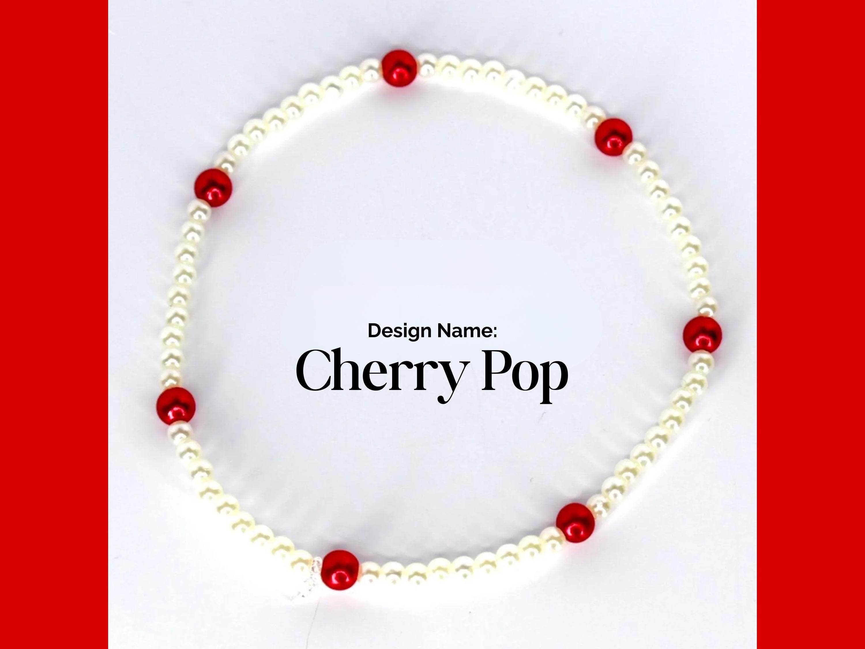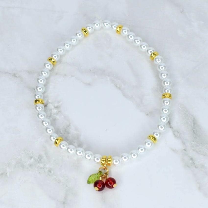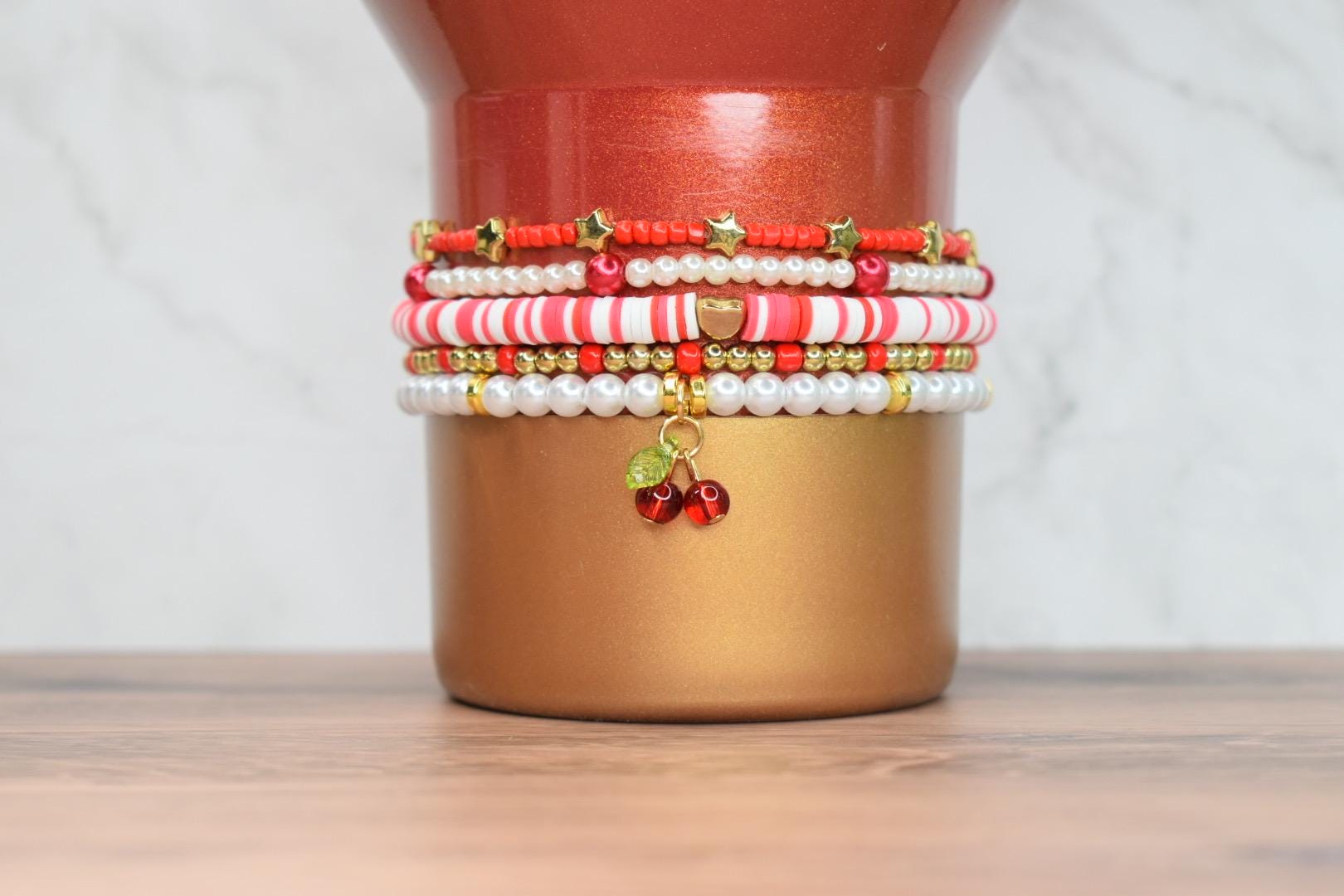 Life is a bowl of cherries with this adorable red and white bracelet collection! This sweet 5-piece collection features playful candy cane stripes, gold star accents, cream pearls, and an adorable cherry charm that's simply irresistible.
