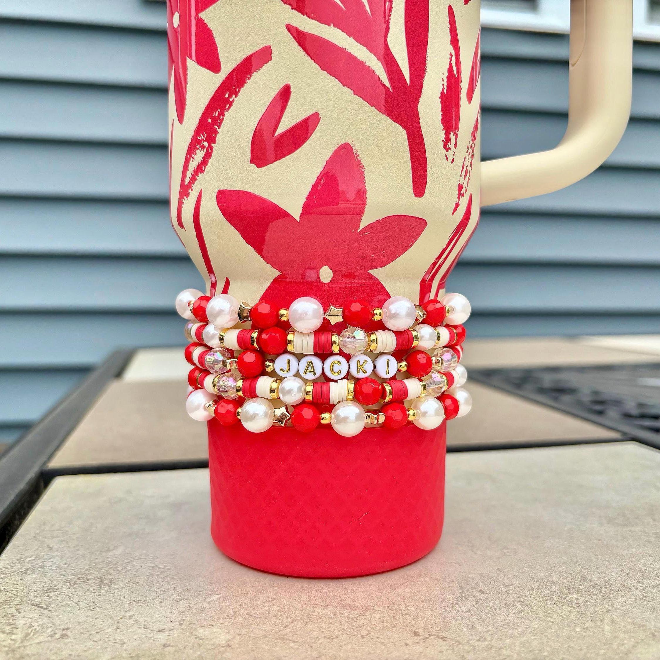 Brighten your tumbler with this custom red and cream bracelet set perfect for most cup holder-friendly tumblers! Featuring vibrant red beads, creamy pearl accents, sparkling clear crystals, gold details, and the option for custom name personalization, this handmade stack is the ultimate accessory for anyone who loves tropical vibes and bold floral style.