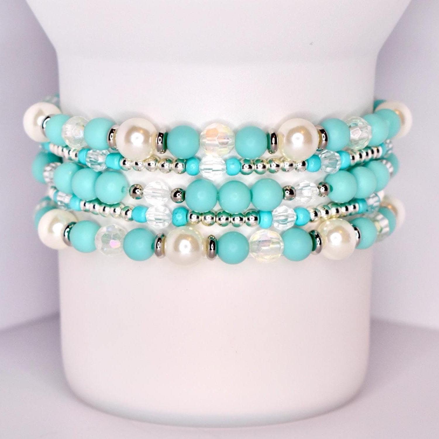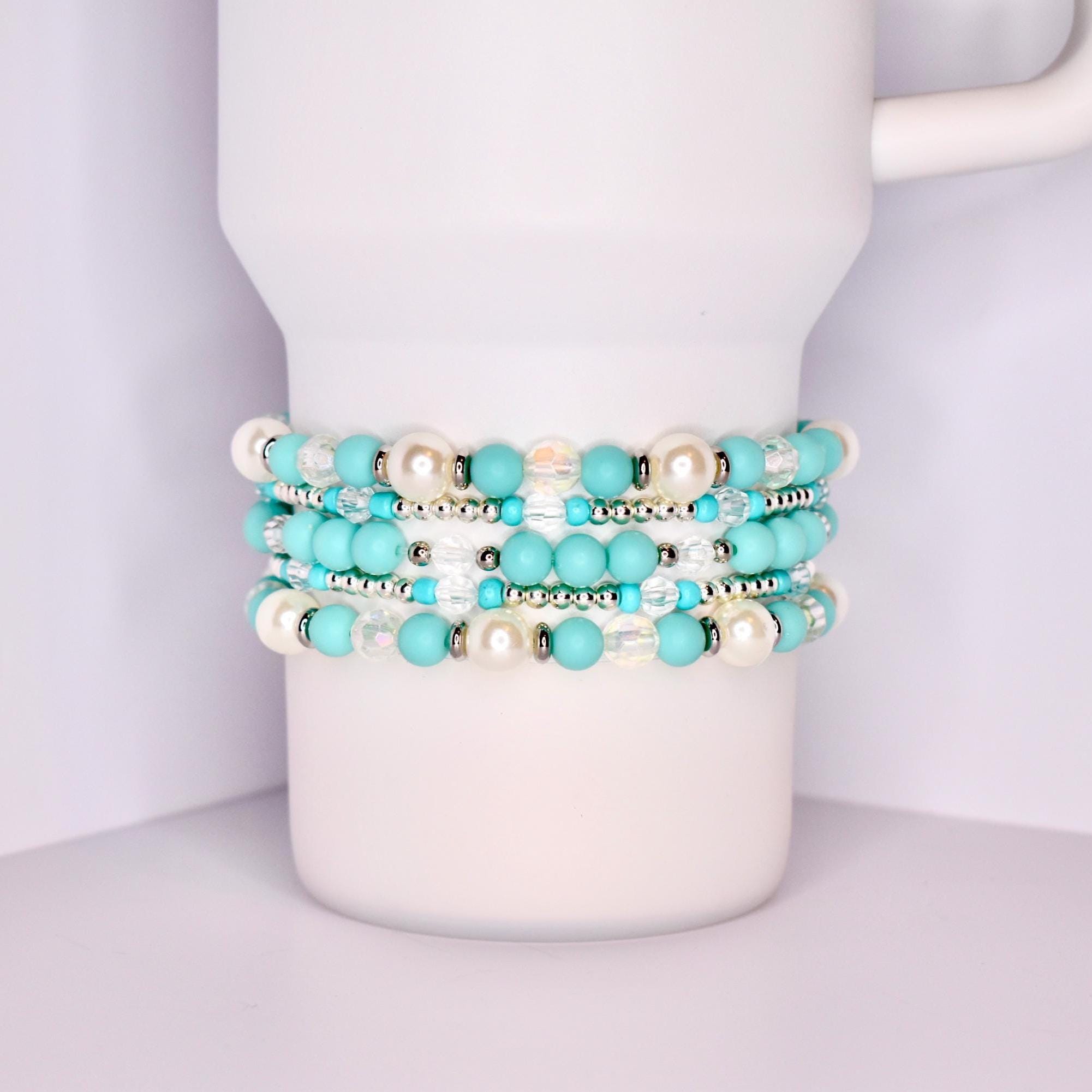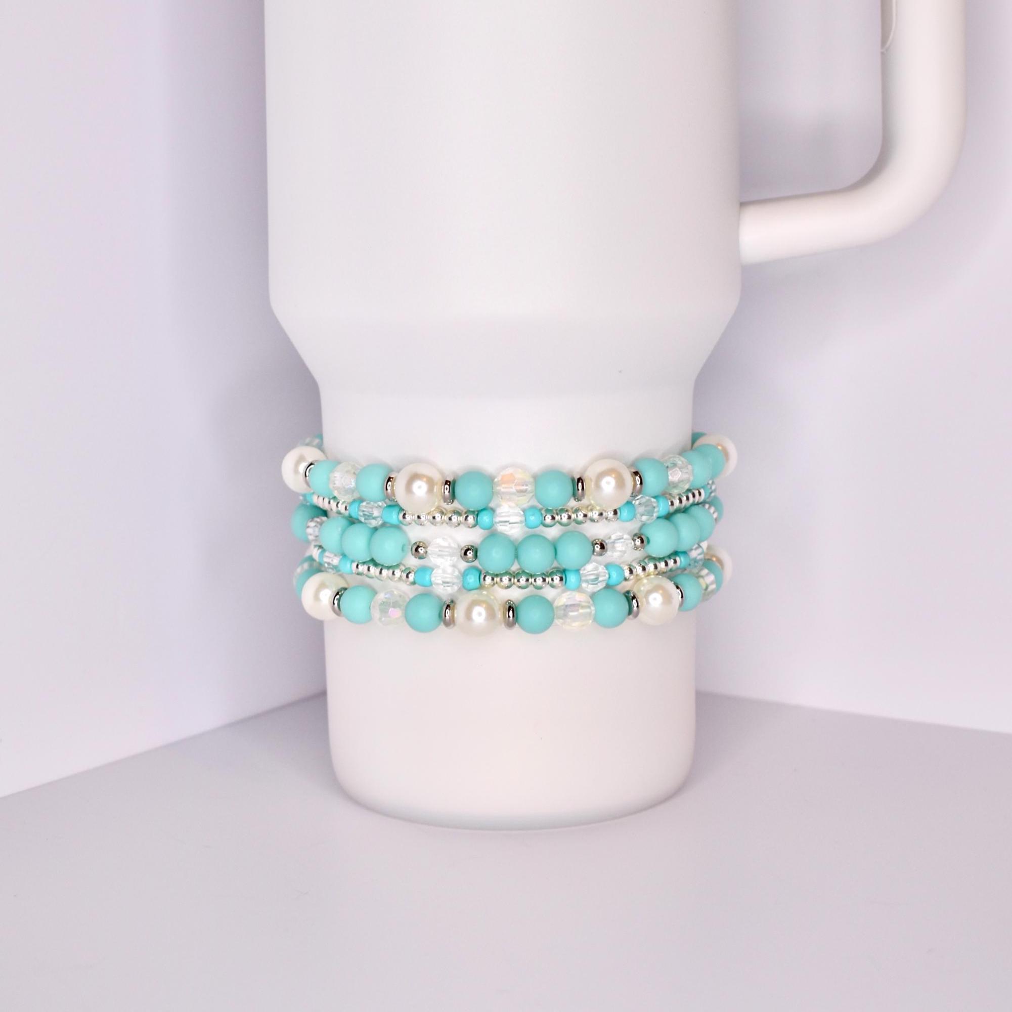 Bring classic elegance to your tumbler or wrist with this beautiful blue, pearl, silver, and sparkly bracelet set! Featuring delicate mint blue beads, glossy white pearls, and shimmering crystal accents, this handmade stack creates a dreamy, polished look.