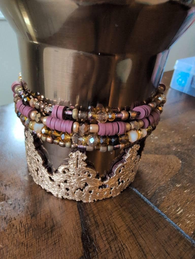 Each bracelet features its own unique combination of finishes and textures, from gleaming metallic bronze to faceted crystals that catch the light, striped mauve heishi beads, and shimmering copper seed beads. The warm color palette creates a cohesive, luxe look perfect for fall or any time you want to shine.