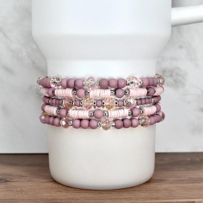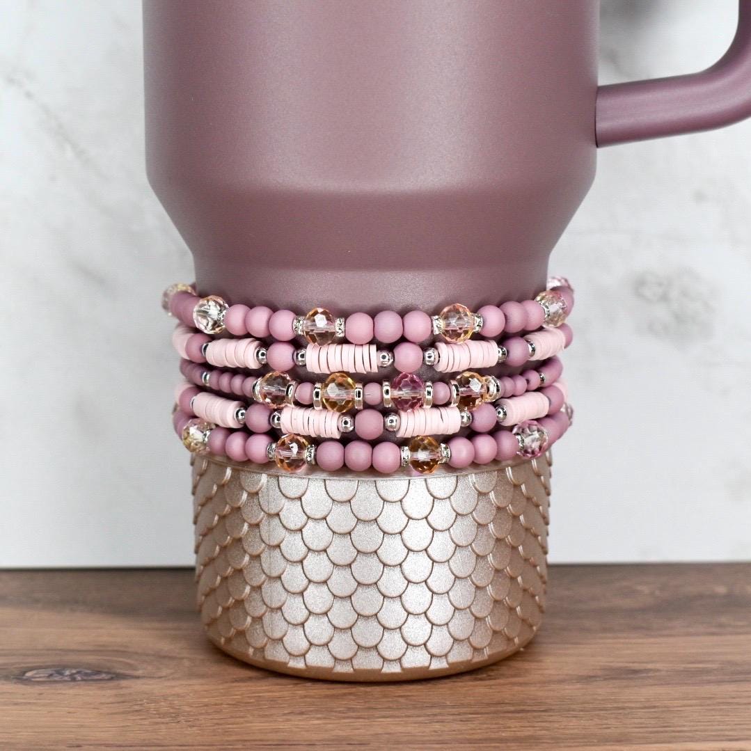 Add a touch of soft glamour with this dreamy blush bracelet. Featuring a delicate mix of matte mauve beads, pale pink accents, and shimmering rhinestone spacers, this piece blends feminine charm with subtle sparkle. Wear it as a bracelet or slide it onto your tumbler for a chic, personalized touch.