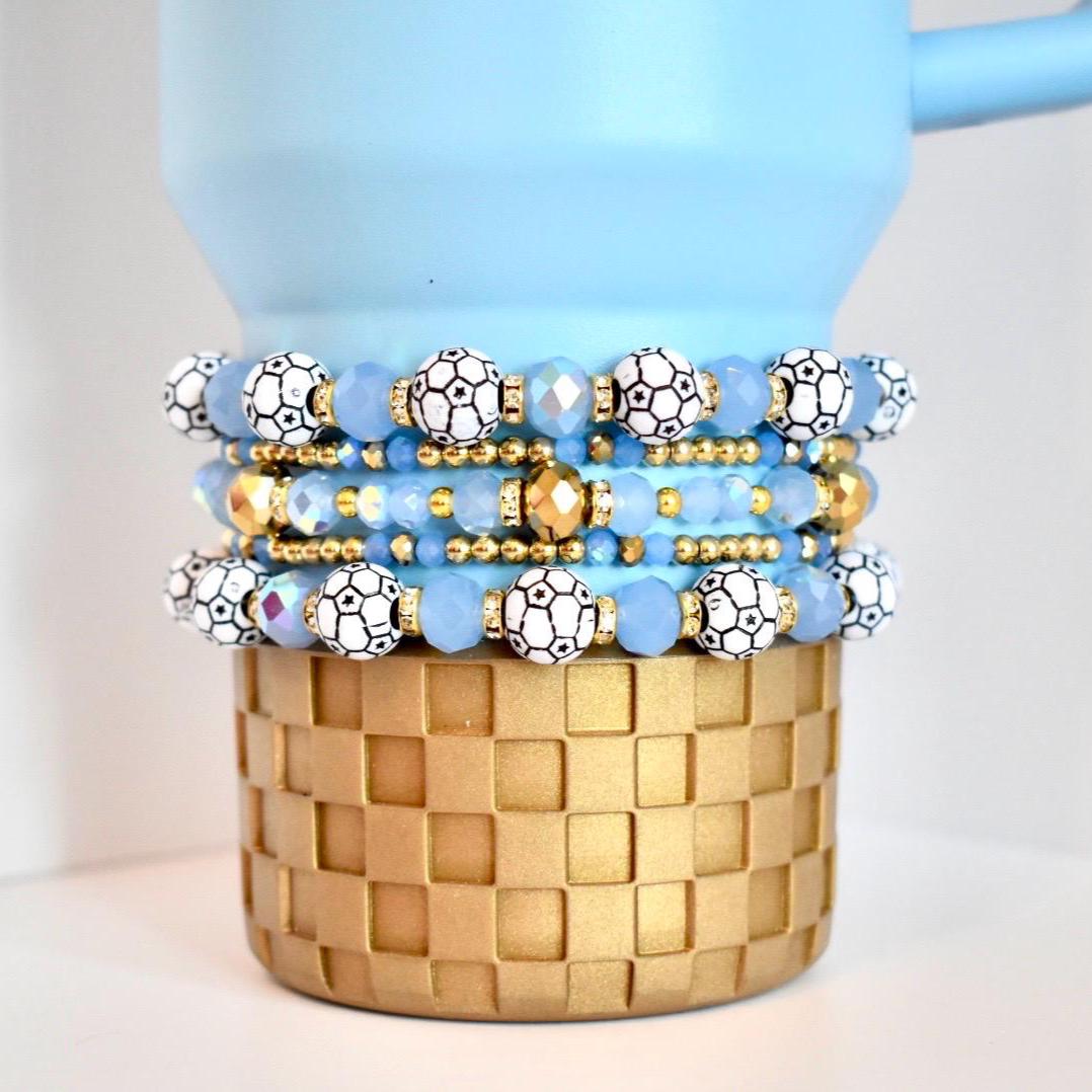Score style points with this chic soccer-themed bracelet stack! This eye-catching 5-piece set combines sky blue beads with luxe gold accents and fun soccer ball-patterned beads, creating a look that's both sporty and sophisticated.