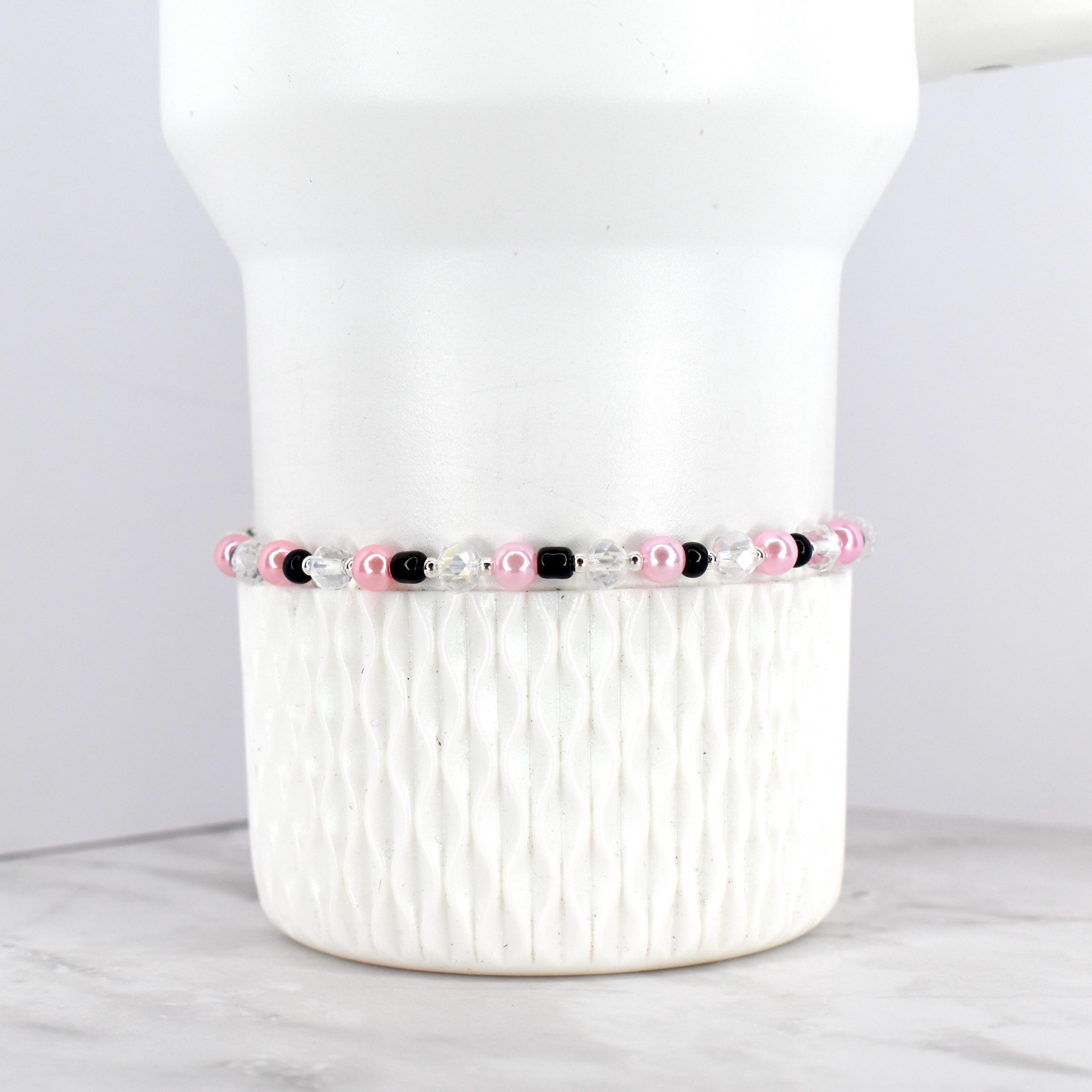 Designed with glossy pink pearl beads, sparkling crystal accents, and bold black details, this bracelet is finished with standout letter beads spelling the word of your choice.