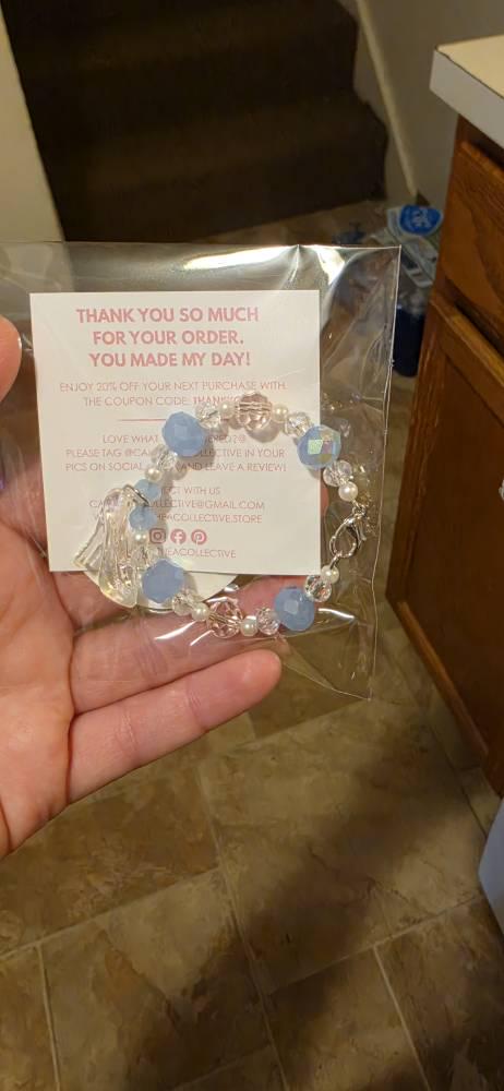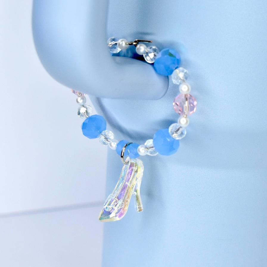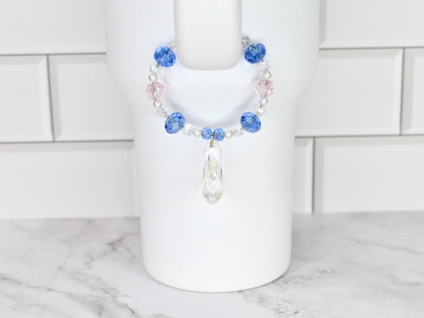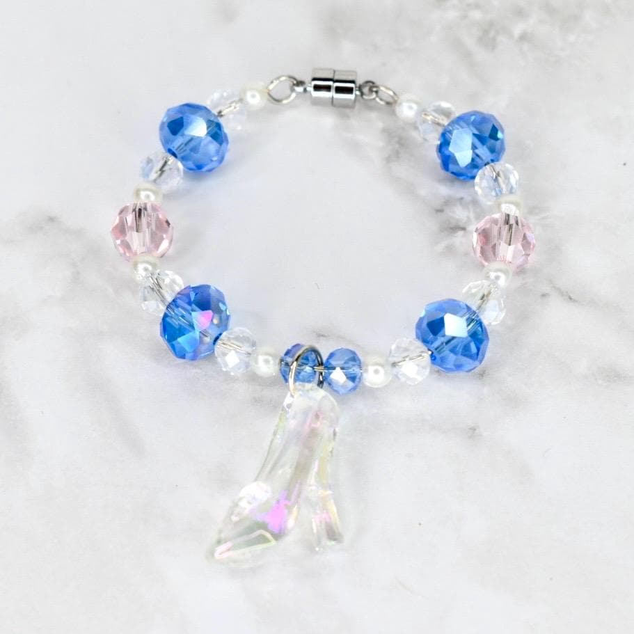 Step into your own fairytale with our Cinderella Glass Slipper Tumbler Handle Bracelet. Handmade with sparkling crystal beads, dreamy blue and pink accents, and finished with a magical iridescent slipper charm, this bracelet is enchanting.