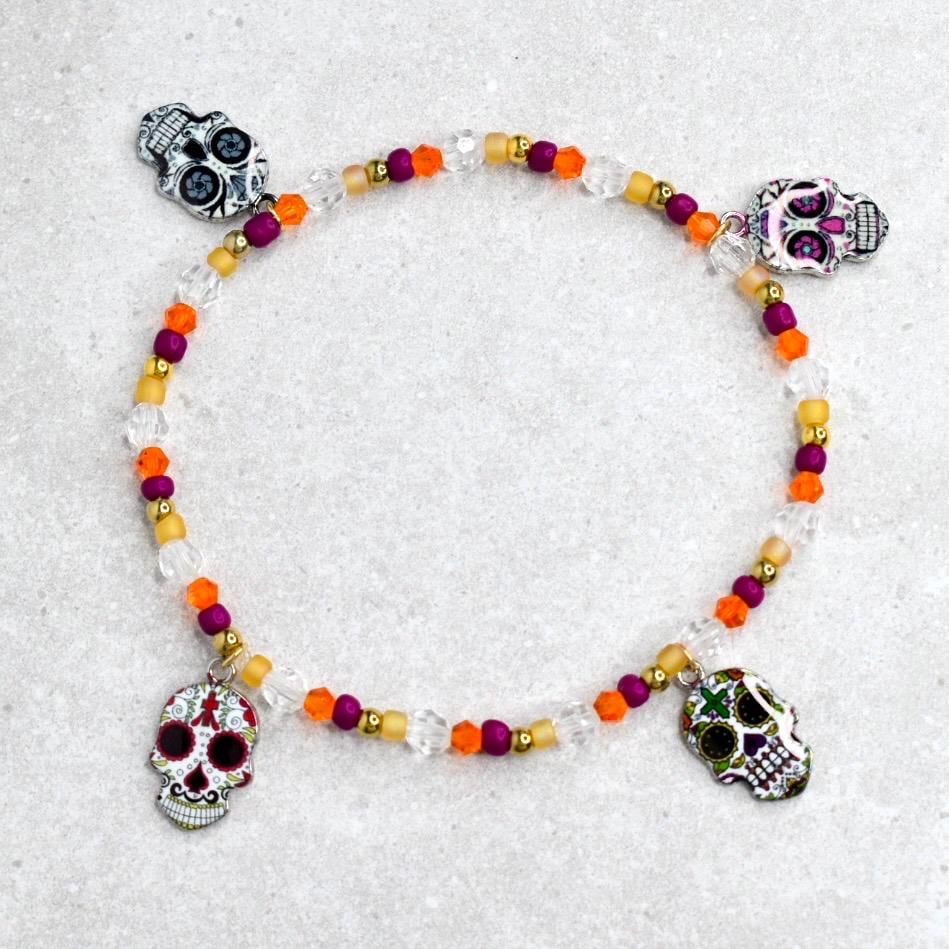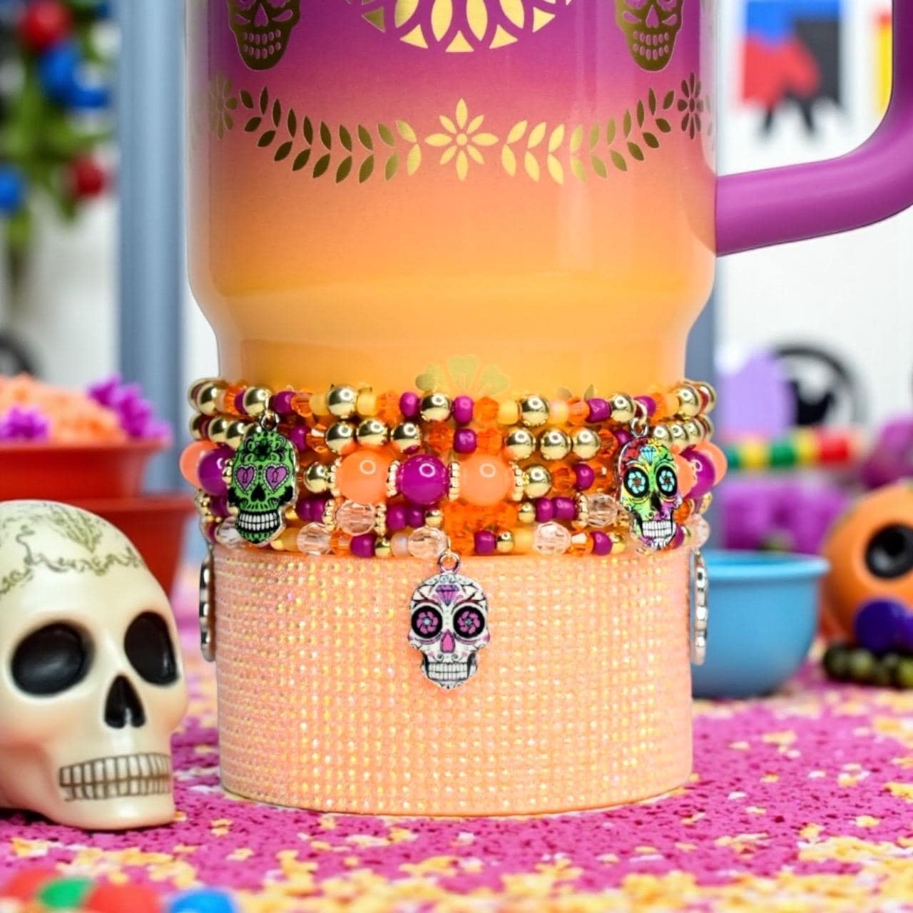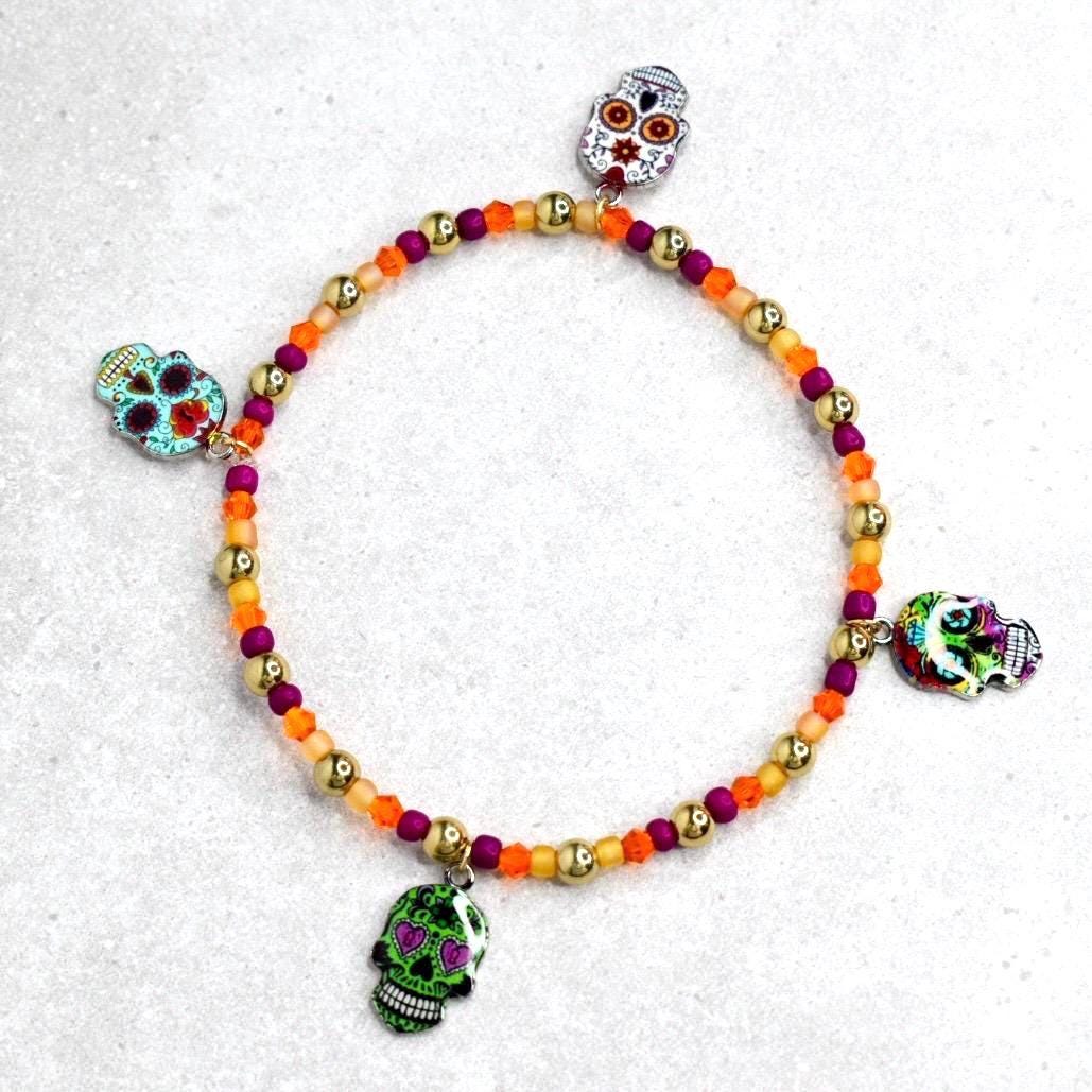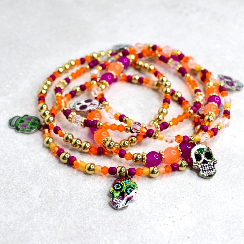 Each bracelet showcases the joyful spirit of Día de los Muertos with a unique mix of bright beads and decorative calavera charms. The energetic color combination of sunset orange, vibrant magenta, and rich purple creates a celebration-ready look that honors tradition with style.