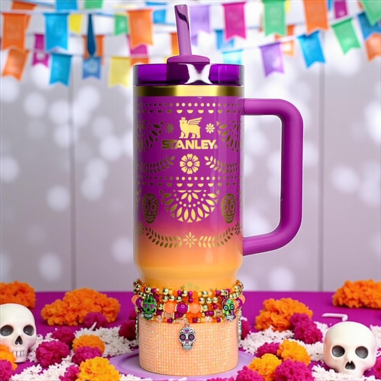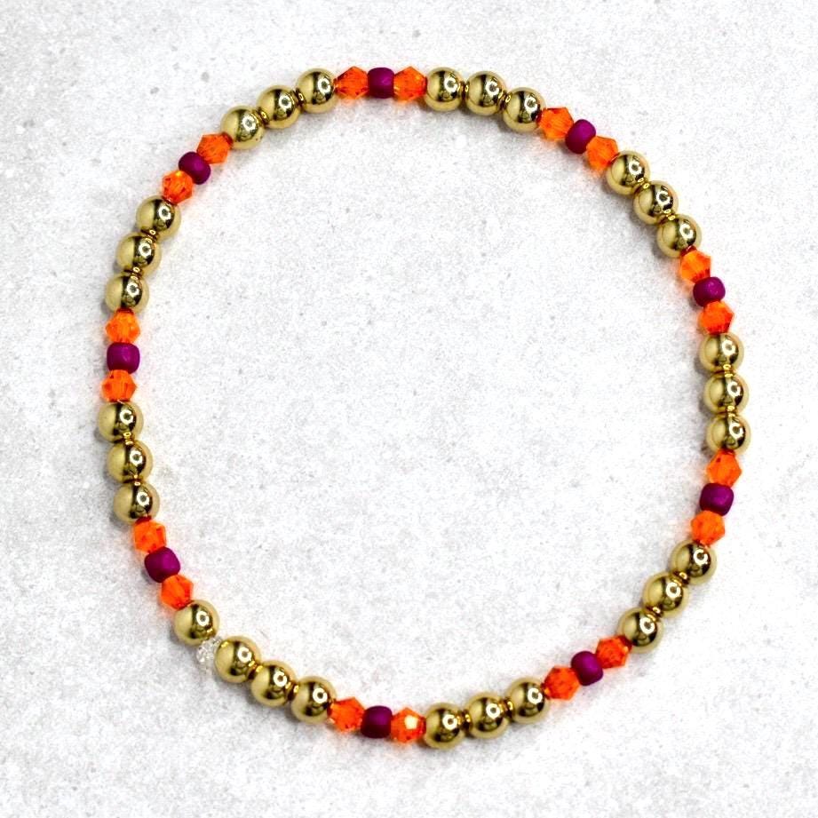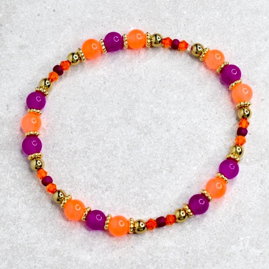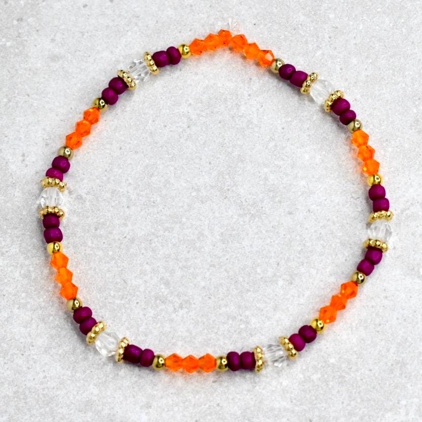 Each bracelet showcases the joyful spirit of Día de los Muertos with a unique mix of bright beads and decorative calavera charms. The energetic color combination of sunset orange, vibrant magenta, and rich purple creates a celebration-ready look that honors tradition with style.