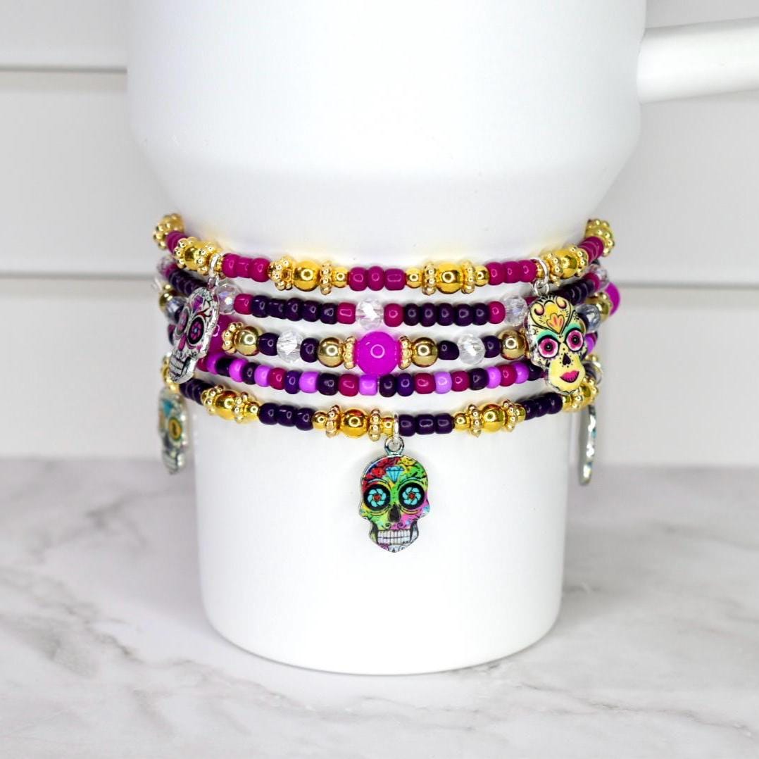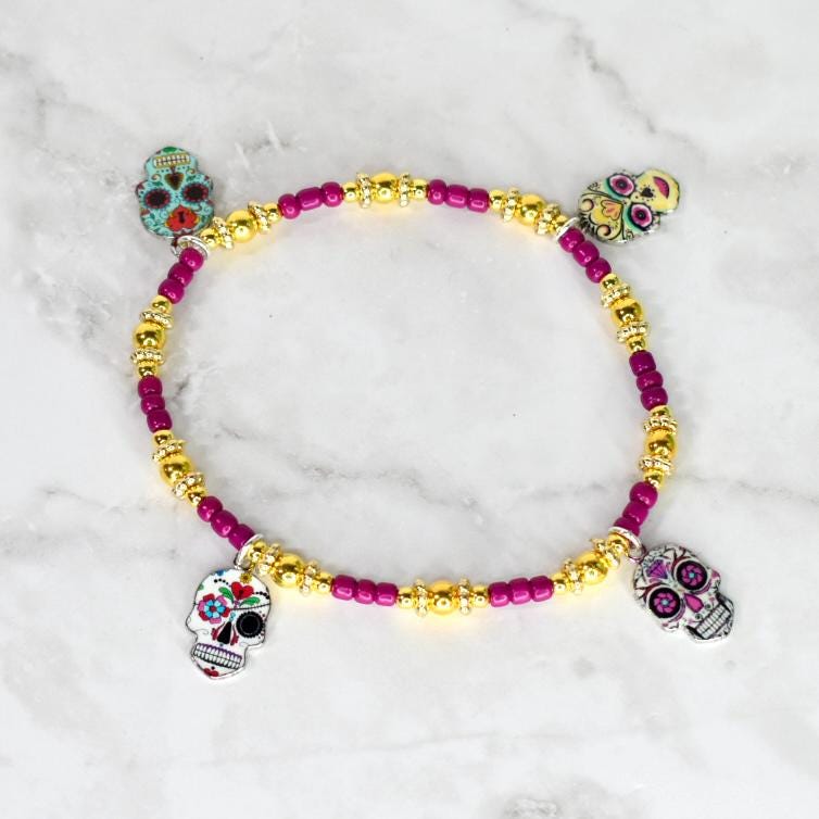 Celebrate Día de los Muertos with this stunning sugar skull bracelet stack! This vibrant 5-piece set features colorful sugar skull charms, rich magenta and gold beads, and festive details that honor the beautiful traditions of Day of the Dead.