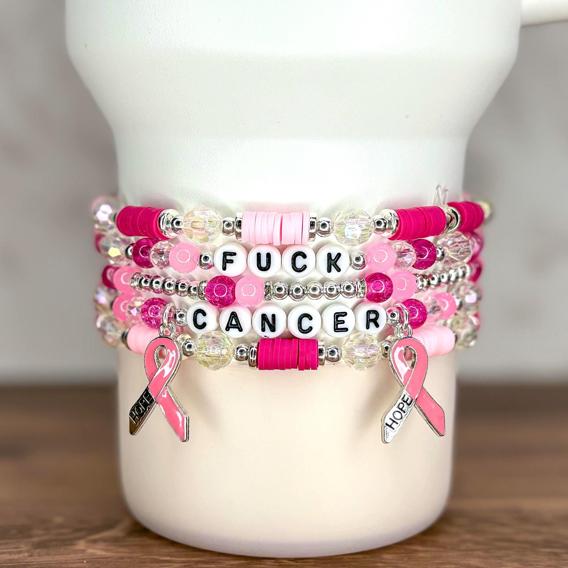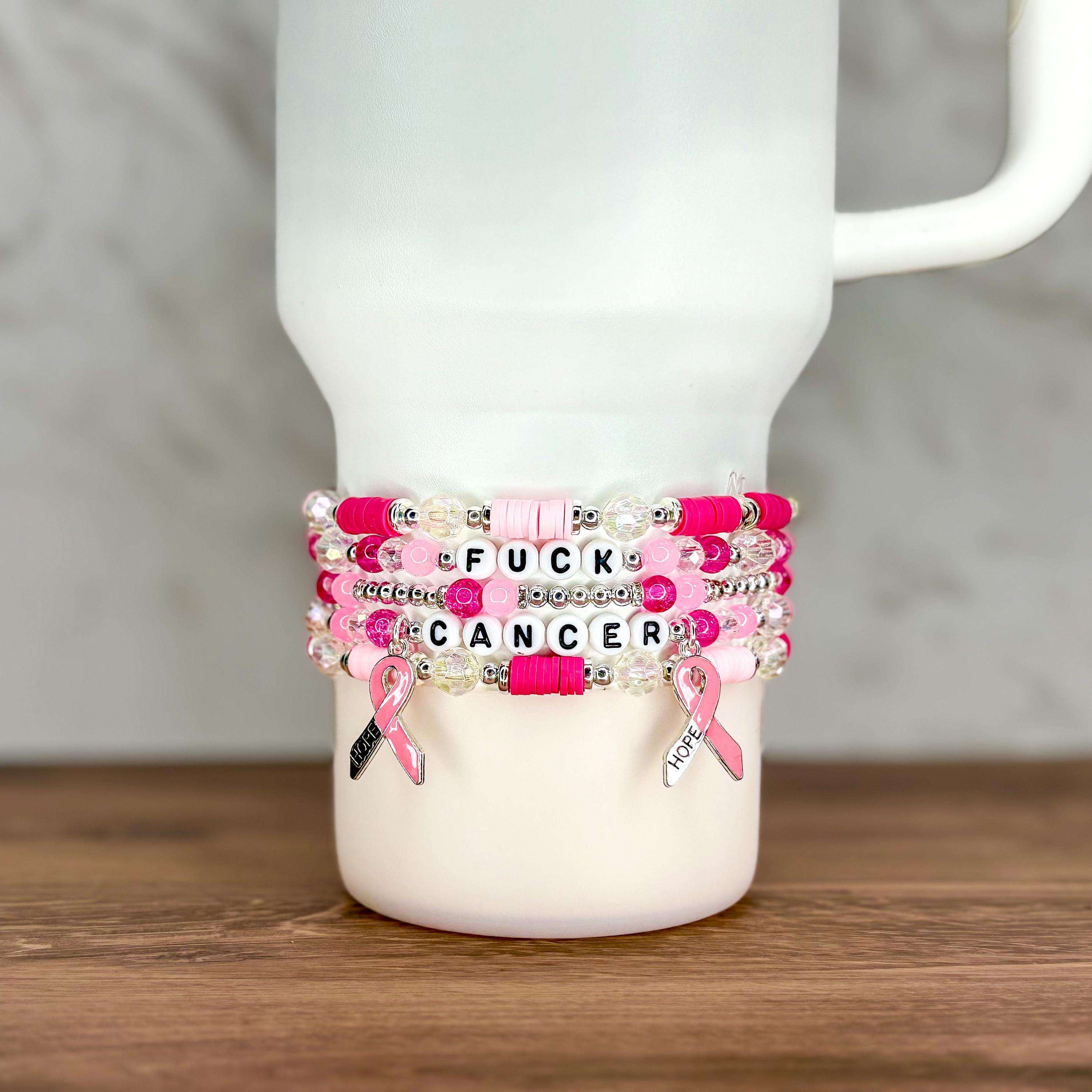 Show your strength and support with this powerful “Fighter” bracelet stack, designed in soft pink, white, and silver tones with a pink ribbon charm. Whether worn on your wrist or wrapped around your tumbler, this bracelet set is a meaningful way to raise awareness and honor the fight against breast cancer.