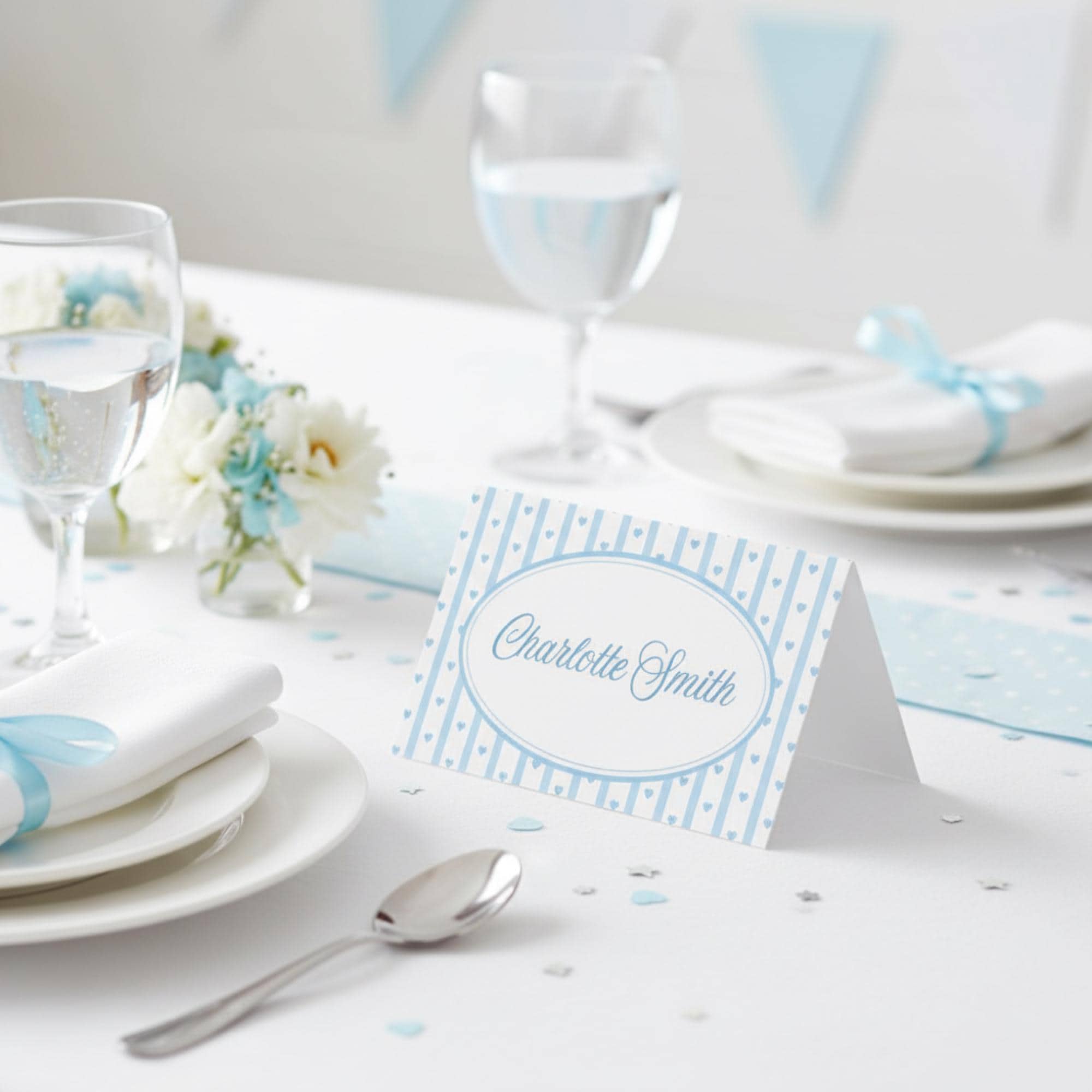 Baby Shower Place Card Editable Template: Blue Stripes and Hearts