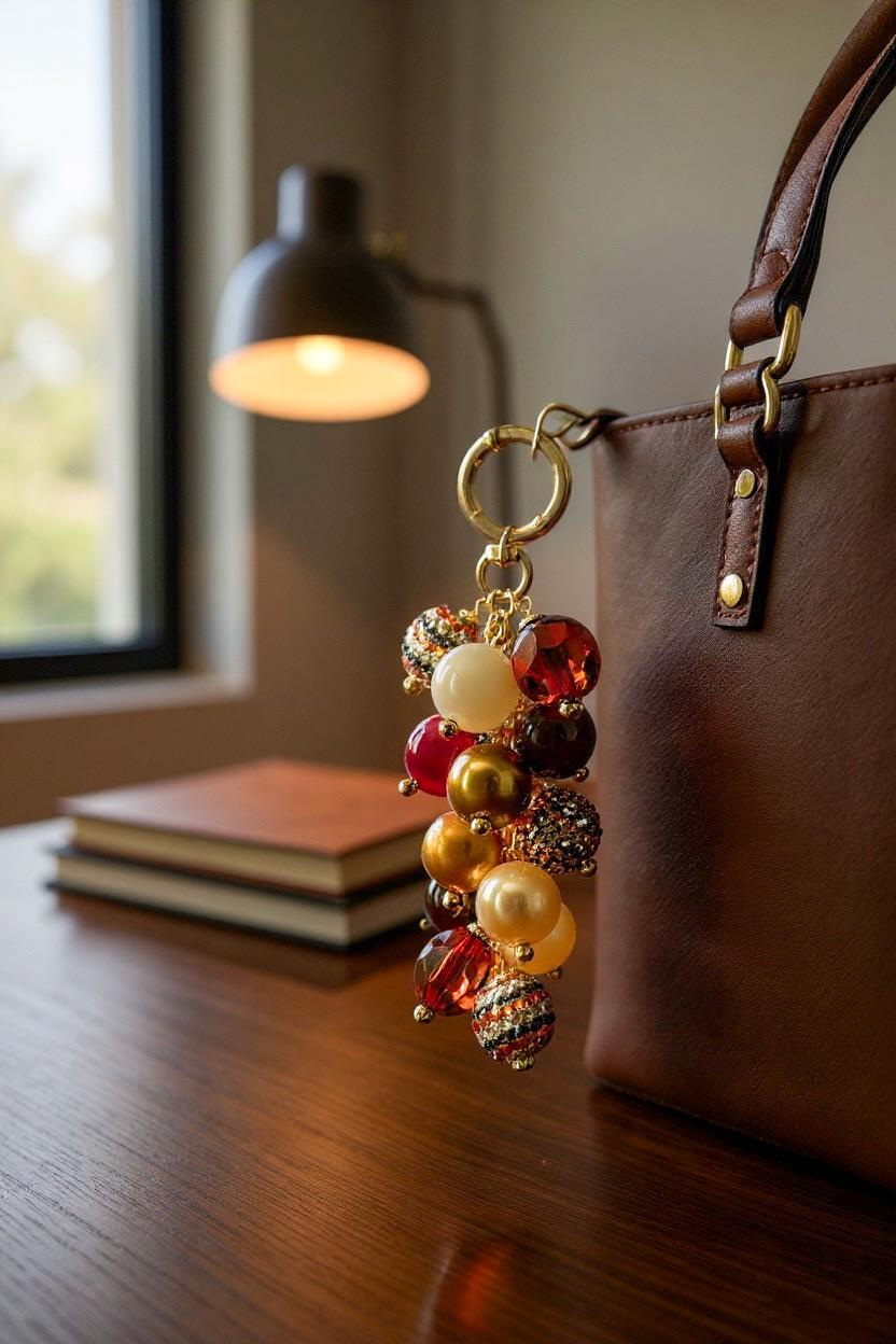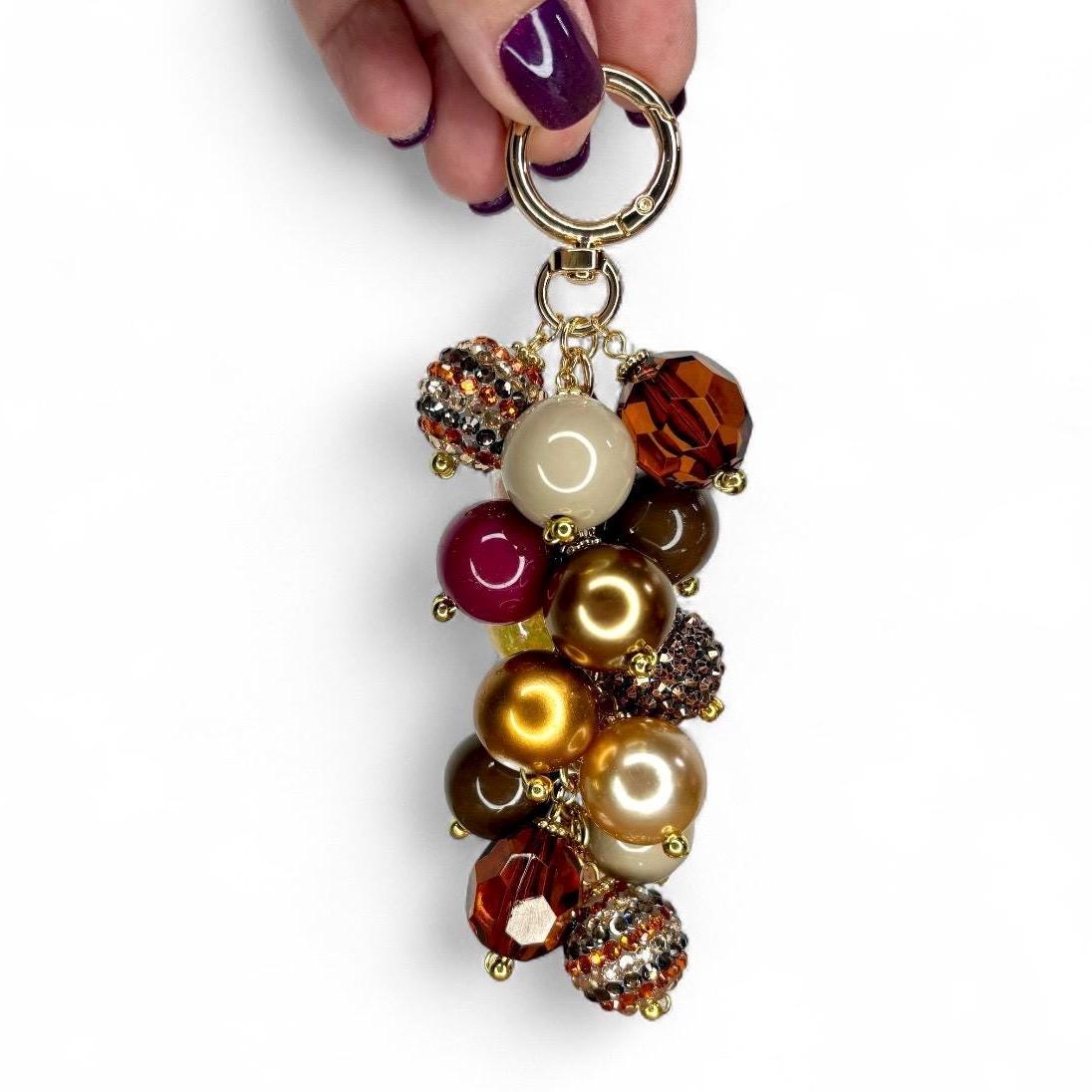 This gorgeous cluster-style charm features a rich autumn palette of burgundy, gold, cream, and amber tones. Each bead is carefully selected and arranged to create a luxurious, eye-catching accessory that adds instant glamour to any handbag, tote, backpack, or keys.