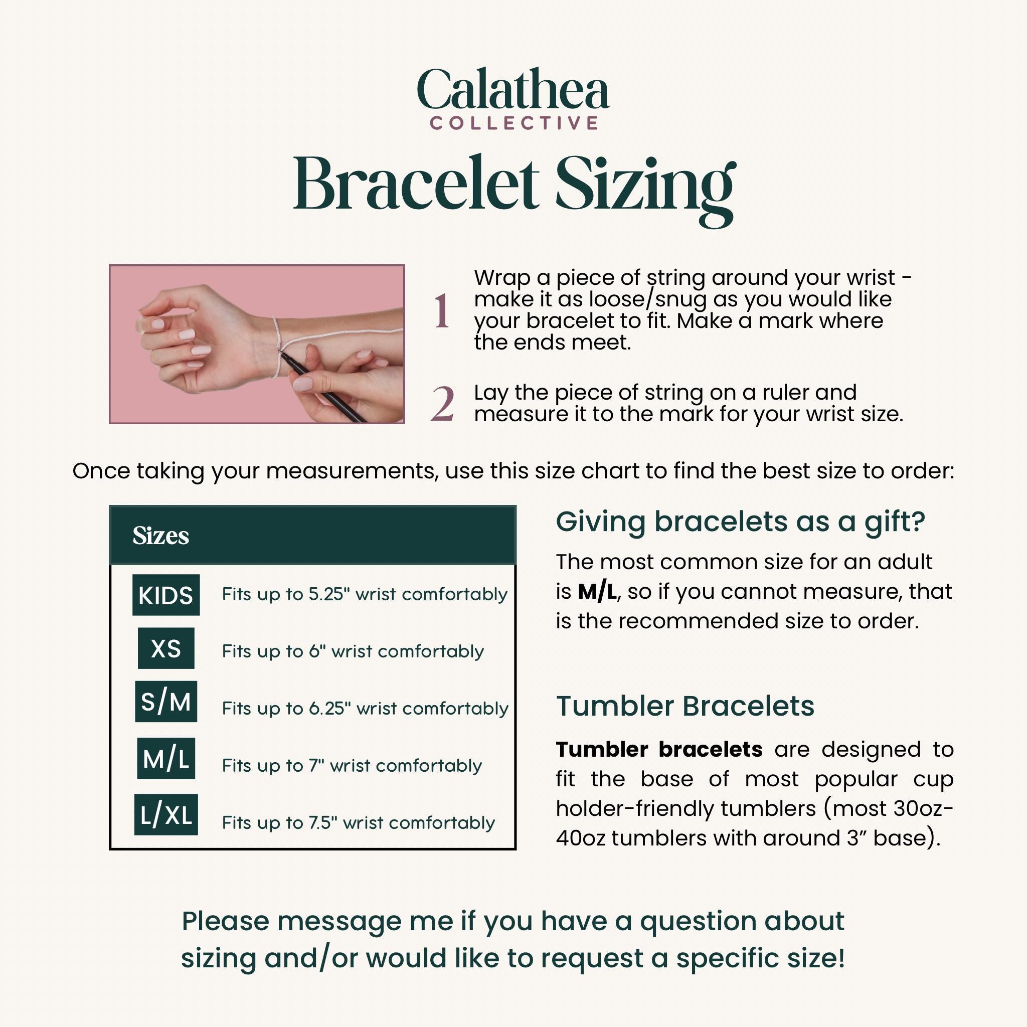 Calathea Collective’s tumbler bracelets are designed to fit the base of cup holder-friendly tumblers with a 3 inch base. If you're unsure about sizing or want to request a custom size, just send me a message—I’m happy to help!