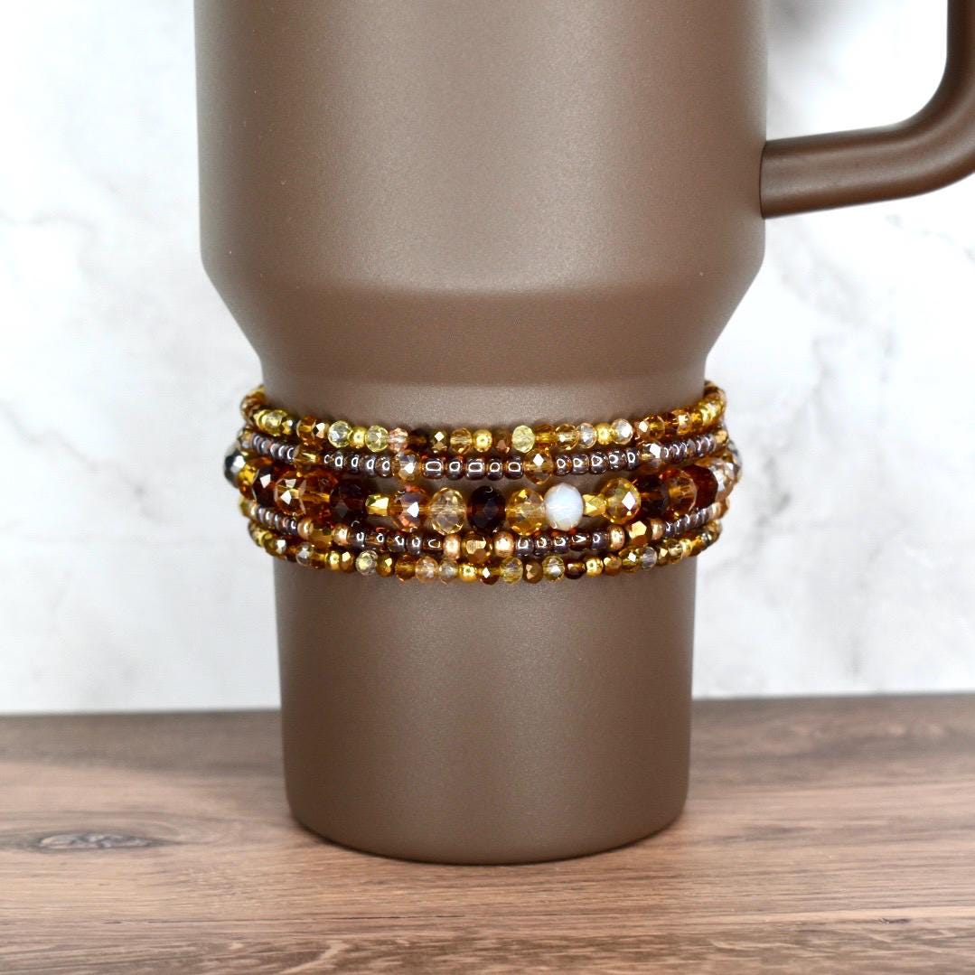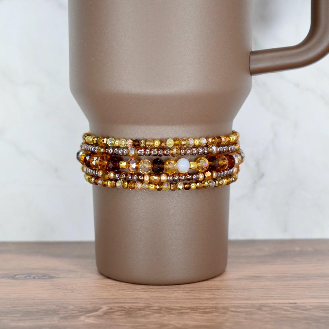 Embrace warm, luxurious style with this gorgeous 5-piece beaded bracelet stack! Featuring rich amber and topaz crystals, shimmering gold and bronze accents, and delicate seed beads, this sophisticated set radiates autumn elegance and timeless beauty.