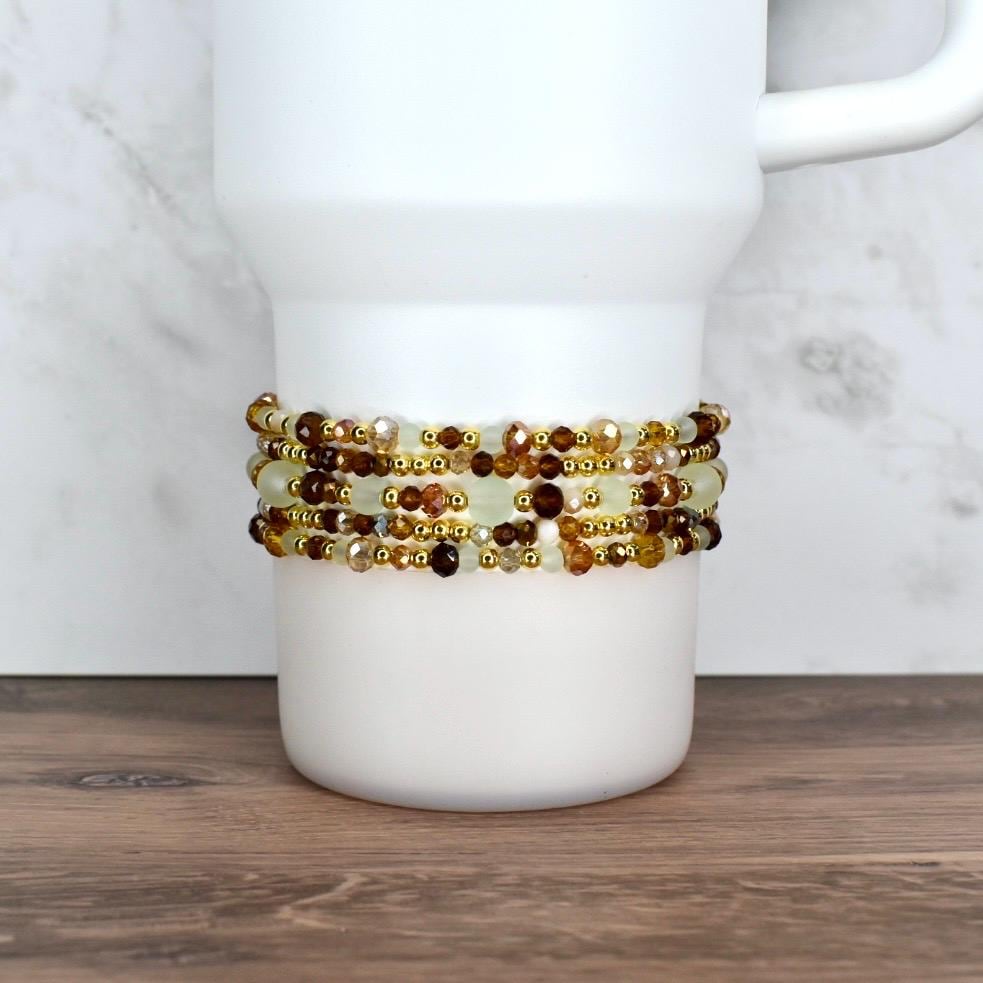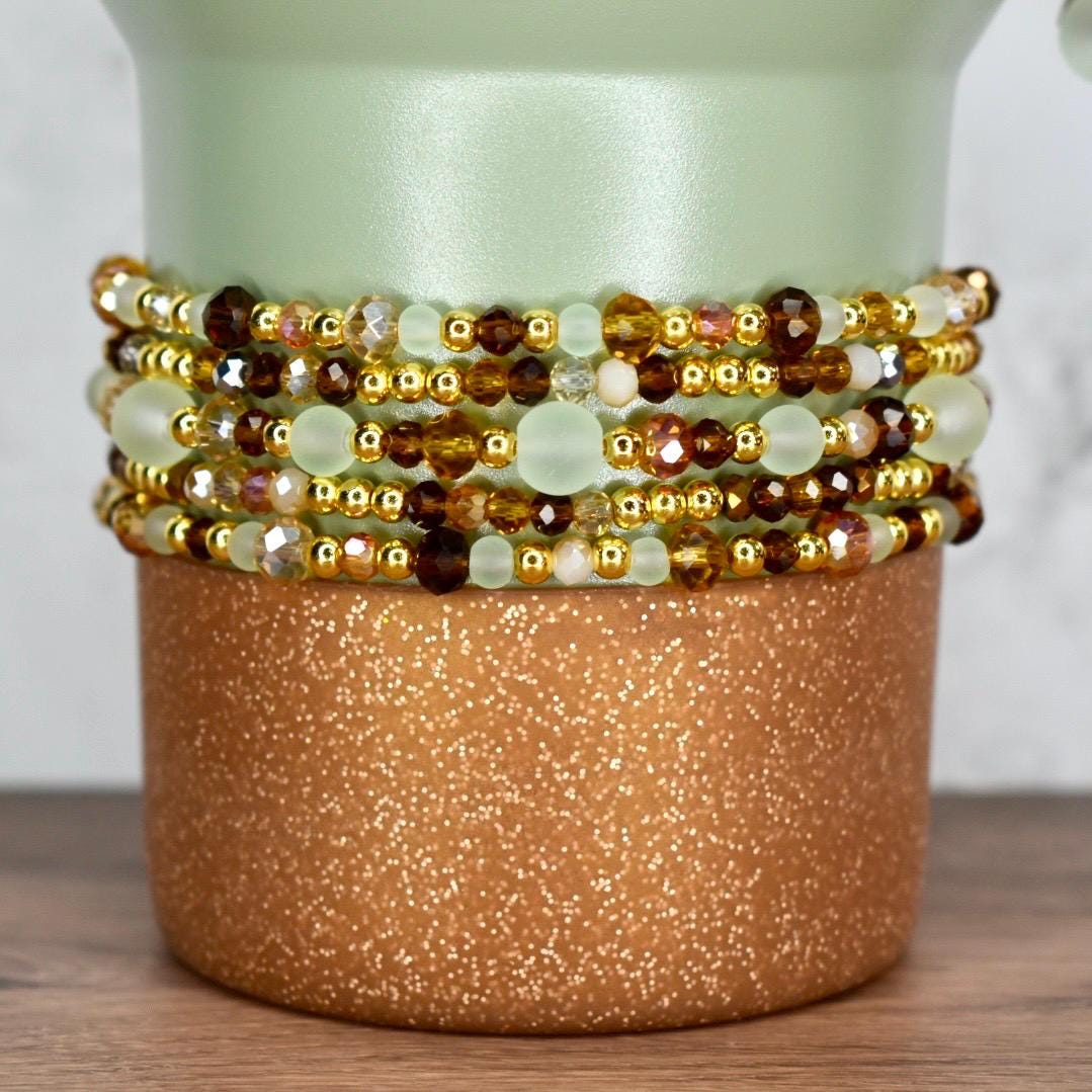 ✨ Mix of frosted sage green beads, brown crystal beads & shimmering gold spacers