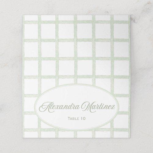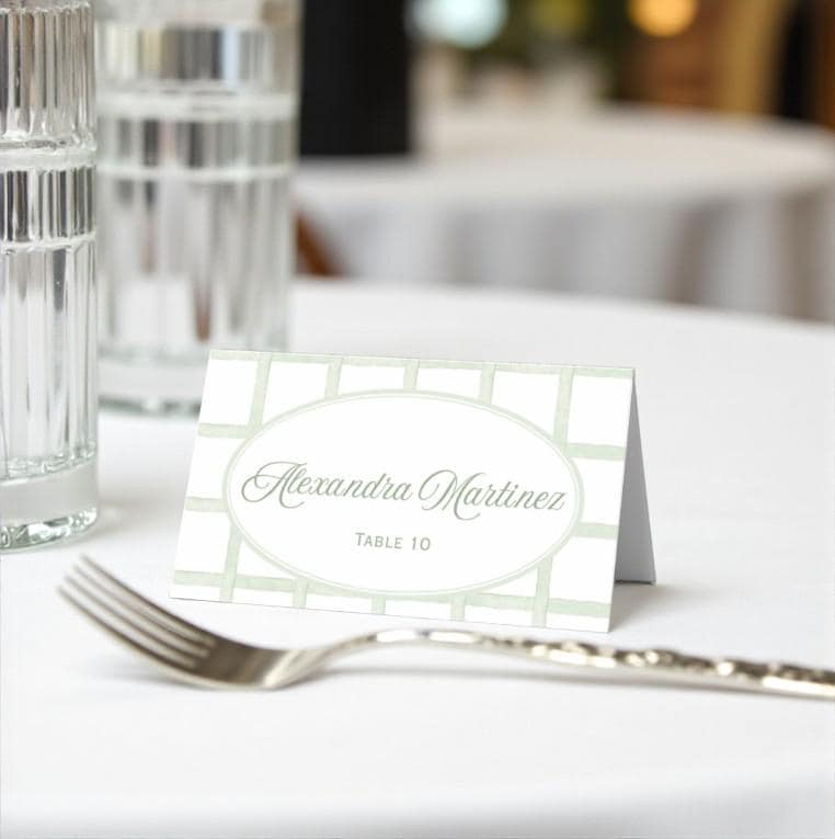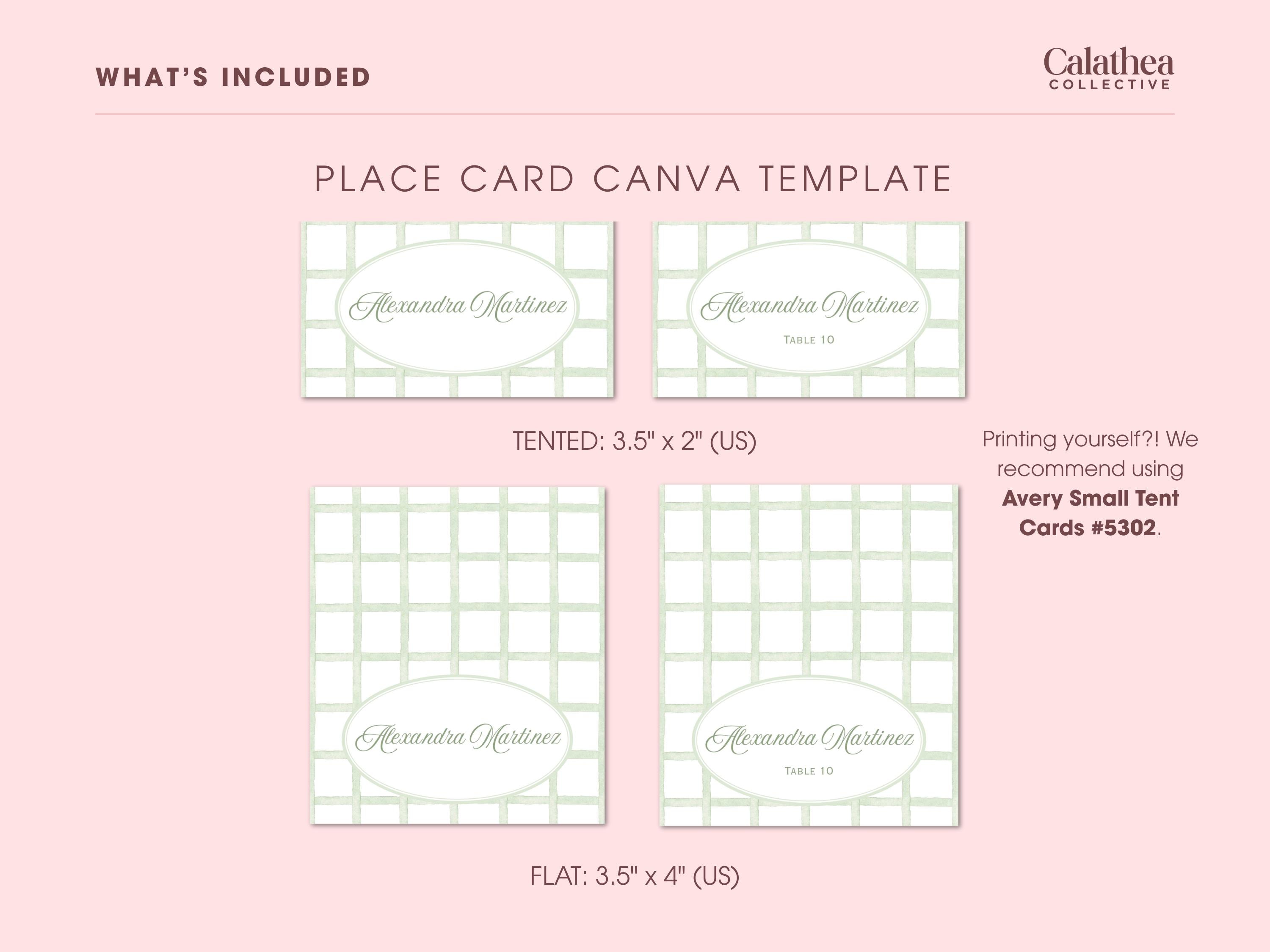 Make your event extra special with these editable place cards! Designed with a sage green lattice background and elegant script font, these folded tent cards are fully customizable in Canva — no software or design skills required. Simply edit, download, and print at home or through your favorite print shop.