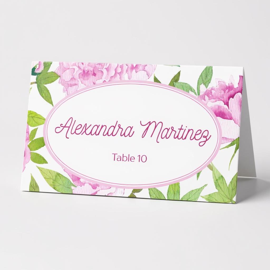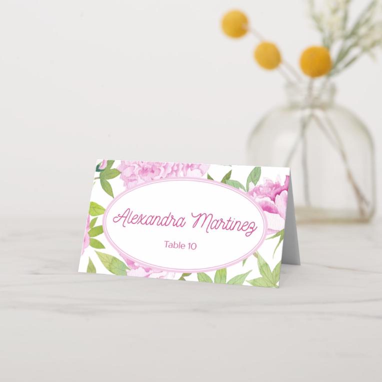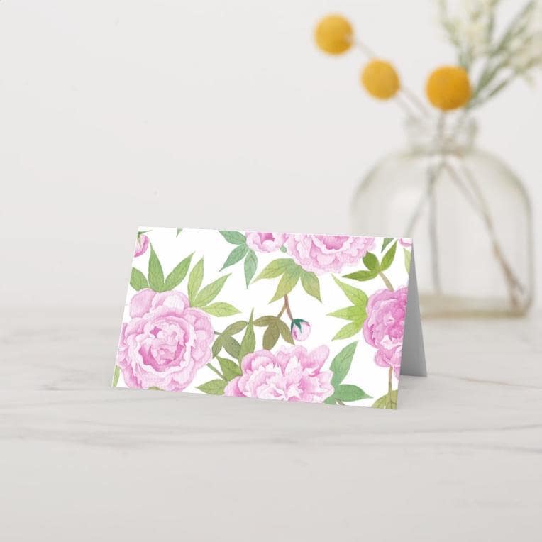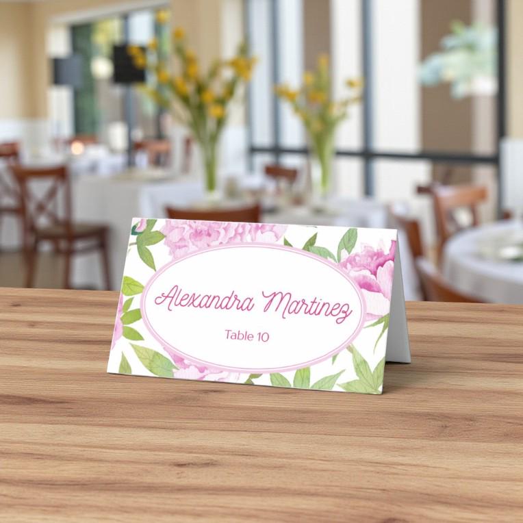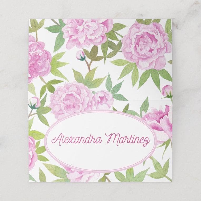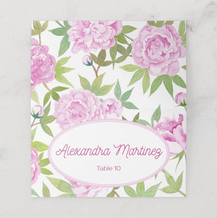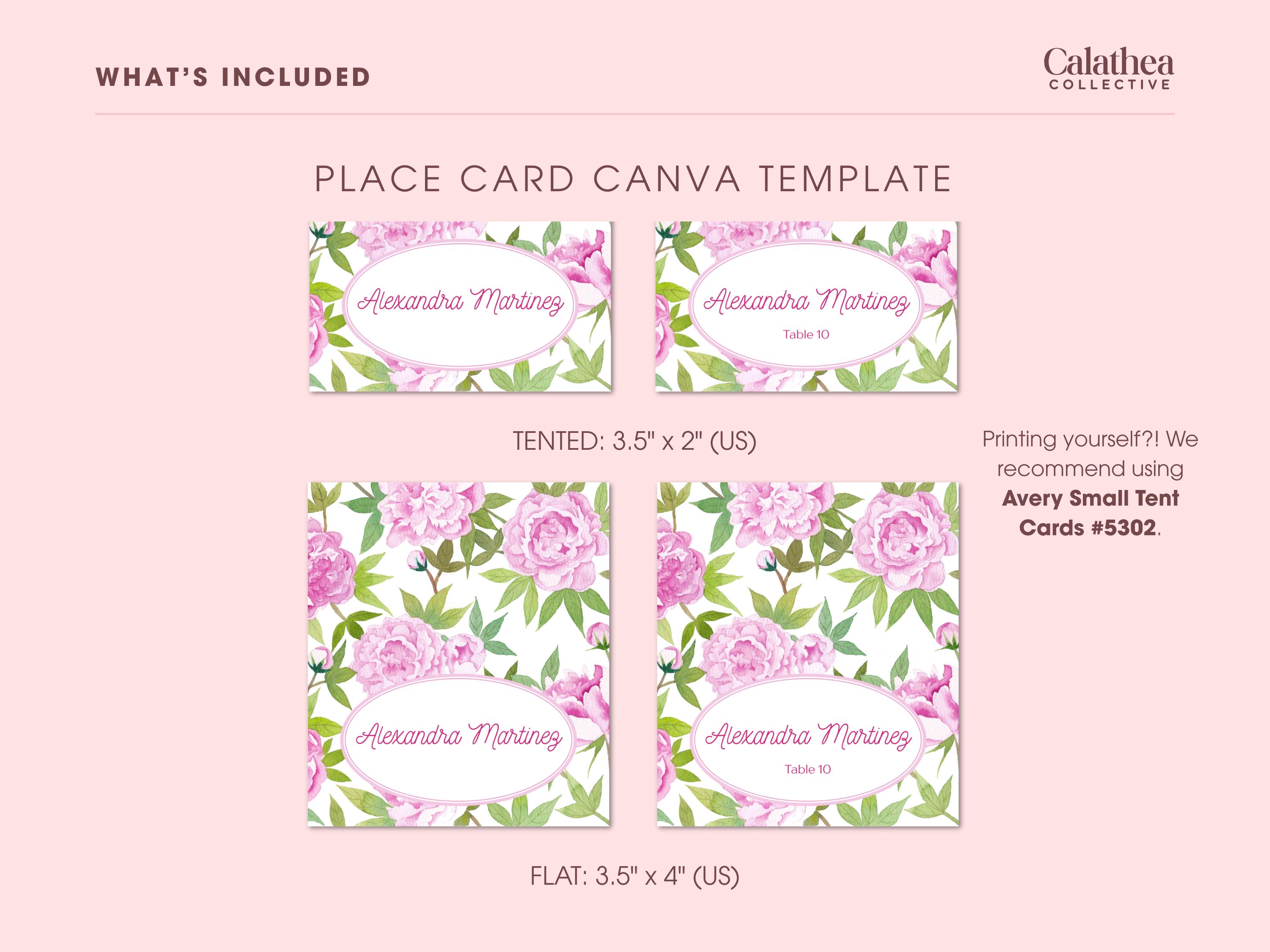 Make your event extra special with these editable place cards! Designed with a gorgeous watercolor pink peony background and a modern script font, these folded tent cards are fully customizable in Canva — no software or design skills required. Simply edit, download, and print at home or through your favorite print shop.
