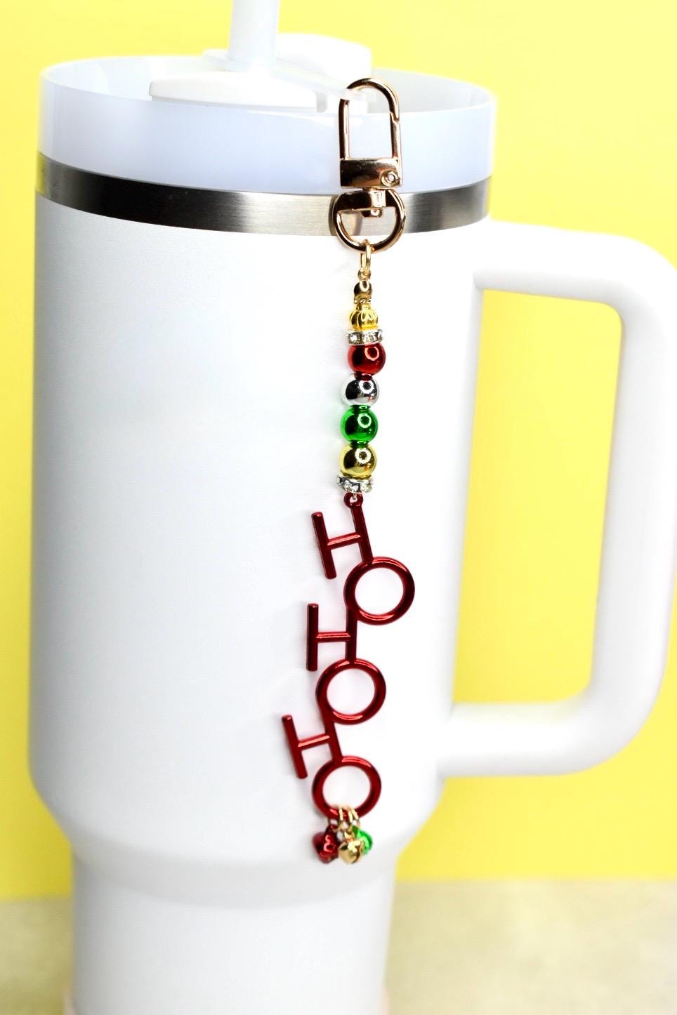 The playful design includes a burgundy red “Ho Ho Ho” charm finished with red and green jingle bells, plus a beaded strand featuring red, black, green, and shiny gold beads with sparkly rhinestone spacers. The gold swivel clasp makes attachment easy, and a straw adapter is included for compatibility with most straw types!