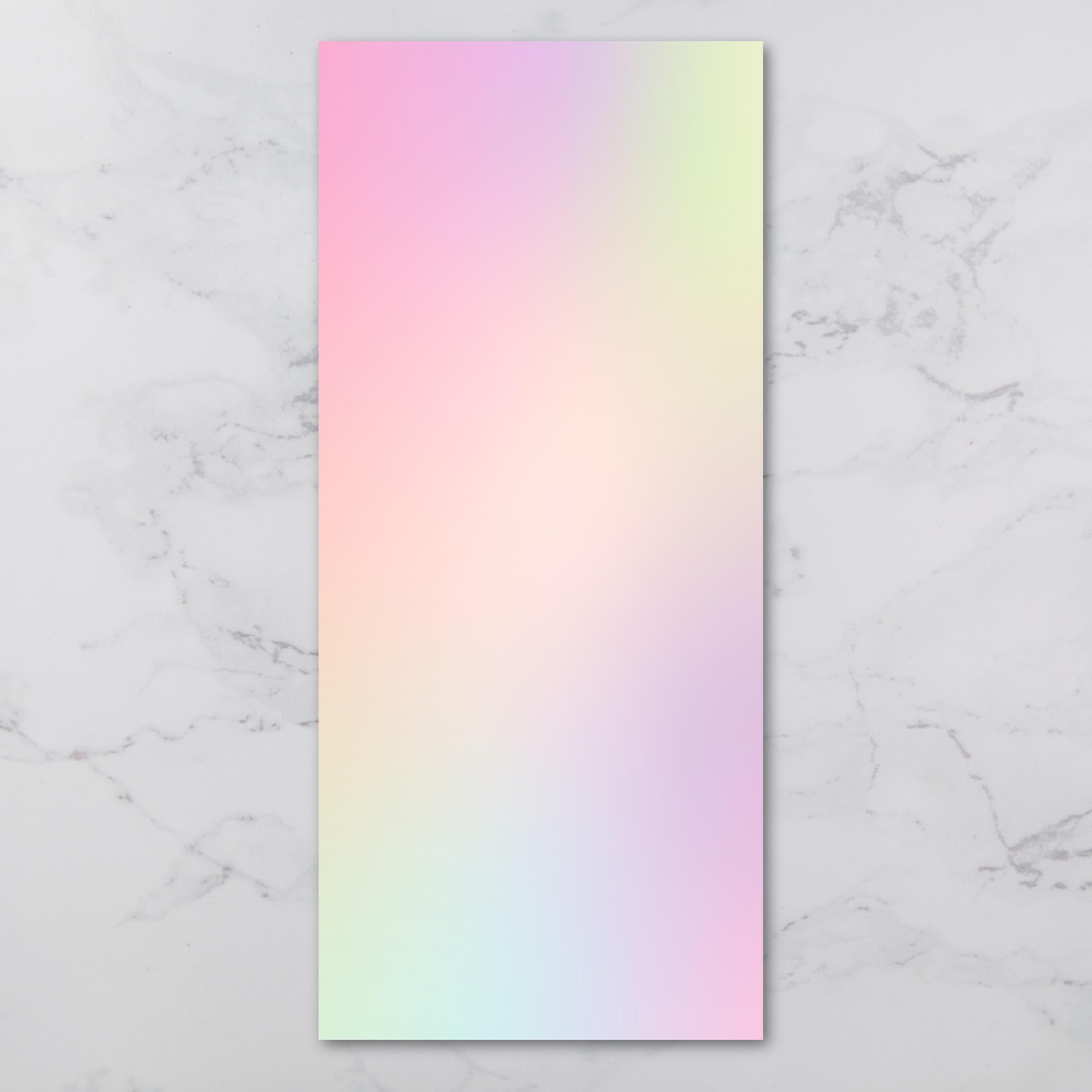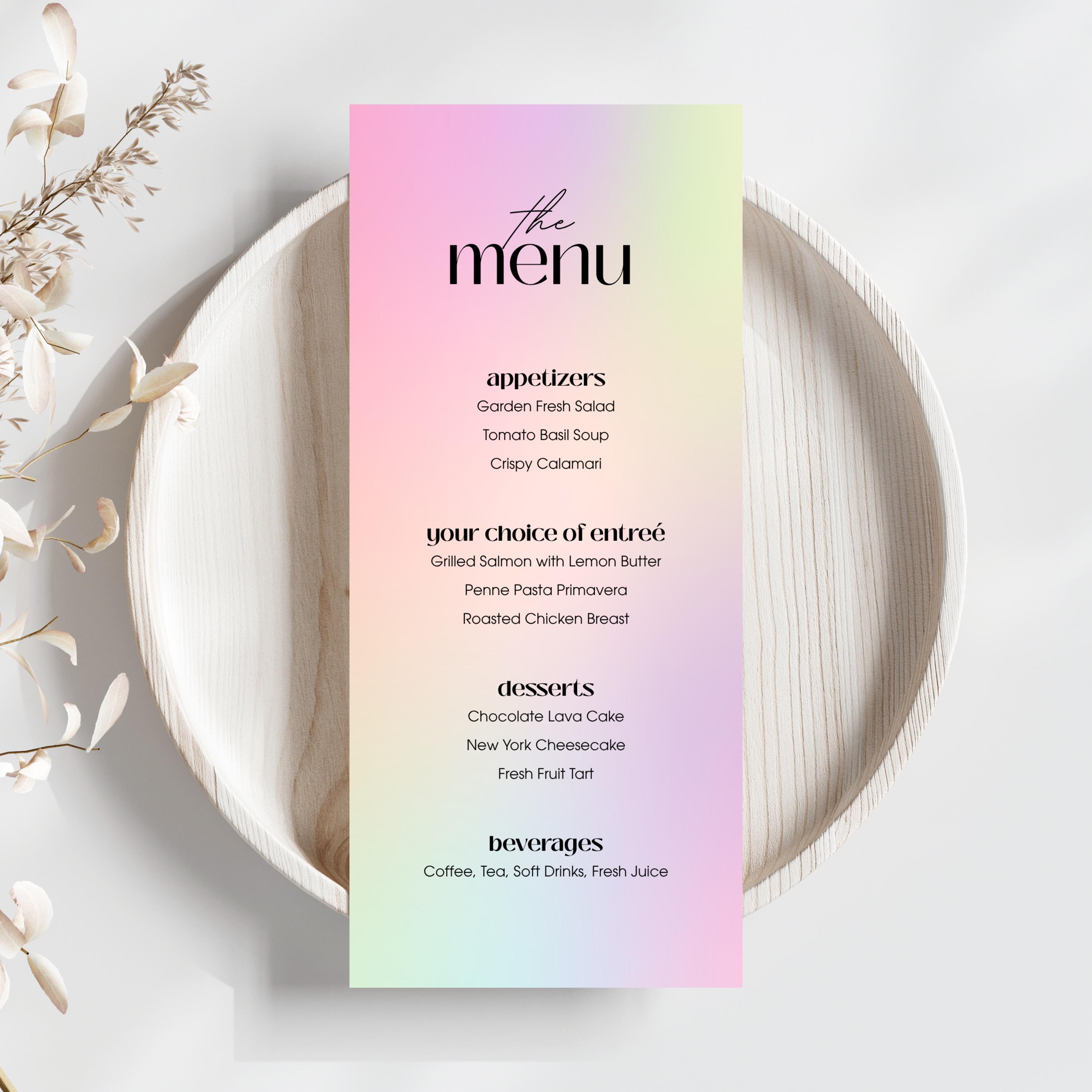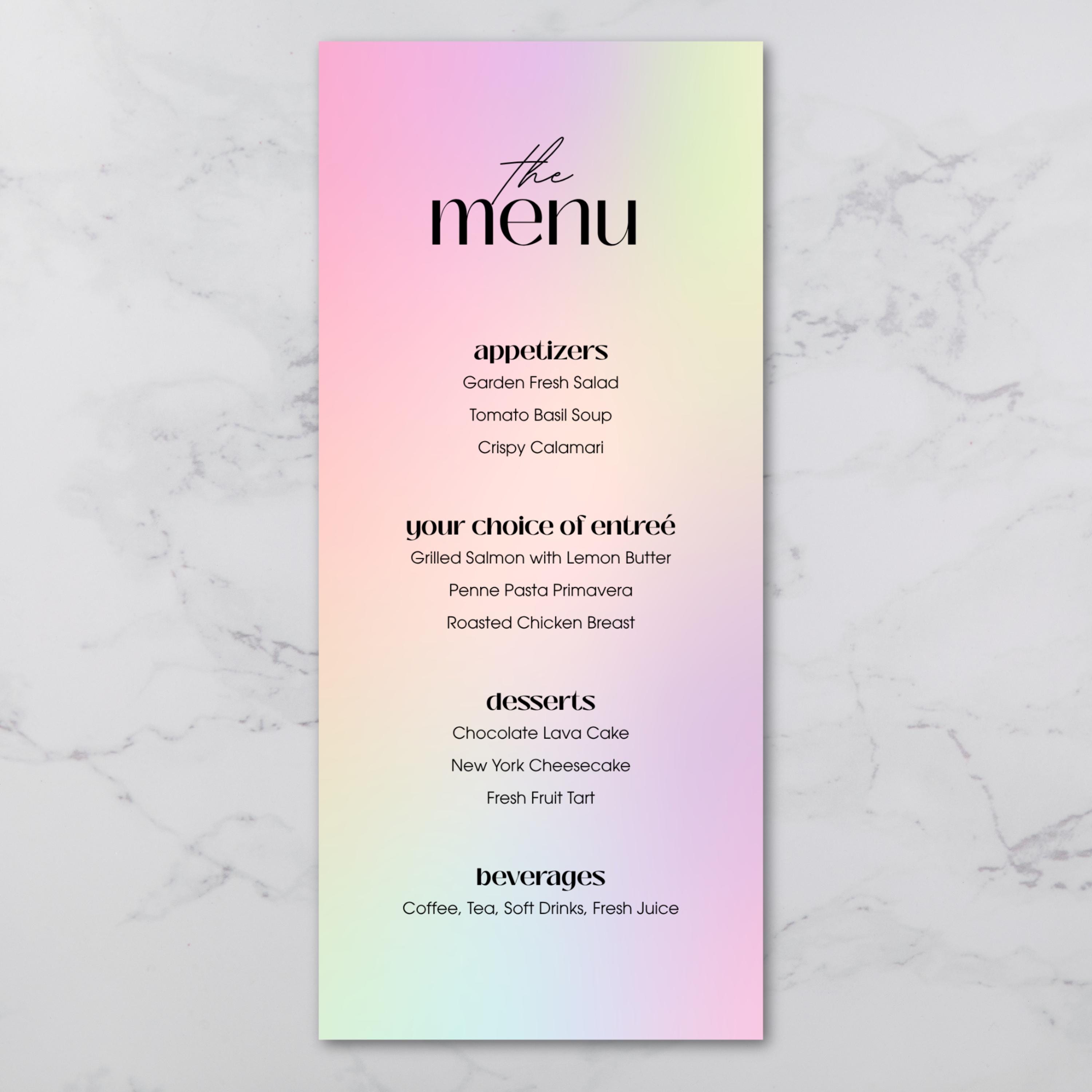 This modern and chic menu card features a dreamy pink, purple, and yellow ombre gradient background with elegant black typography, perfect for contemporary weddings, bridal showers, birthday parties, baby showers, or any stylish celebration.