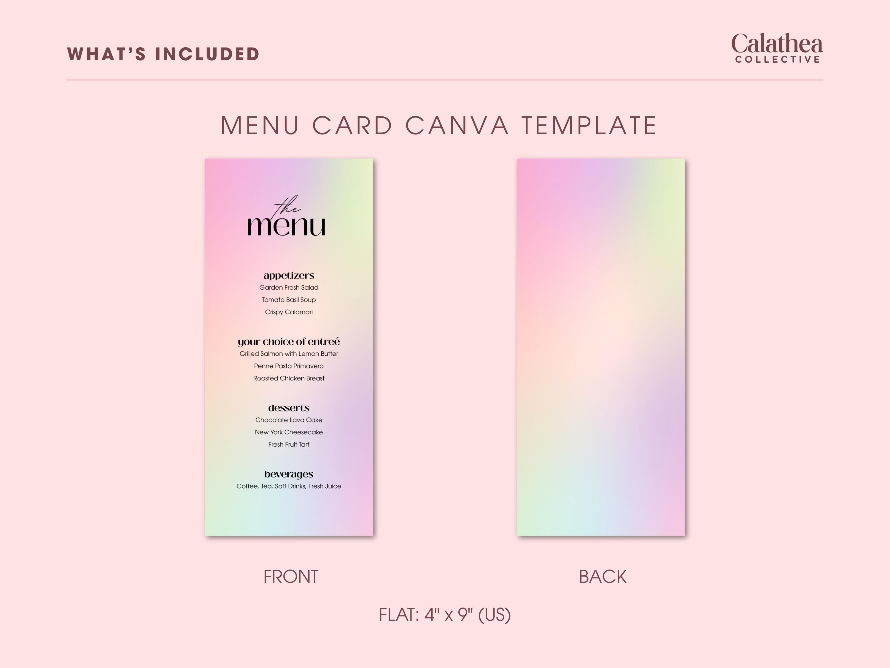 Change the text to include your specific menu items, adjust the gradient colors to match your event palette, modify font sizes and styles, add or remove sections, and duplicate the template to create matching place cards, table numbers, welcome signs, and other event stationery.
