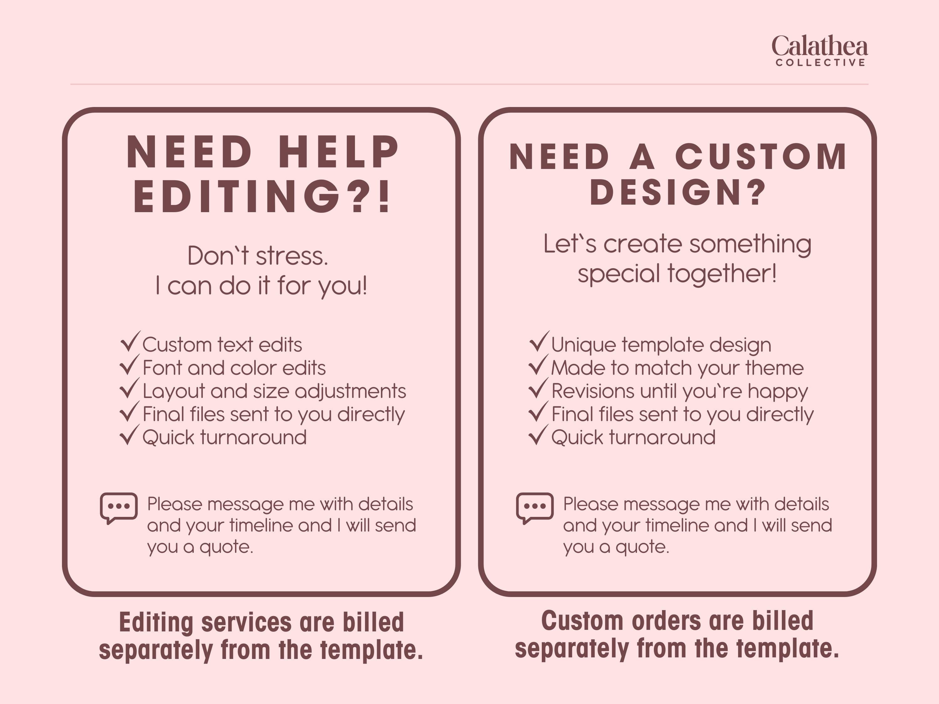 Have questions about customizing your template? Need help accessing Canva? I'm here to help! Send me a message and I'll respond within 24 hours.