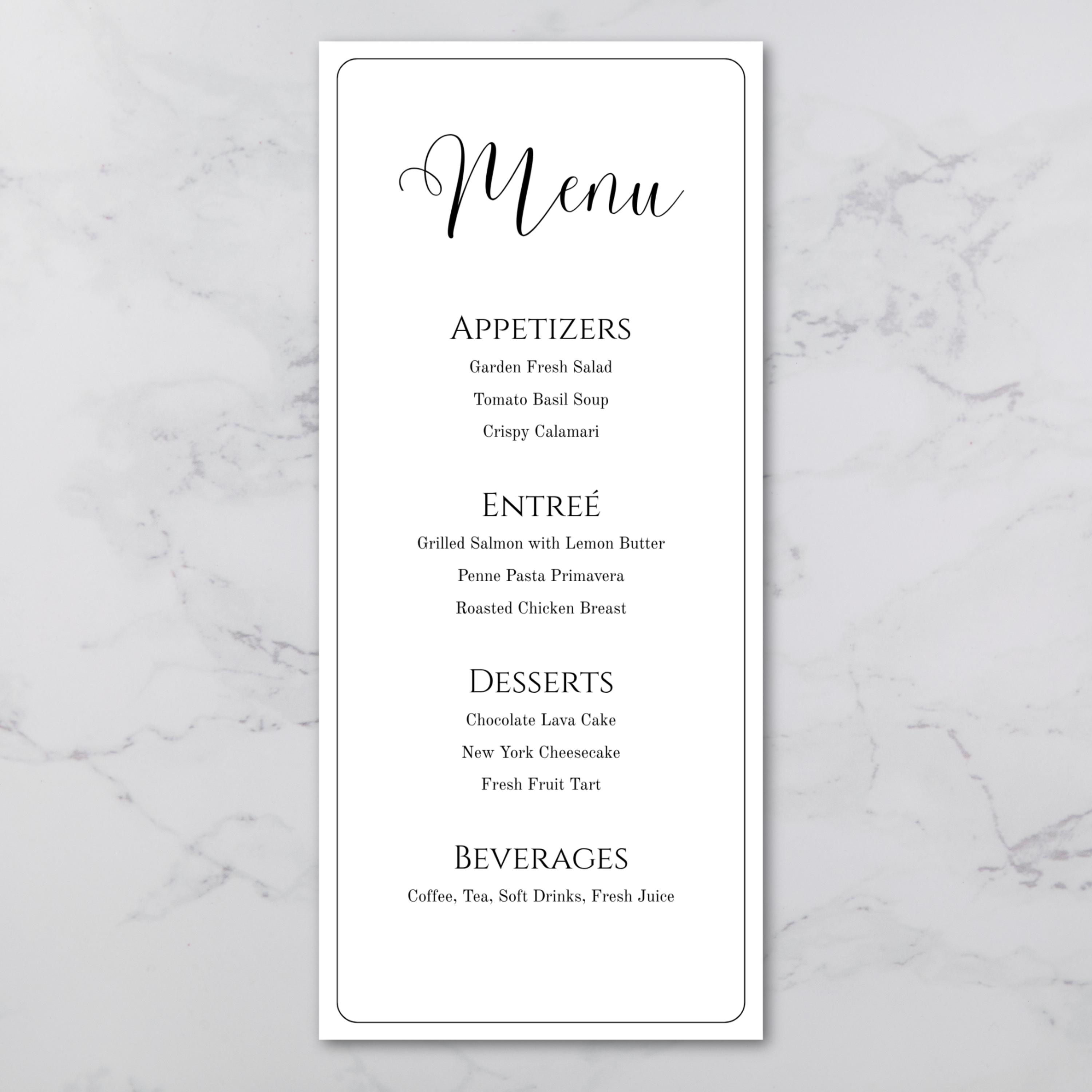 This elegantly simple menu card features a clean white background with sophisticated black calligraphy and serif typography, framed by a refined border. Perfect for traditional weddings, formal dinners, corporate events, or any elegant celebration where timeless style is essential.