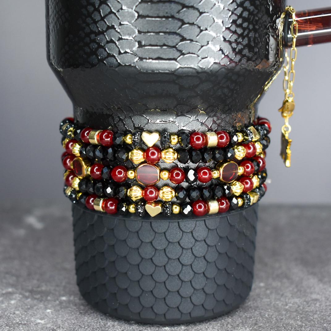 Each bracelet showcases premium beadwork with deep red garnet-toned beads, faceted black crystals, and luxurious gold-tone accents. The tiny gold heart beads add a sweet touch to this otherwise bold and dramatic stack, creating the perfect balance of edge and elegance.
