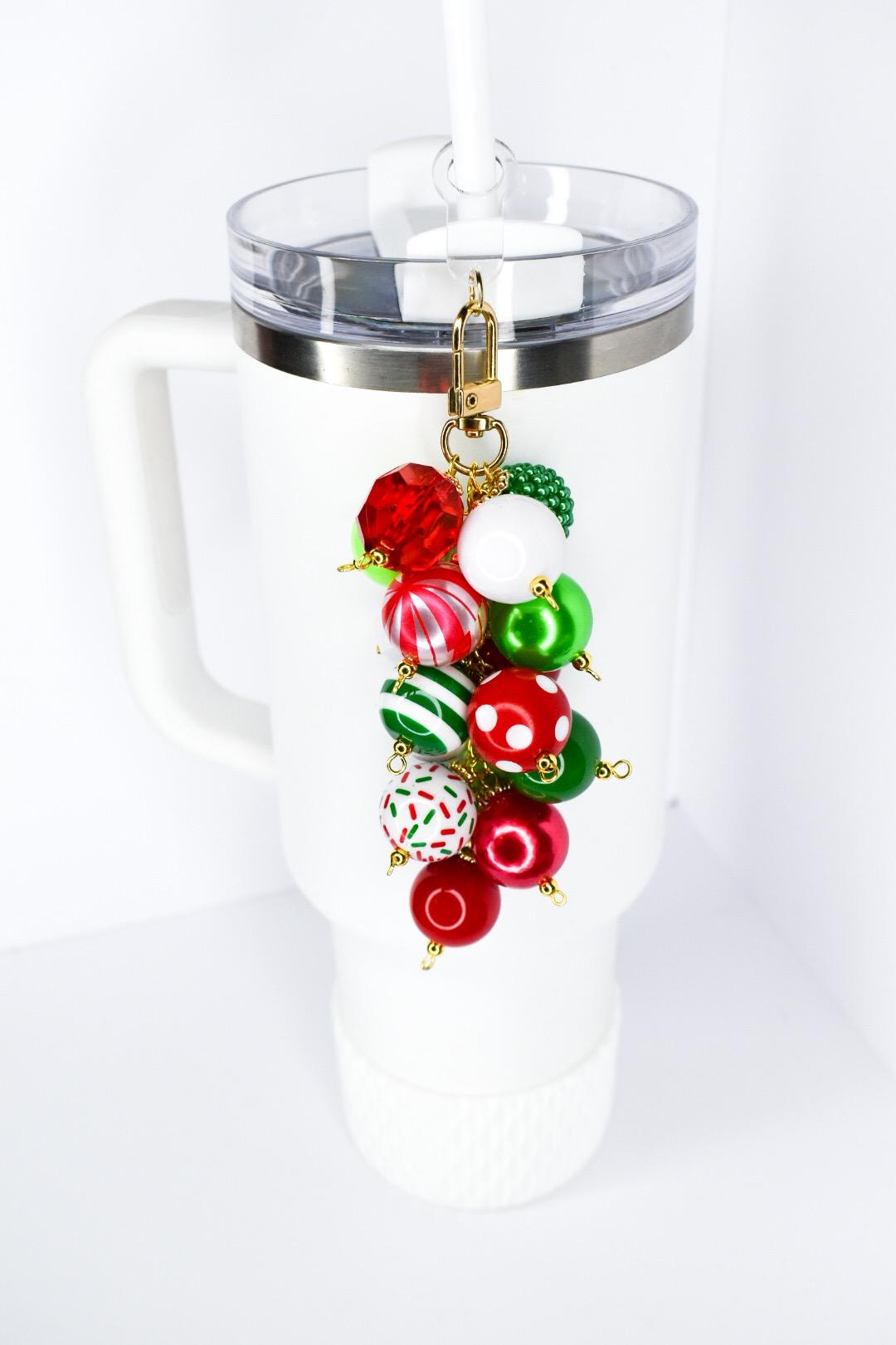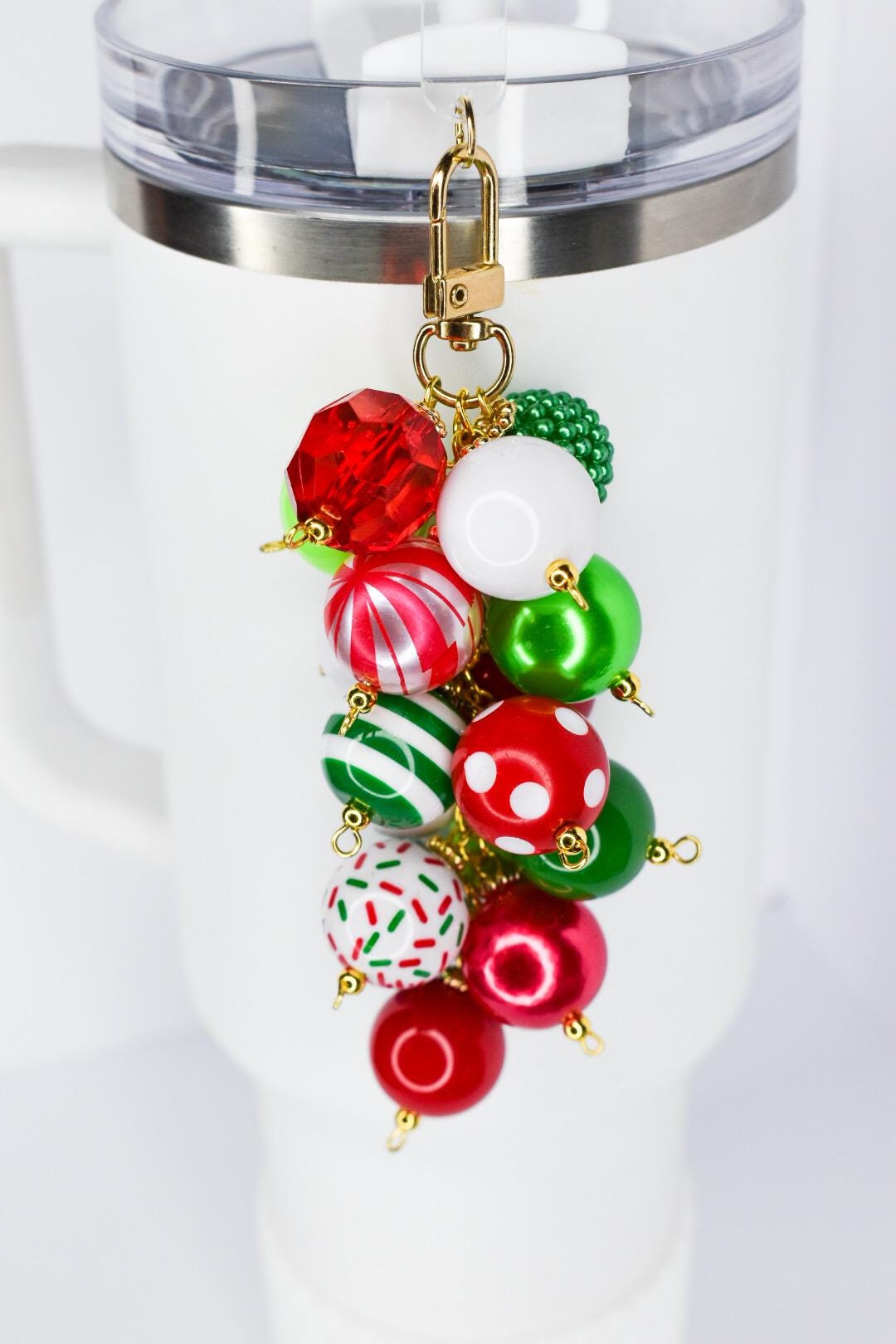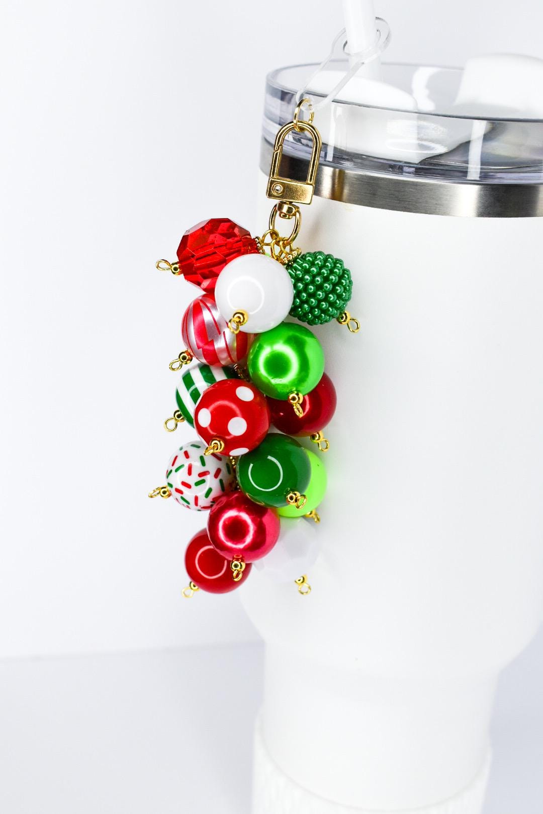 Add festive cheer to your favorite tumbler with this Christmas straw charm that doubles as a holiday gift bag keychain for seasonal beverage decoration. This sparkly attachment features a delightful cluster of red, green, and white beads that transform any festive cup drink into a merry tumbler accessory.