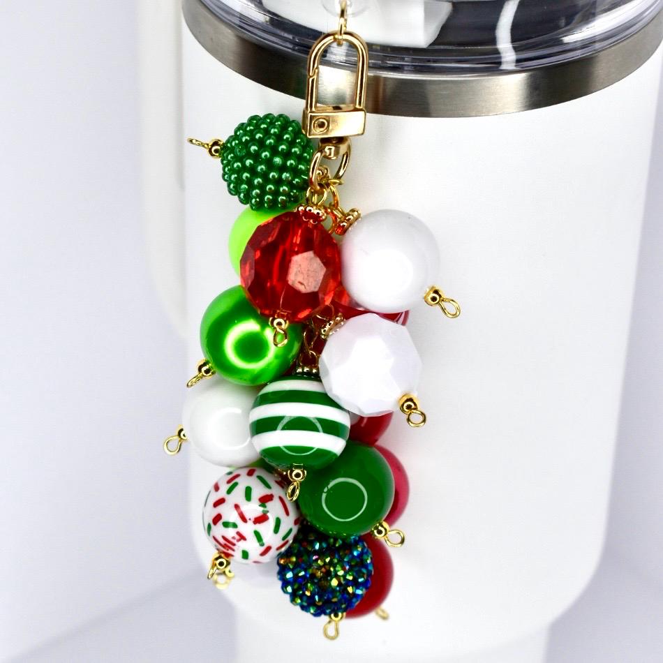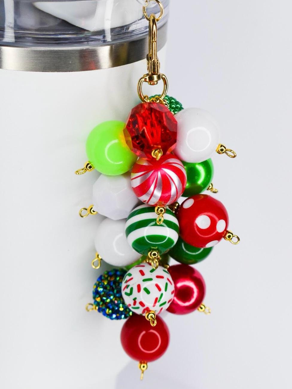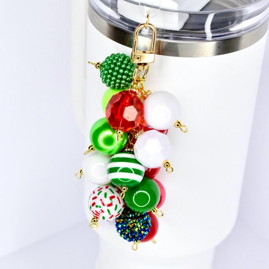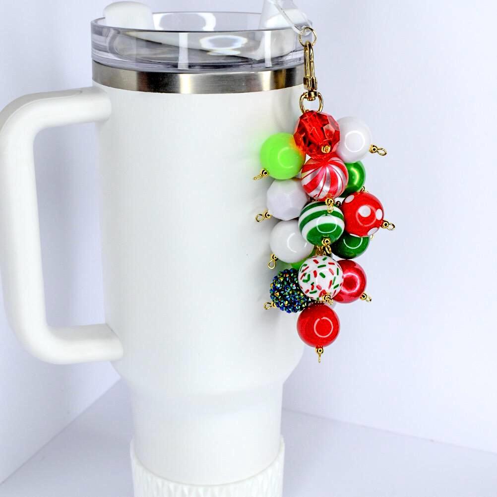 Add festive cheer to your favorite tumbler with this Christmas straw charm that doubles as a holiday gift bag keychain for seasonal beverage decoration. This sparkly attachment features a delightful cluster of red, green, and white beads that transform any festive cup drink into a merry tumbler accessory.