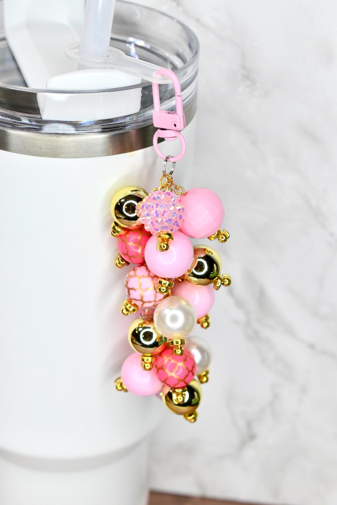 Add a touch of luxe to your tumbler with this gorgeous pink and gold straw charm! This stunning accessory features a beautiful cluster of pink beads in various shades and patterns, paired with gleaming gold metallic beads and a lustrous pearl for a look that's both feminine and glamorous.