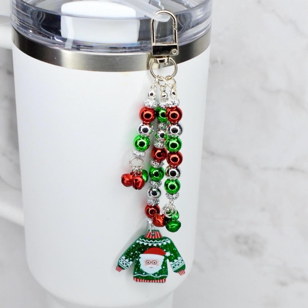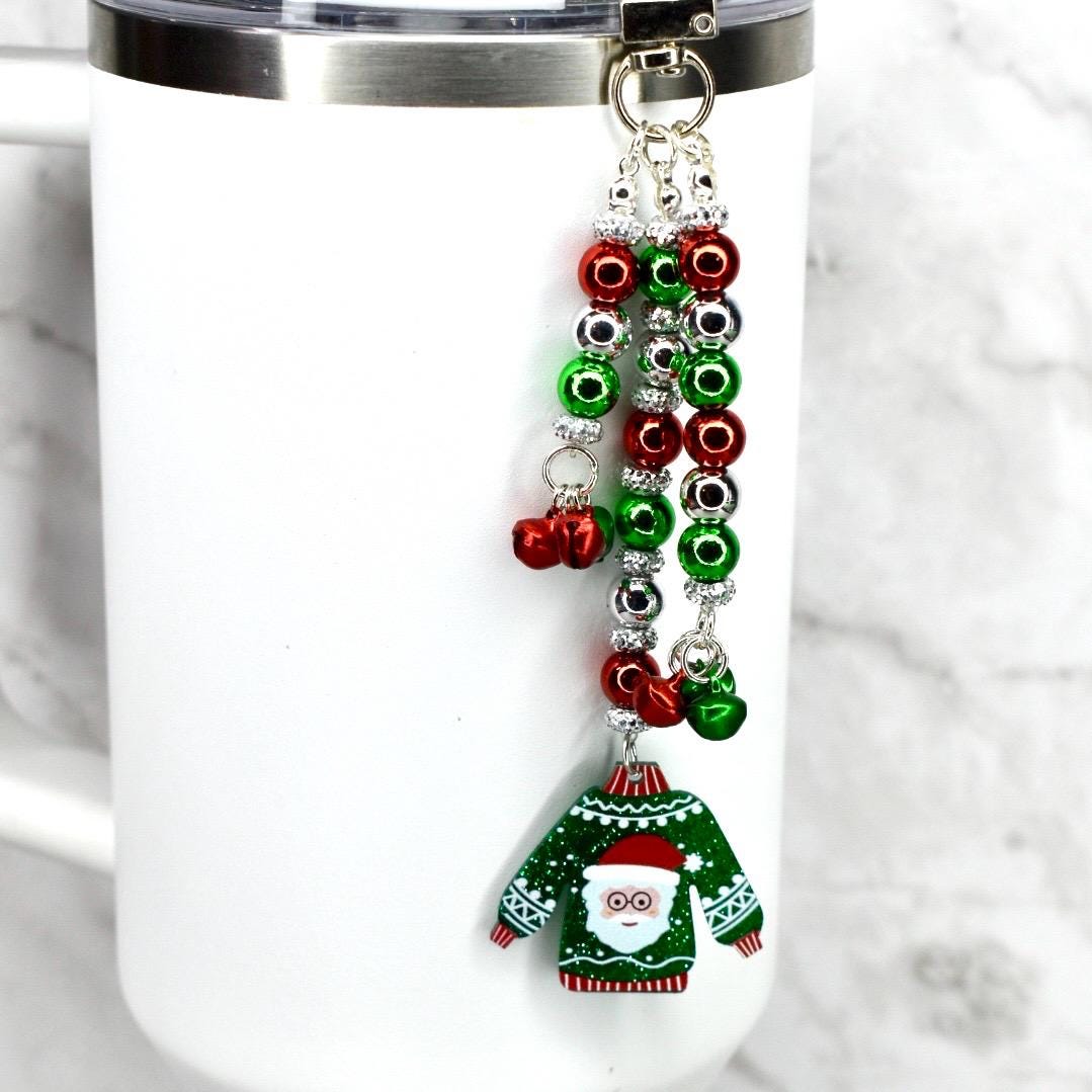 Get into the holiday spirit with this adorable ugly Christmas sweater handle charm! This festive accessory features three strands of classic Christmas beads in red, green, and silver, topped with jingle bells and finished with a darling Santa ugly sweater charm.