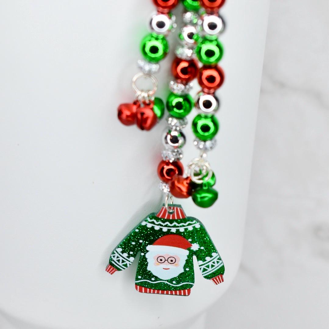 The playful beaded strands showcase shiny metallic red and green beads paired with sparkly silver rhinestone pave balls, plus adorable red and green jingle bells that add a festive sound to every sip. The highlight is the charming enamel Santa ugly sweater pendant complete with snowflakes, Fair Isle patterns, and Santa’s jolly face!