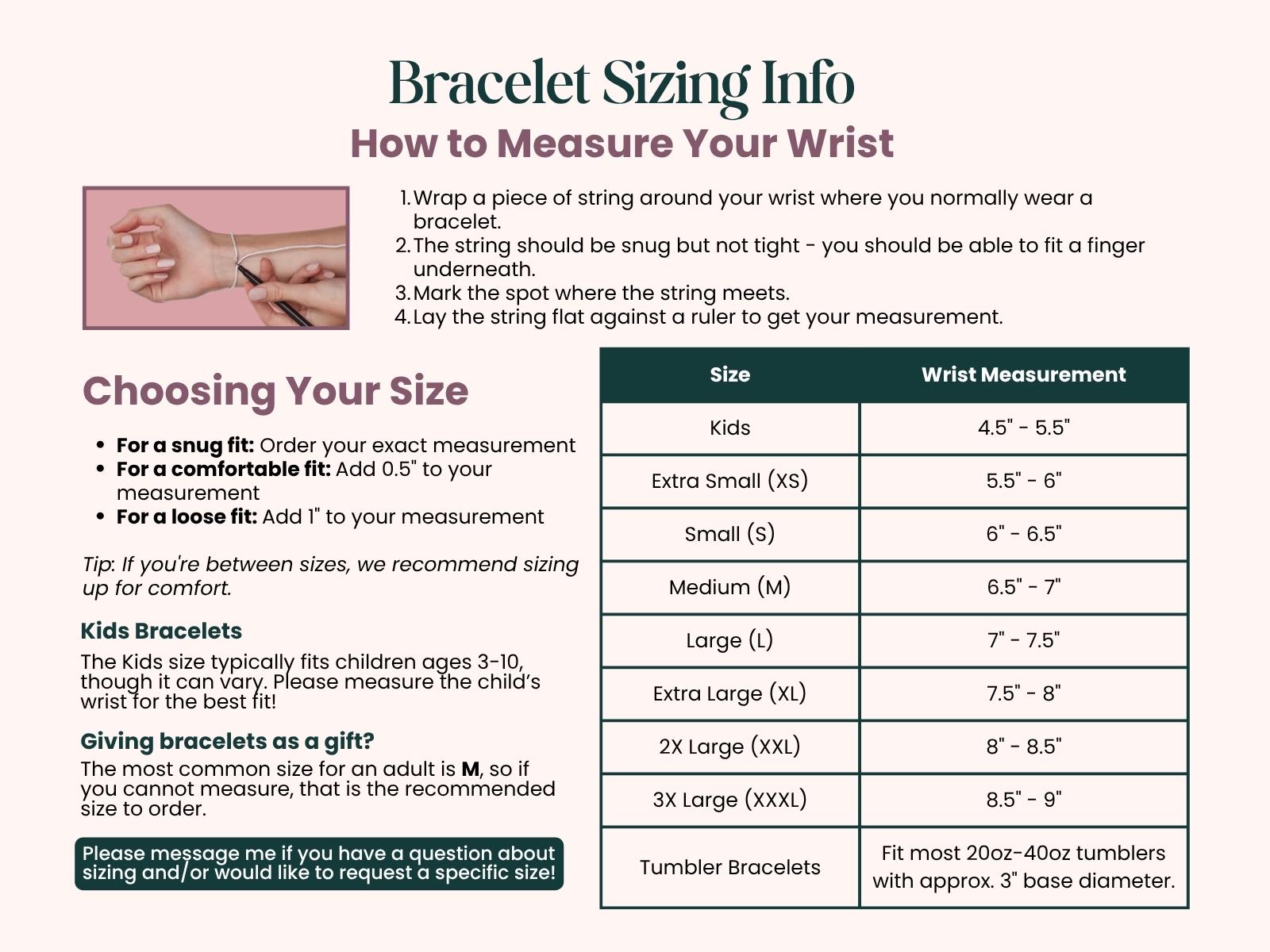 Calathea Collective’s tumbler bracelets are designed to fit the base of cup holder-friendly tumblers with a 3 inch base. If you're unsure about sizing or want to request a custom size, just send me a message—I’m happy to help!
