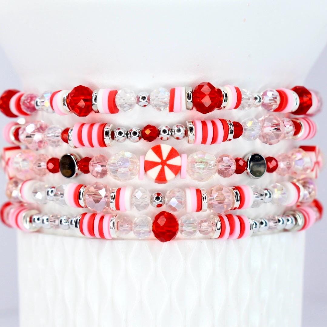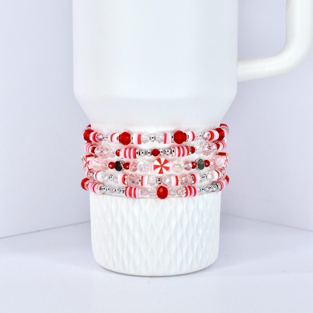 These delightful candy bracelets feature an elastic stretch beaded design with a strawberry twist pattern, perfect as a Christmas accessory for your tumbler or as a holiday wrist charm. Each sweet patterned accessory creates a festive stack that makes for a unique gift or stocking stuffer, combining the playful charm of candy-inspired jewelry with Christmas spirit.