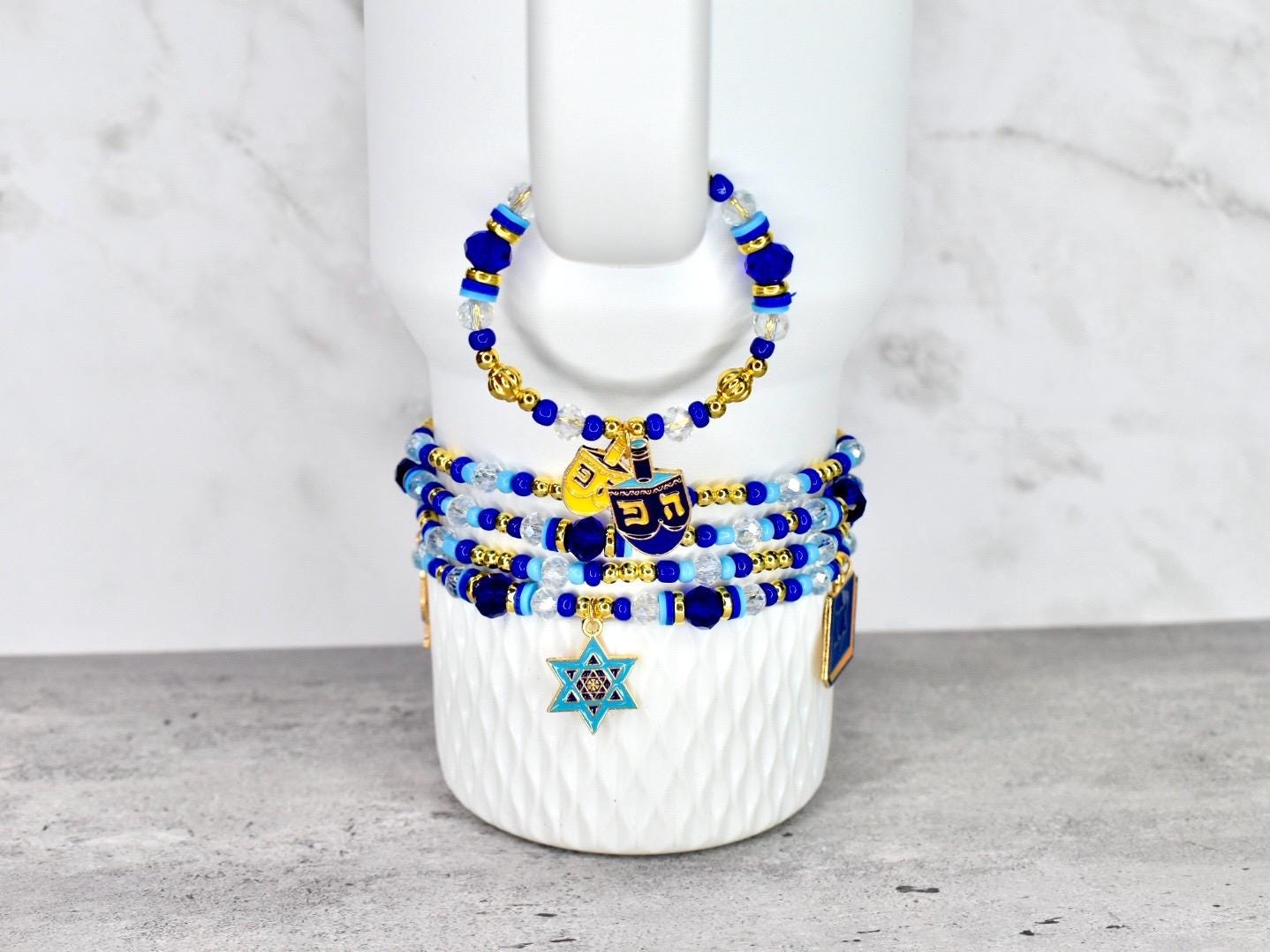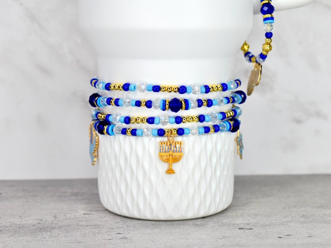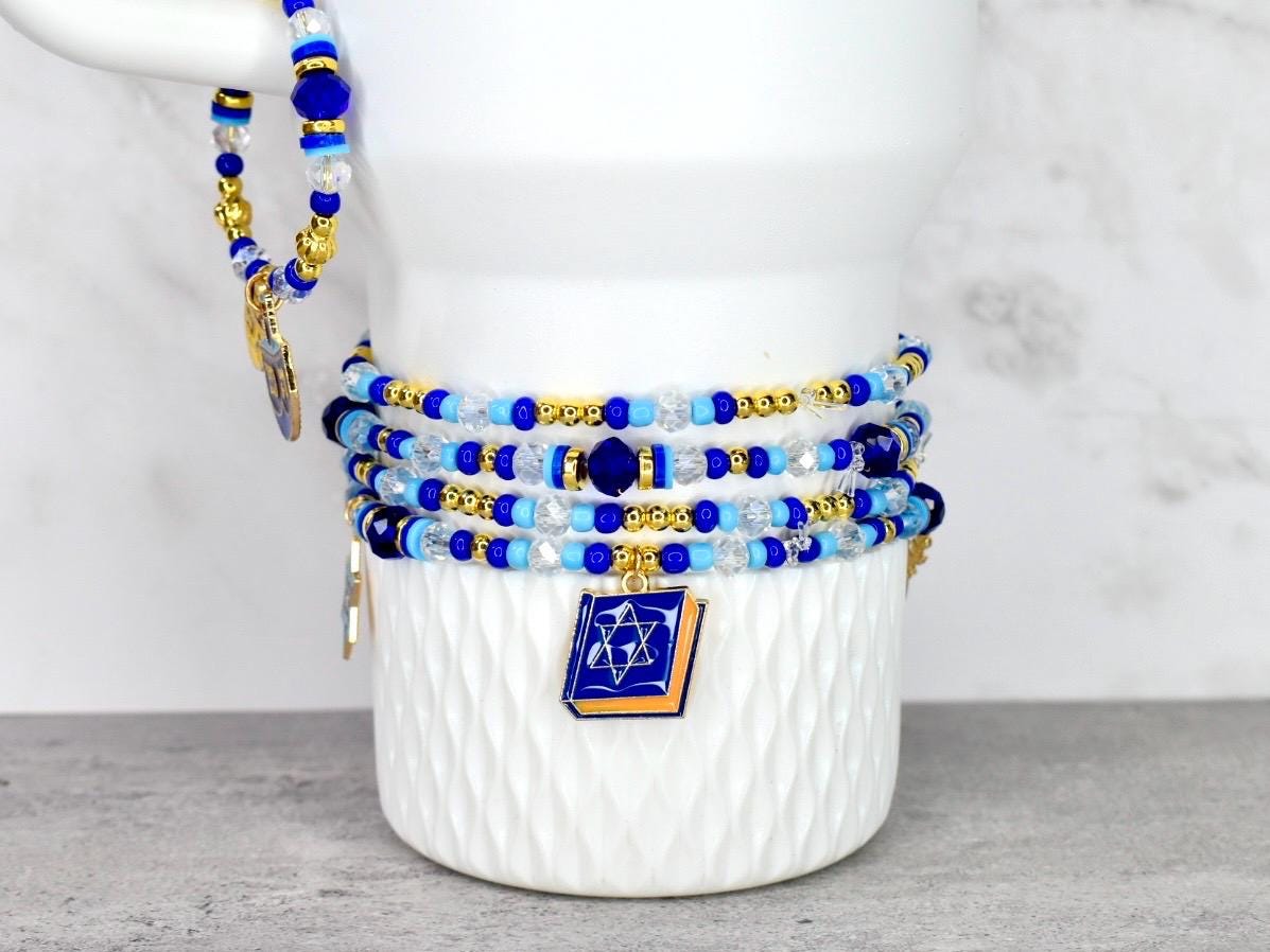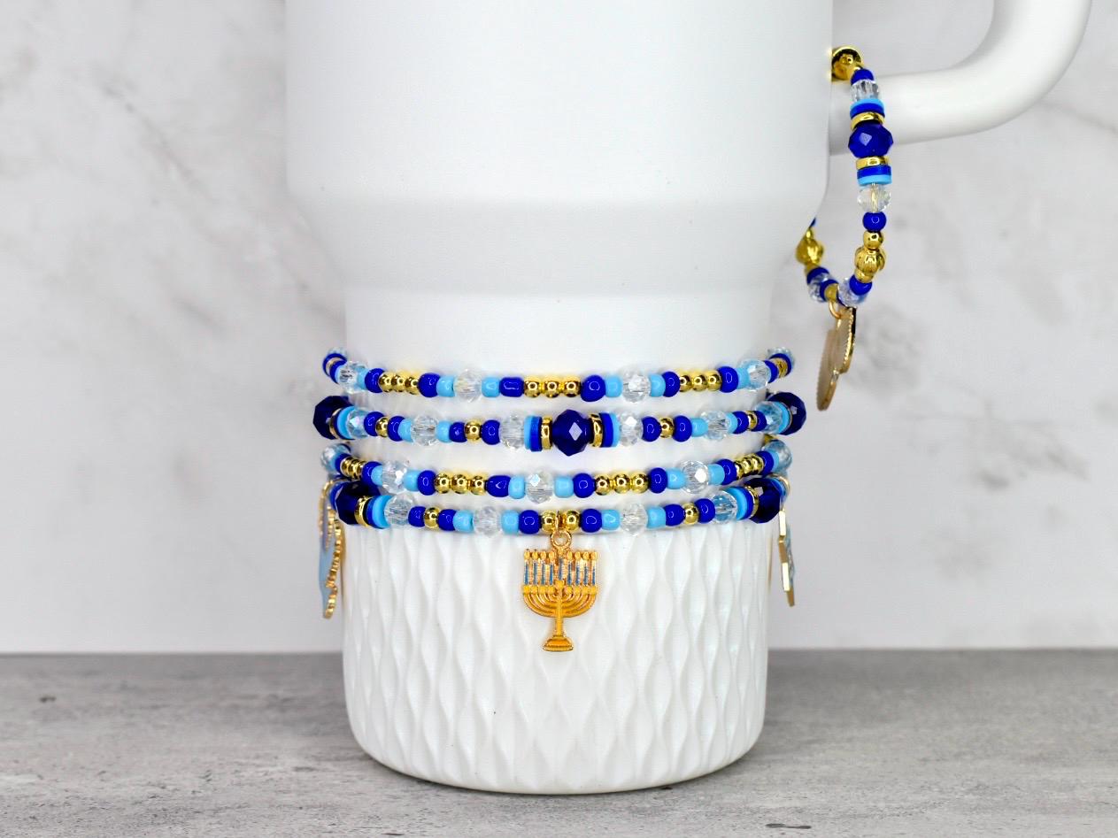 Celebrate the miracle of Hanukkah with this stunning bracelet stack! This 4-piece set of stretchy bracelets features Hanukkah charms surrounded by traditional blue and white beads with elegant gold accents that capture the spirit of the holiday.