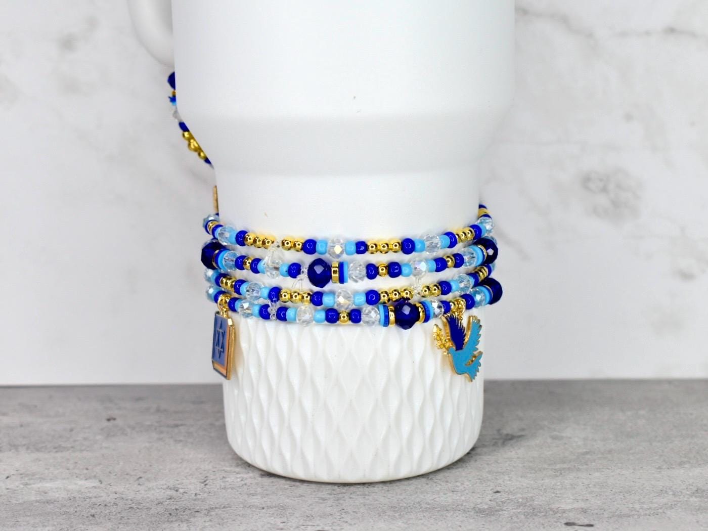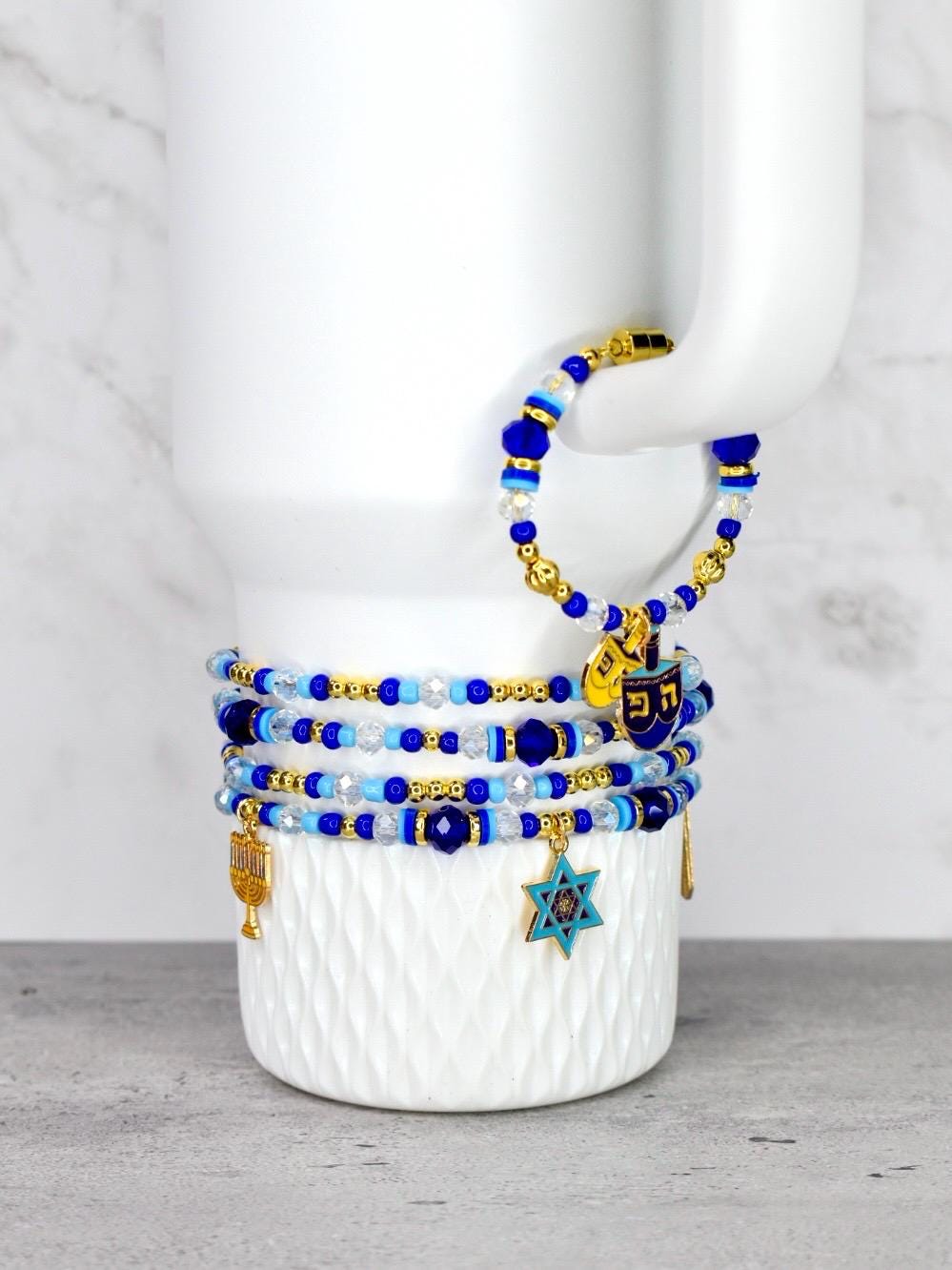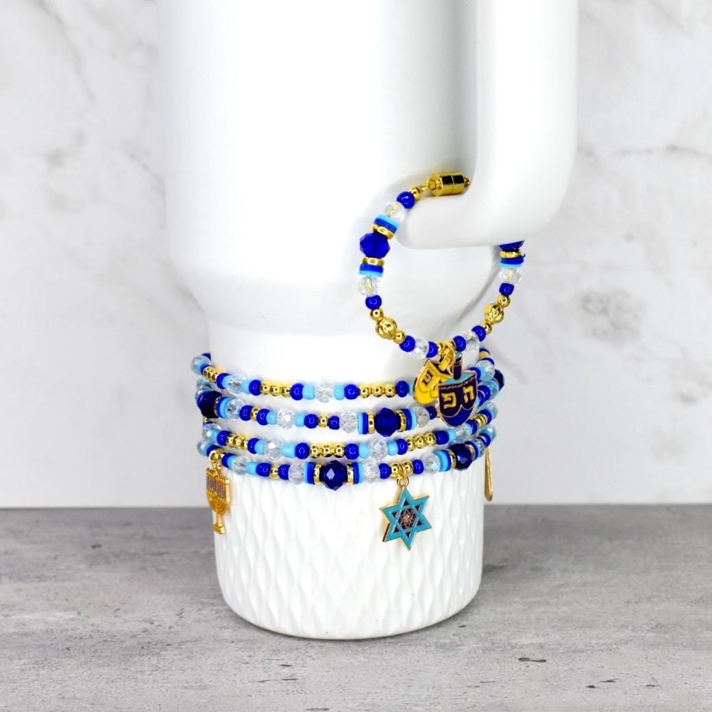 Celebrate the miracle of Hanukkah with this stunning bracelet stack! This 4-piece set of stretchy bracelets features Hanukkah charms surrounded by traditional blue and white beads with elegant gold accents that capture the spirit of the holiday.