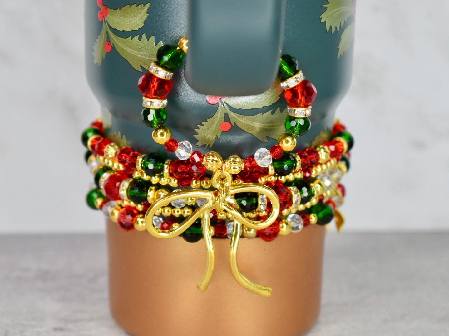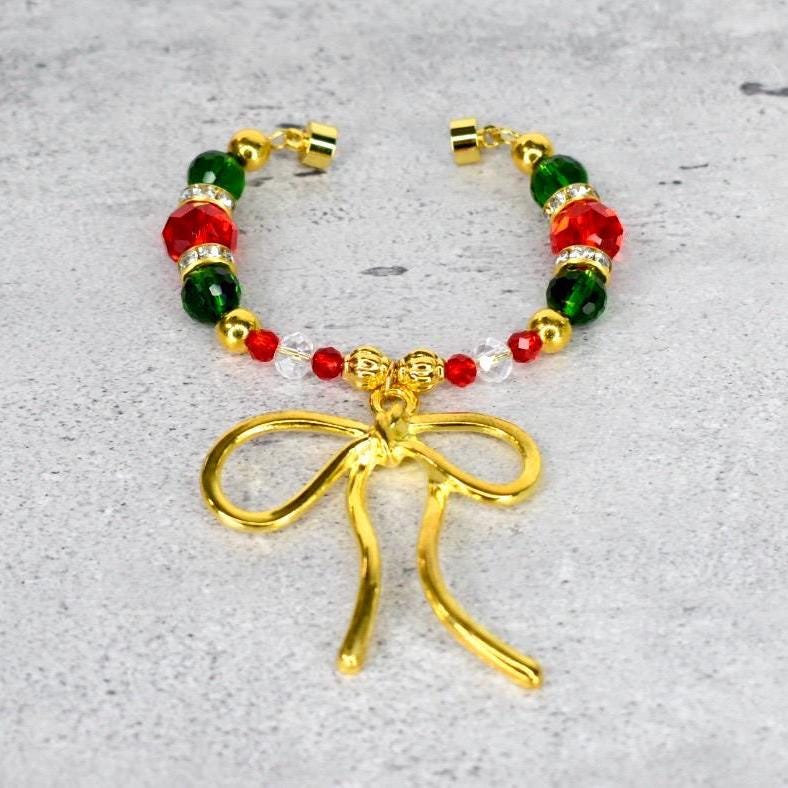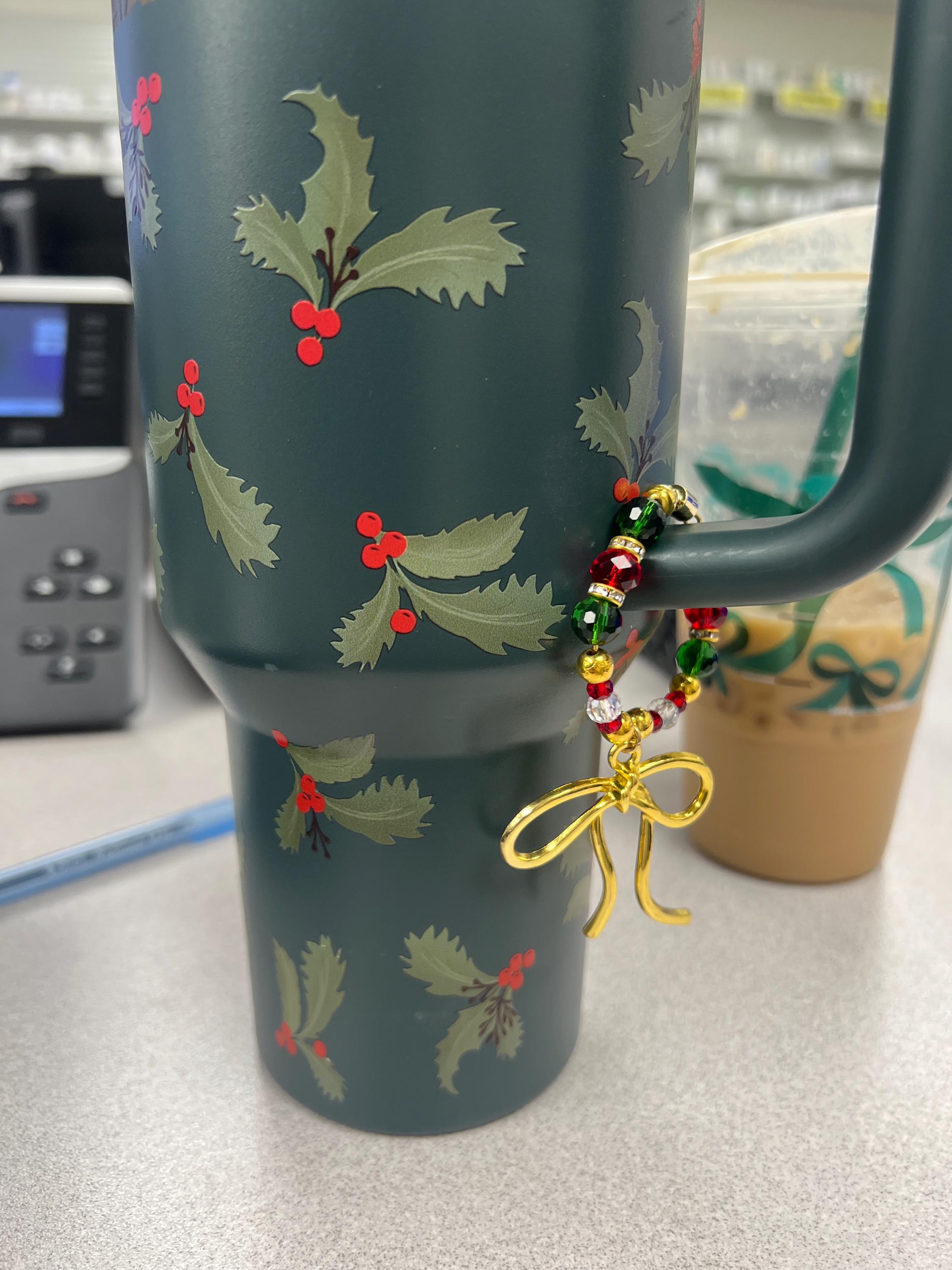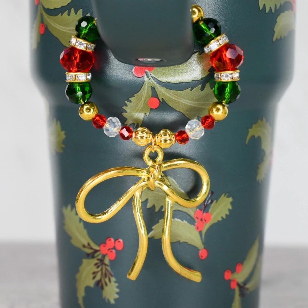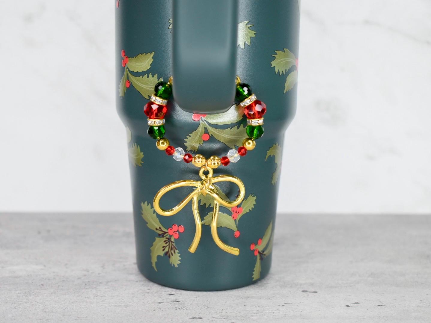 Add a touch of elegance to your favorite tumbler or other handled cup with this festive handle bracelet! Featuring a stunning gold-tone bow charm as the centerpiece, this beautiful accessory transforms any cup into a holiday showpiece.