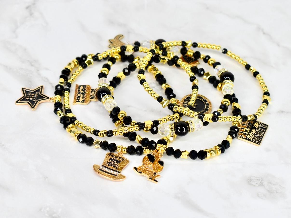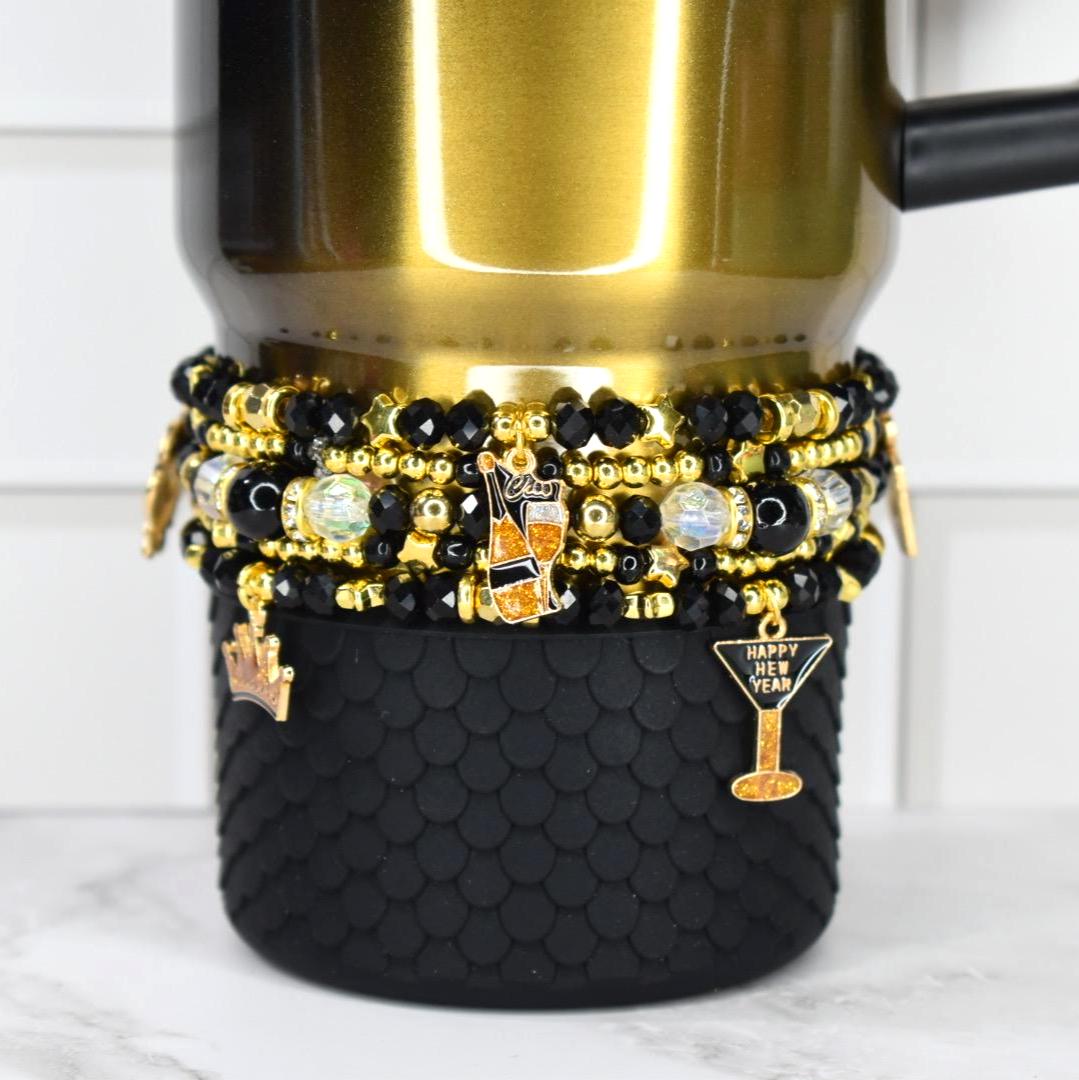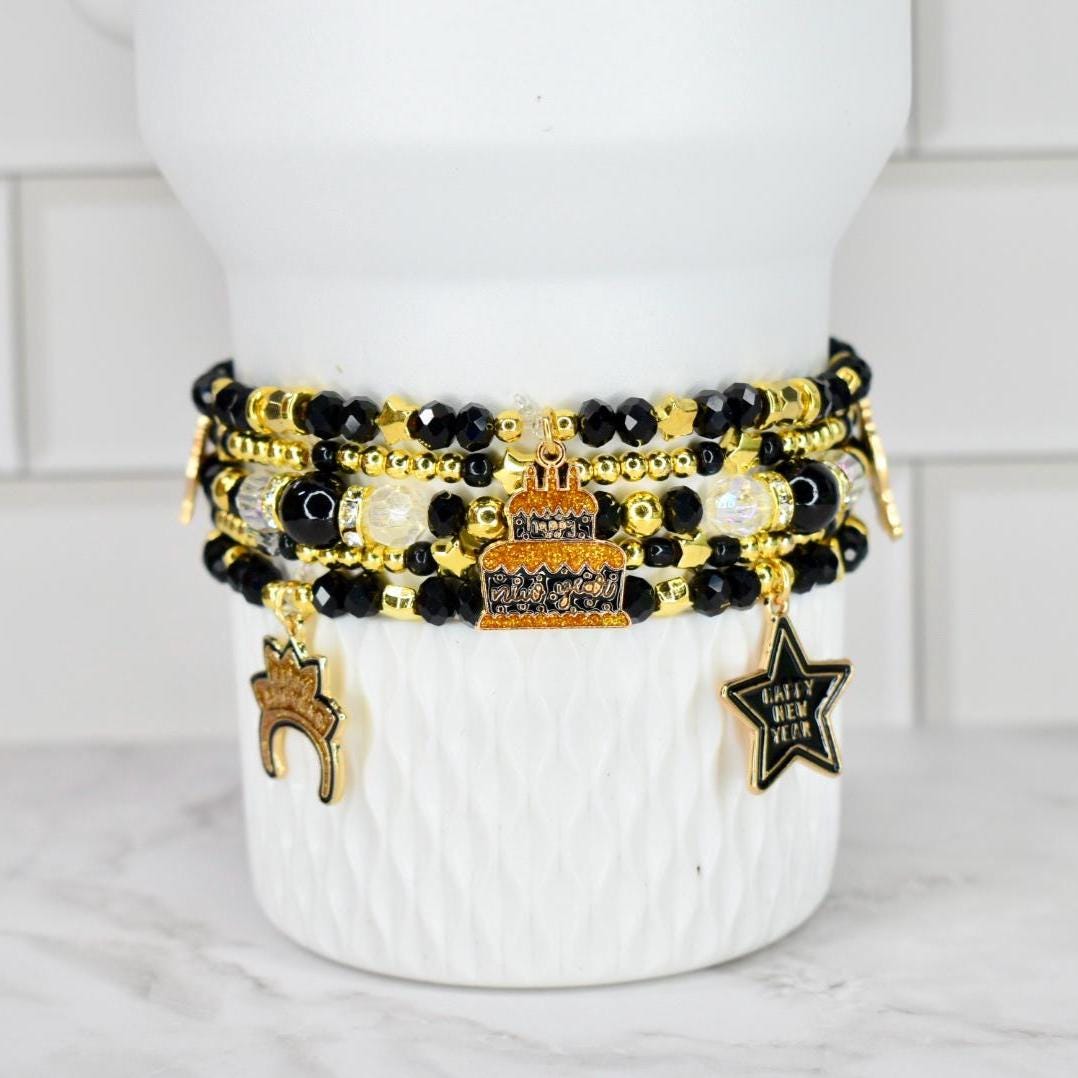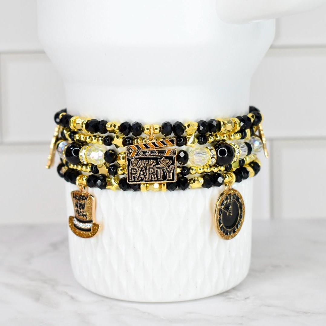 Celebrate the countdown in style with this festive beaded stack, designed to dazzle on your wrist or your favorite tumbler! Whether you're accessorizing your party outfit or adding flair to your drinkware, this versatile stack brings the glam.